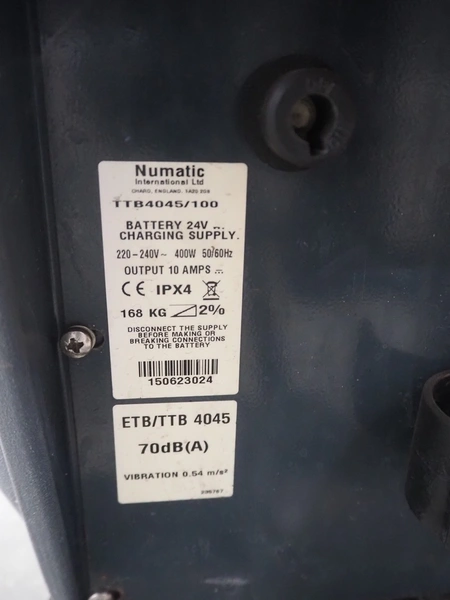 Numatic floor scrubbing machine, type: TTB4045/100, 220-240 V, 50/60 Hz, 10 A, dimensions: 1250 mm x 800 mm x 1150 mm.
