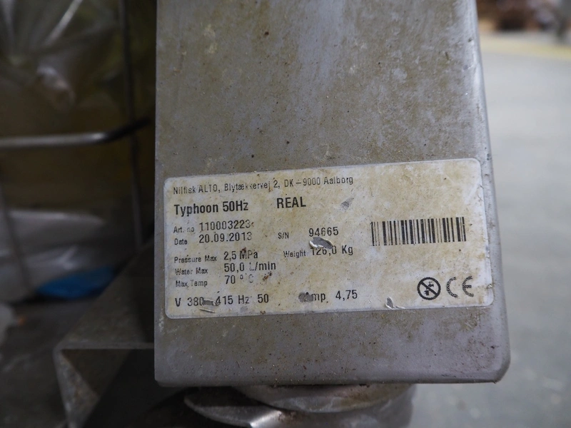Nilfisk mobile high pressure cleaner, model: Typhoon 50HZ, serial number: 94665, year of construction: 20.09.2013, 380 V, 50 Hz, 4.75 A, weight: 126 kg, max temperature: 70 ⁰C, maximum water supply: 50 litres per minute, dimensions: 1450 mm x 600 mm x 1020 mm.