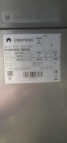 Coldline blast chiller, model: W5UG, serial number: 012001022, 220-240 V, 50 Hz, 5.2 A, 1030 W, refrigerant: R452A/1400 g, 11 floors, dimensions: 710 mm x 700 mm x 860 mm.