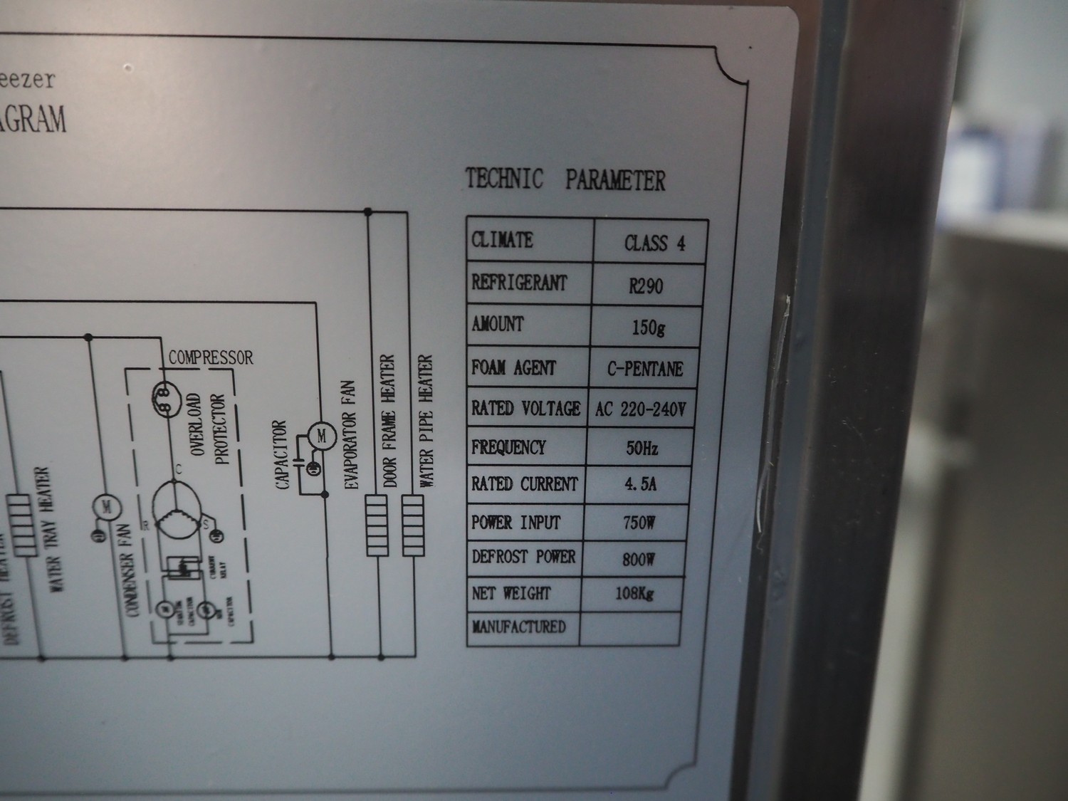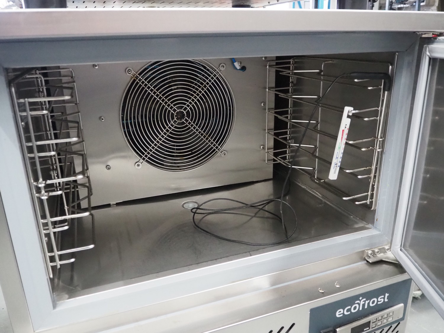 Ecofrost blast chiller, model: 4750.705, serial number: 6530 1525 1908 0706, 220/240 V, 50 Hz, 4.5 A, 750 W, weight: 108 kg, refrigerant: R290/250g, 5 floors, dimensions each floor: 600 mm x 370 mm, total dimensions: 800 mm x 800 mm x 1000 mm.