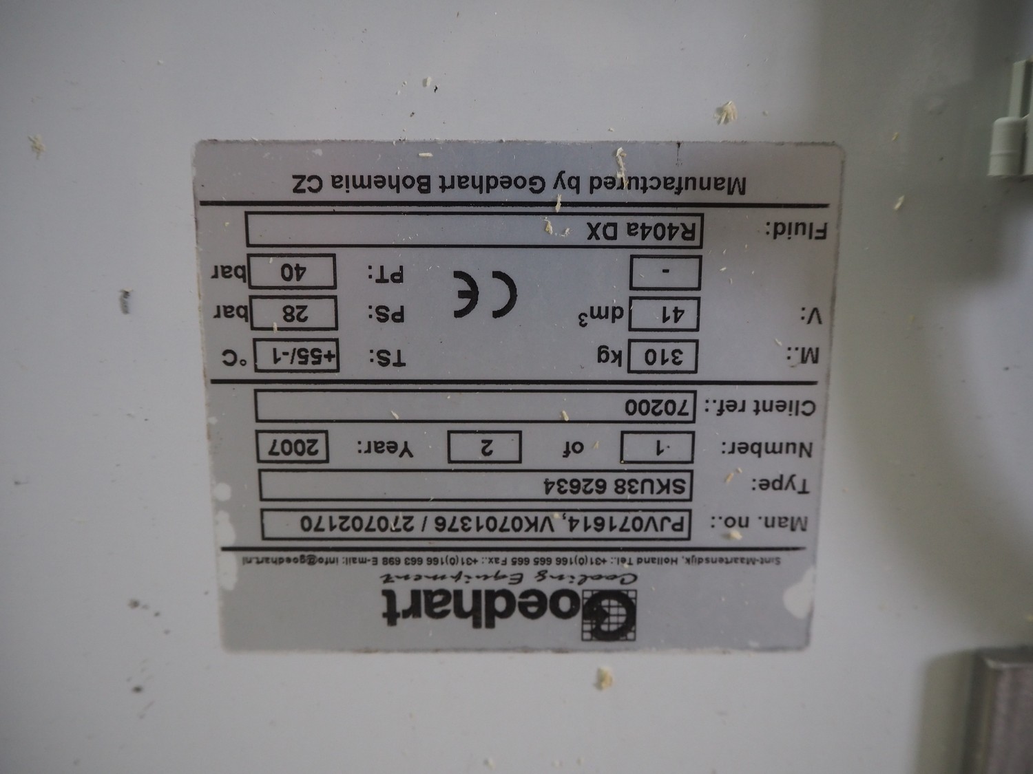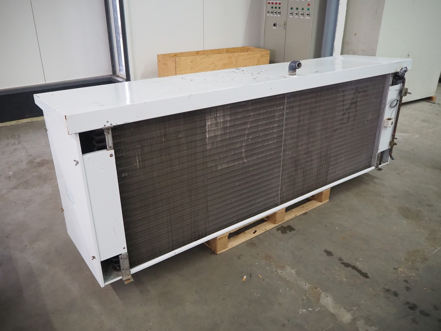 Goedhart evaporator, 2 fans, type: SKU38 62634, manufacturing number: PJV071614. VK0701376/270702170, year of construction: 2007, fluid: R404a, maximum work pressure: 28 bar, working temperature: +55/-1⁰C, volume: 41 dm³, dimensions: 2860 mm x 780 mm x 1250 mm.