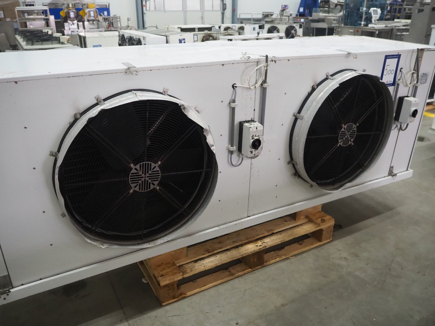 Goedhart evaporator, 2 fans, type: SKU38 62634, manufacturing number: PJV071614. VK0701376/270702170, year of construction: 2007, fluid: R404a, maximum work pressure: 28 bar, working temperature: +55/-1⁰C, volume: 41 dm³, dimensions: 2860 mm x 850 mm x 1100 mm.