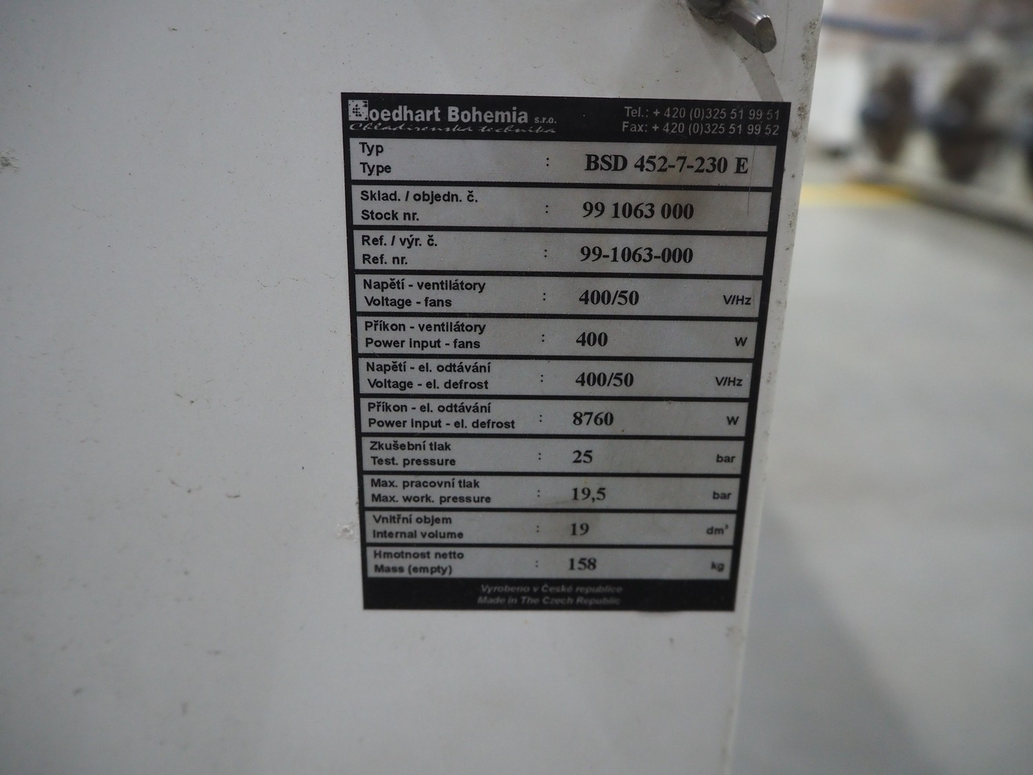 Goedhart Bohemia evaporator, 2 fans, type: BSD 452-7-230 E, number: 99 1063 000, 400 V, 50 Hz, 8760 W, maximum work pressure: 19.5 bar, weight: 158 kg, dimensions: 2200 mm x 1050 mm x 550 mm.