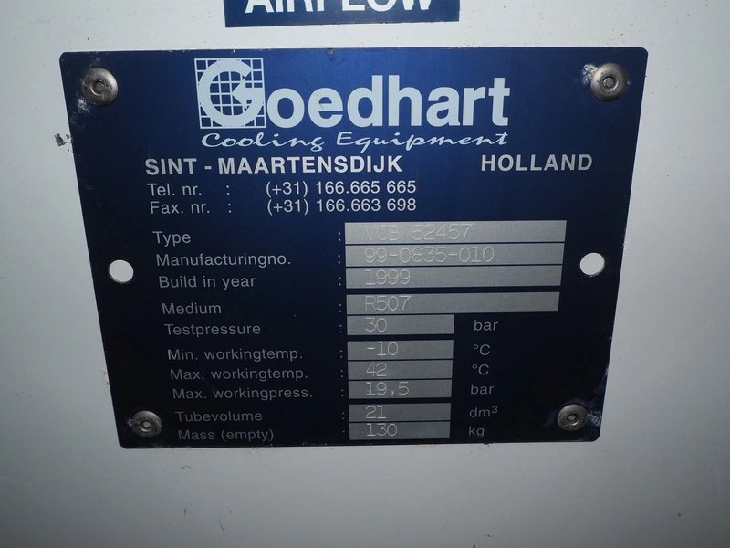 Goedhart evaporator, 2 fans, type: VCB 52457, manufacturing number: 99-0835-010, year of construction: 1999, maximum working temperature: -10/42 ⁰C, maximum working pressure: 19.5 bar, volume: 21 dm³, weight: 130 kg, dimensions: 2050 mm x 850 mm x 750 mm.
