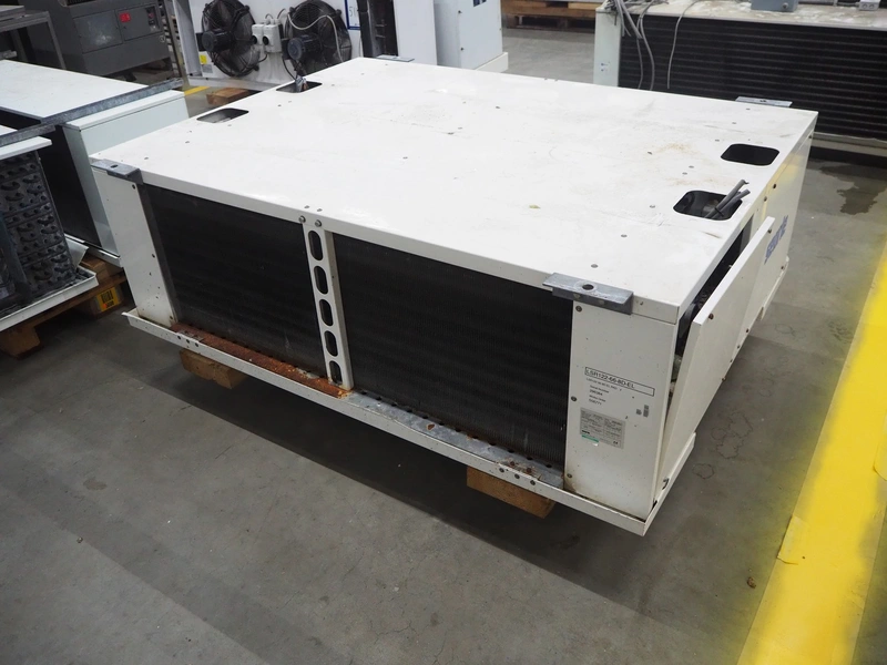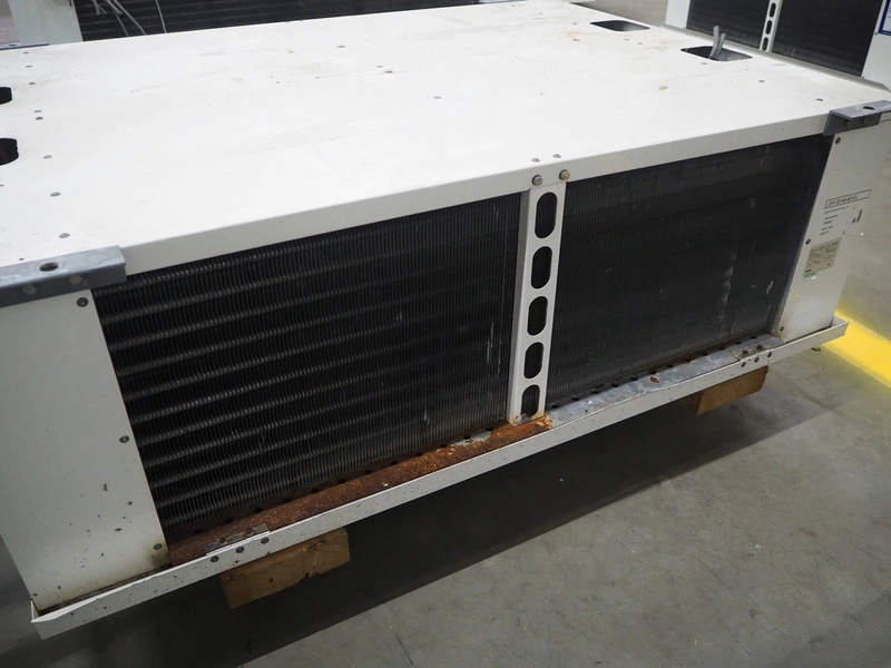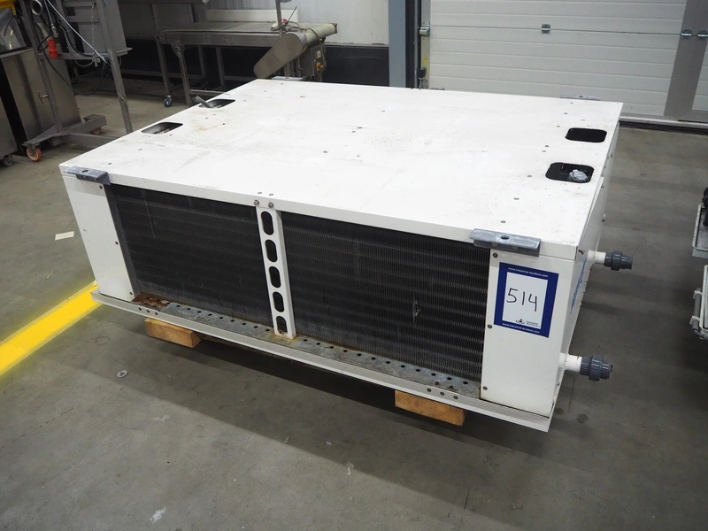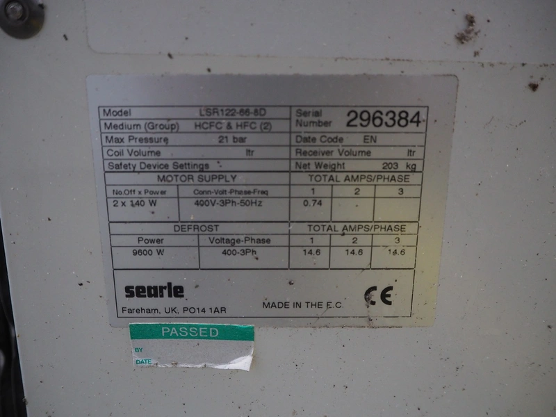 Searle evaporator, 2 fans, model: LSR122-66-8D, serial number: 296384, 400 V, 3 Ph, 50 Hz, maximum pressure: 21 bar, weight: 203 kg, dimensions: 1900 mm x 1400 mm x 800 mm.