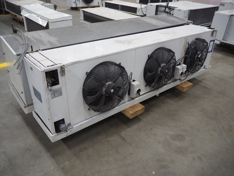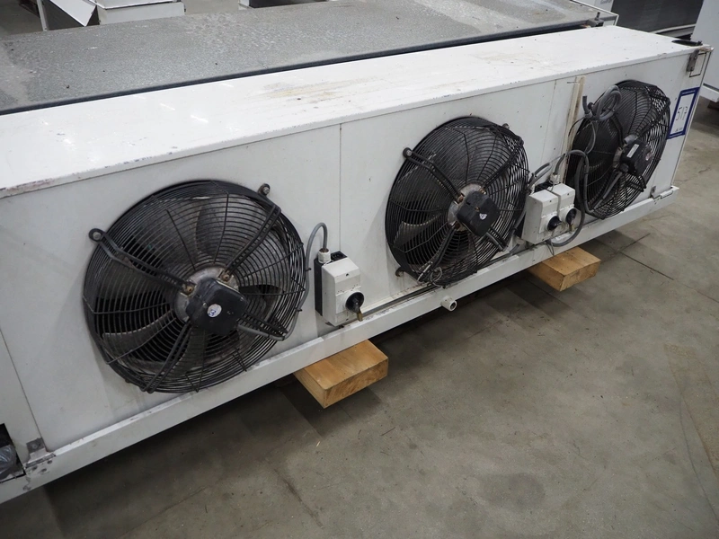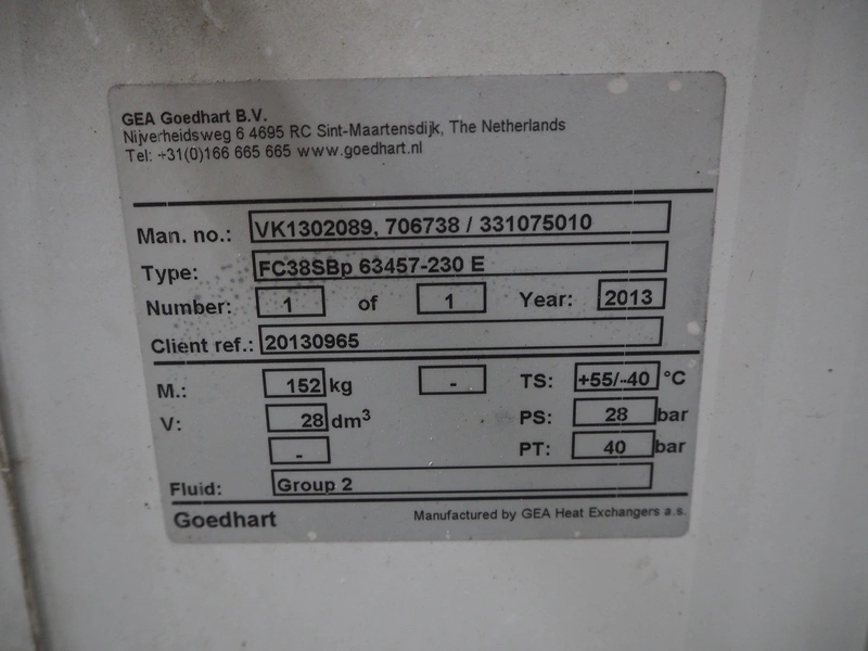 GEA Goedhart B.V. evaporator, 3 fans, type: FC38SBp 63457-230 E, manufacturing number: VK1302089. 706738/331075010, year of construction: 2013, maximum work pressure: 28 bar, working temperature: +55/-40 ⁰C, volume: 28 dm³, dimensions: 2700 mm x 650 mm x 700 mm.