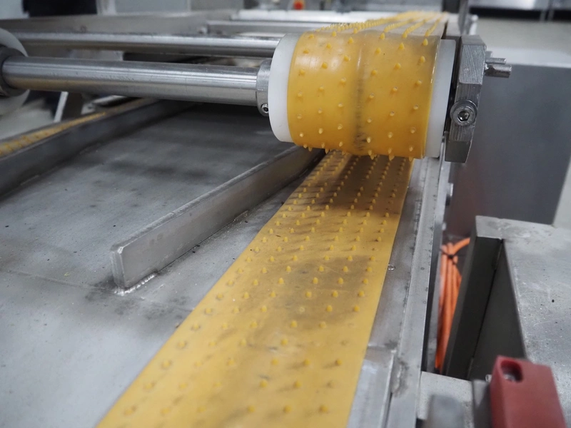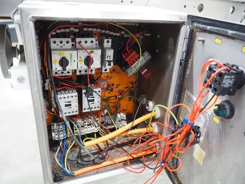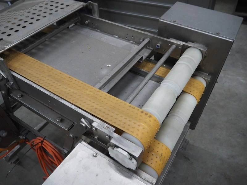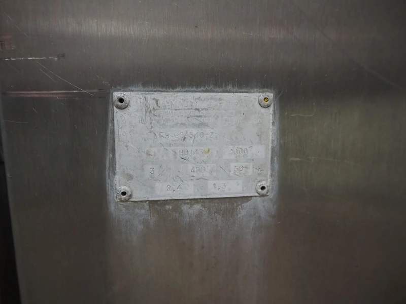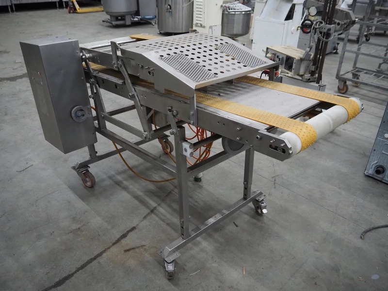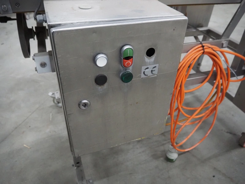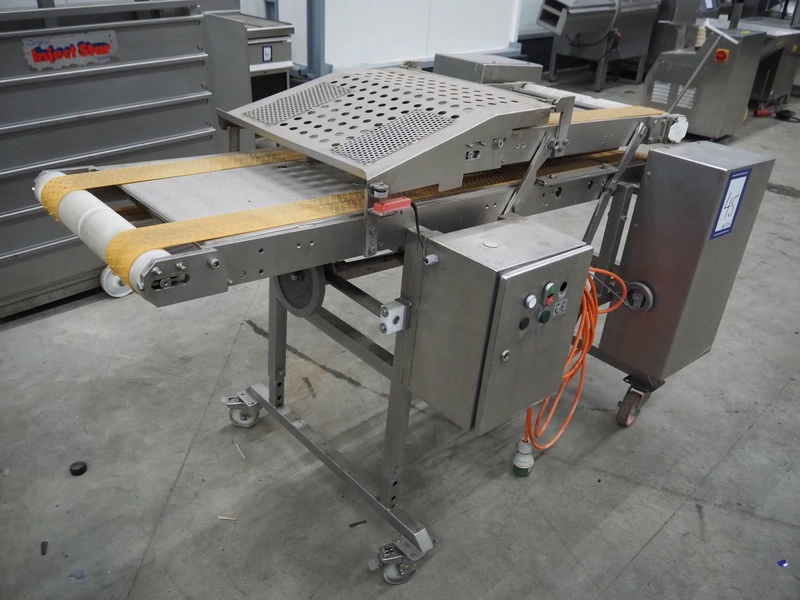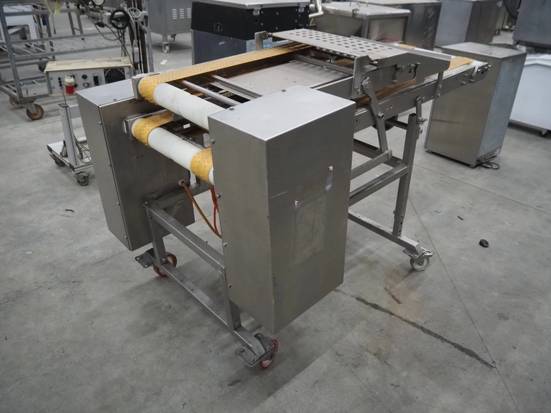 Maja Maschinenfabrik mobile slicer for cordon blue, type: FS 90-540-2, serial number: H0143, year of construction: 2000, 400 V, 3 Ph, 50 Hz, 2.4 A, 1.3 kW, plastic belt, belt width: (2x) 100 mm, total dimensions: 1800 mm x 1100 mm x 1150 mm. Missing knives and one of the belts is missing.