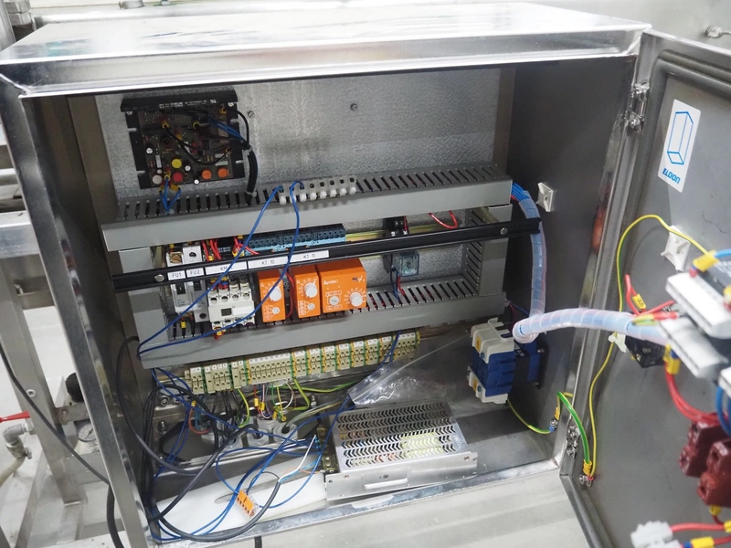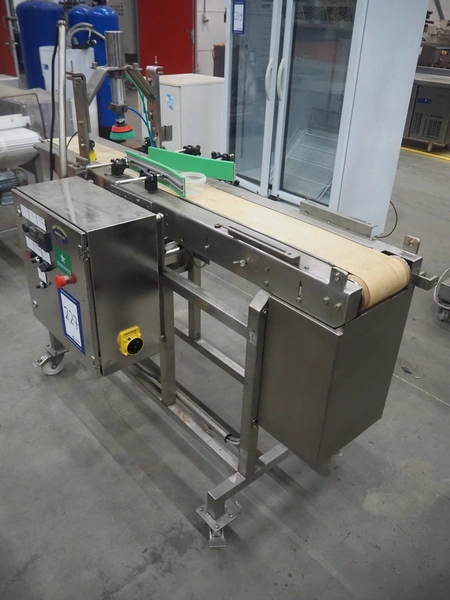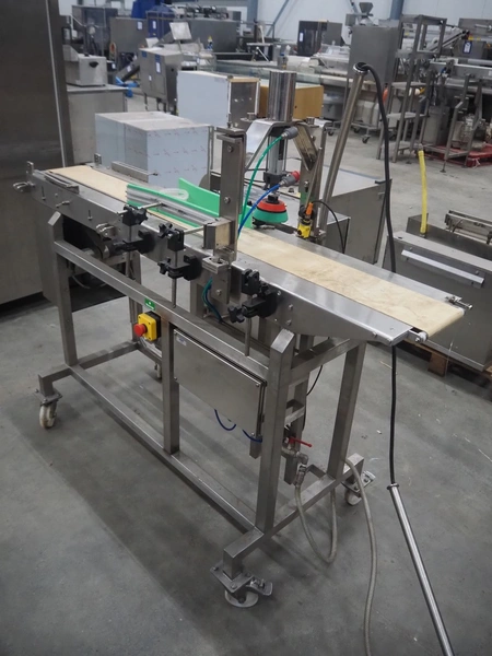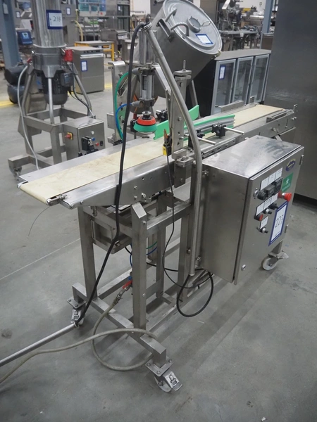 Mobile lid closing machine, s/s frame, plastic belt, belt width: 150 mm, diameter press: 90 mm, total dimensions: 1750 mm x 700 mm x 1400 mm.