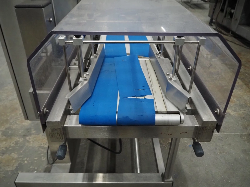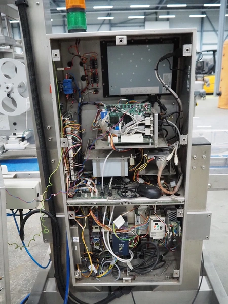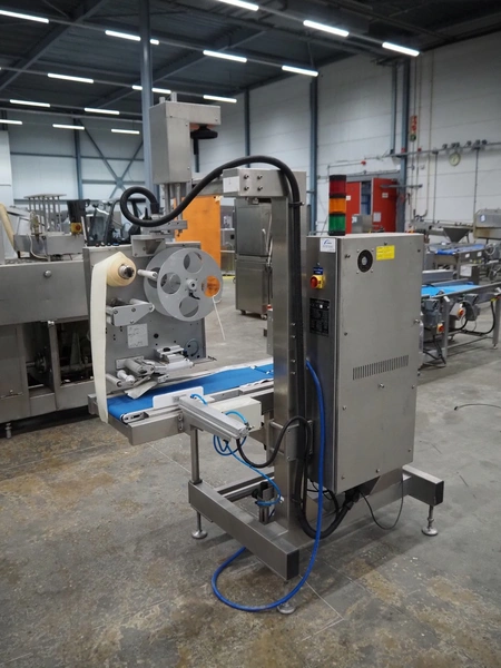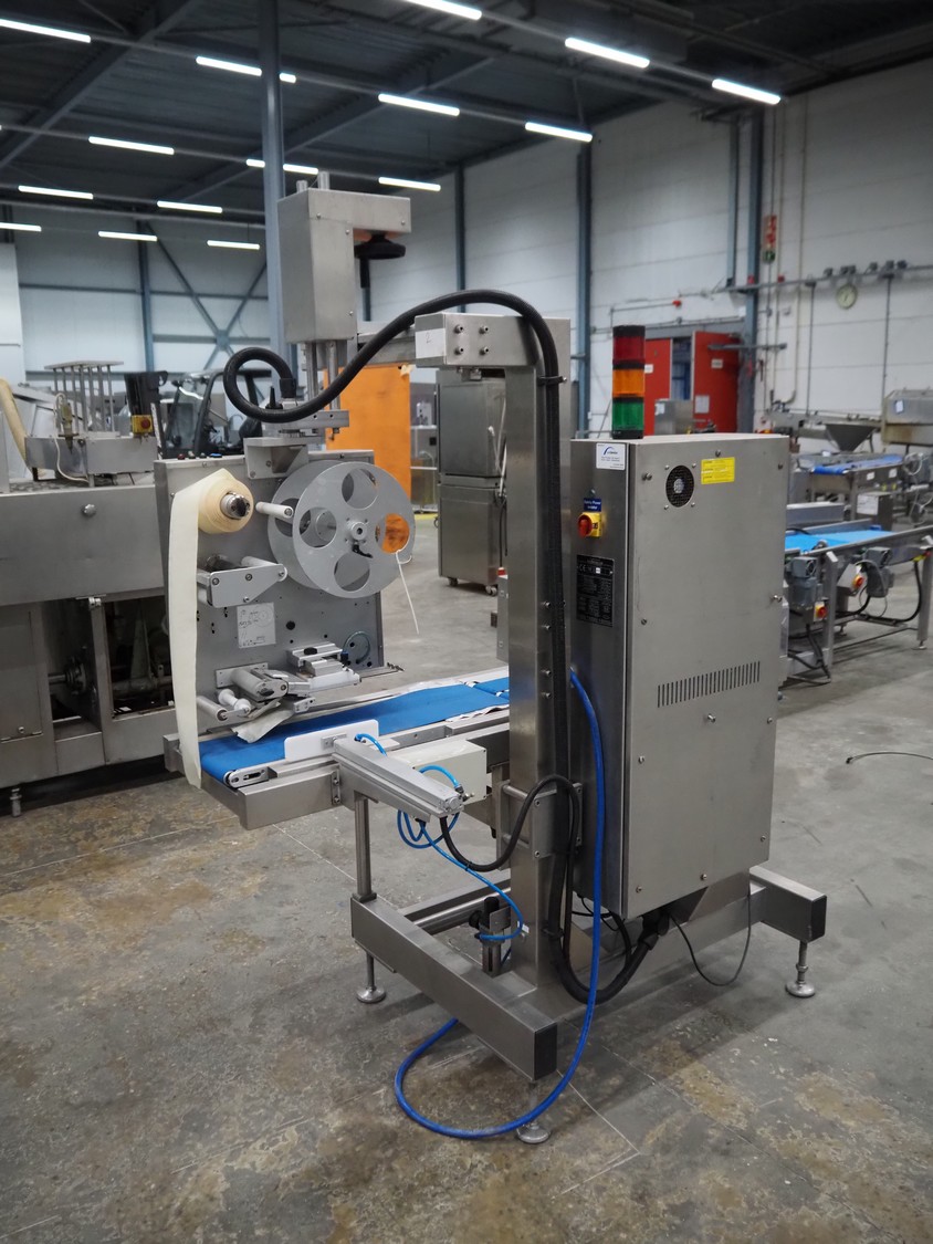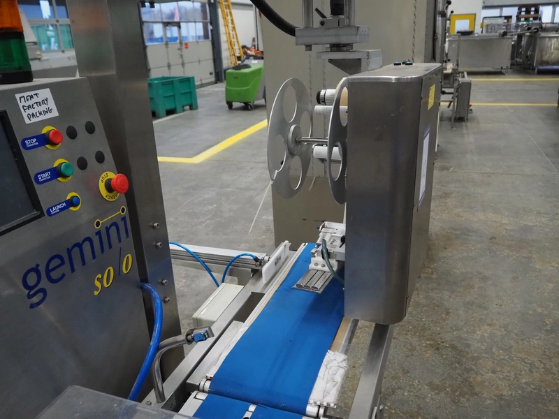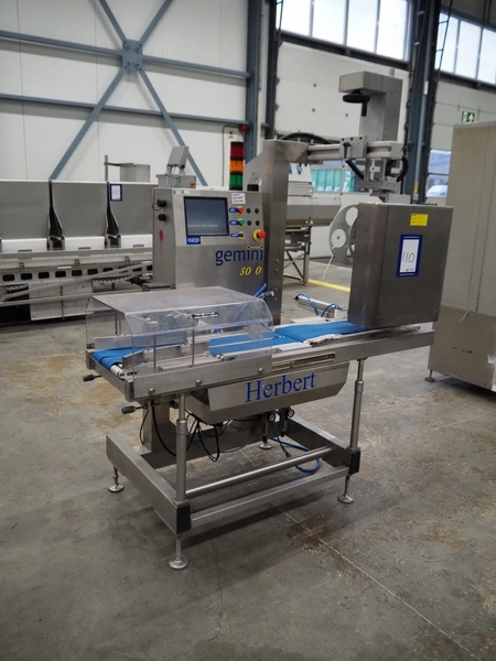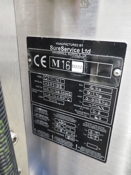 SureService Ltd weighing and labelling machine, model: GEMINI, serial number: HS85195, 230 V, 1 Ph, 50 Hz, 1.3/0.4 A, maximum weight: 4 kg, minimum weight: 0.1 kg, e=d= 0.002 kg, 60 packs per minute, plastic belt, belt width: 230 mm and (2x) 100 mm, total dimensions: 1700 mm x 800 mm x 2100 mm.