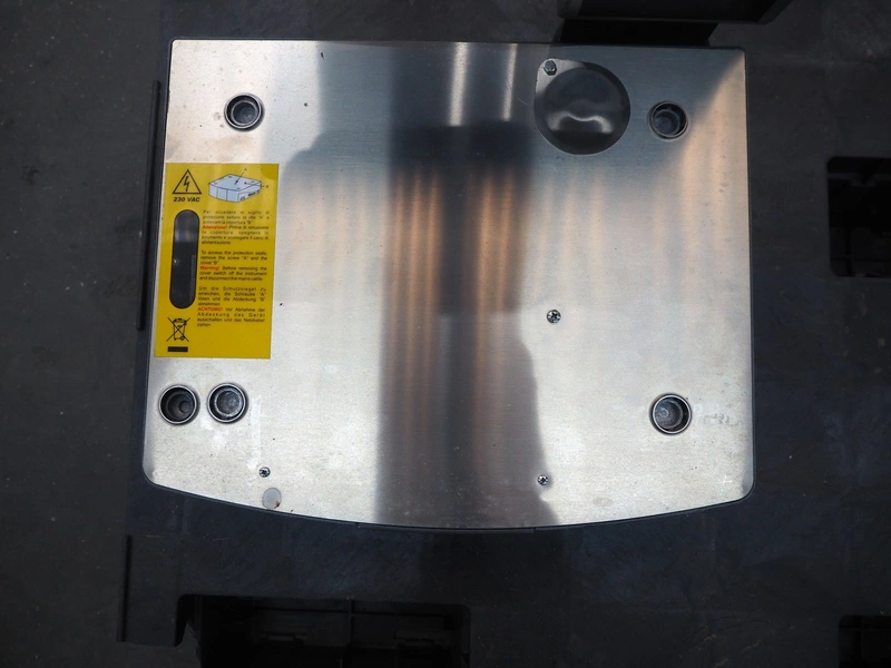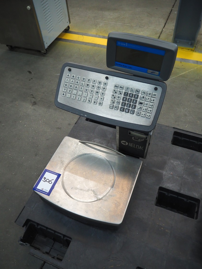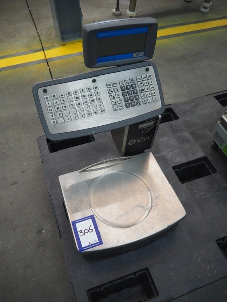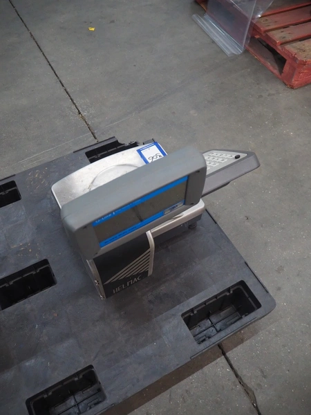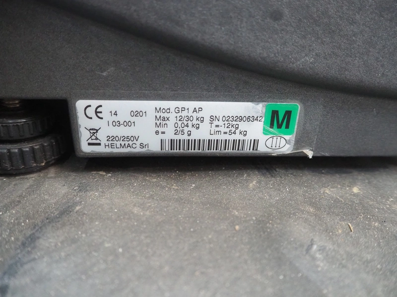Helmac Srl weighing scale with label printer, model: GP1 AP, serial number: 0232906342, 220/250 V, maximum weight: 12/30 kg, minimum weight: 0.04 kg, e= 2/5 kg, T= -12 kg, Lim: 54 kg, dimensions: 440 mm x 370 mm x 560 mm.