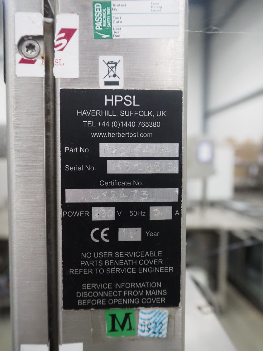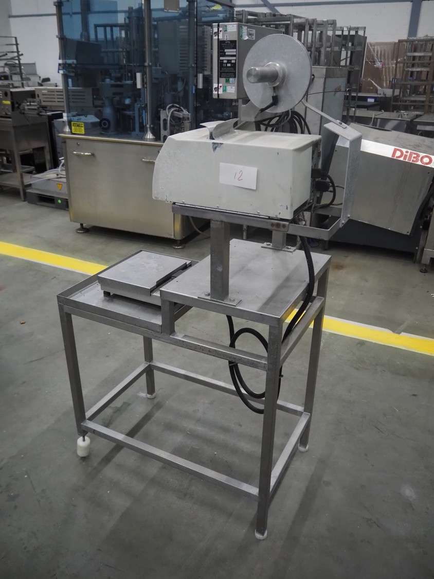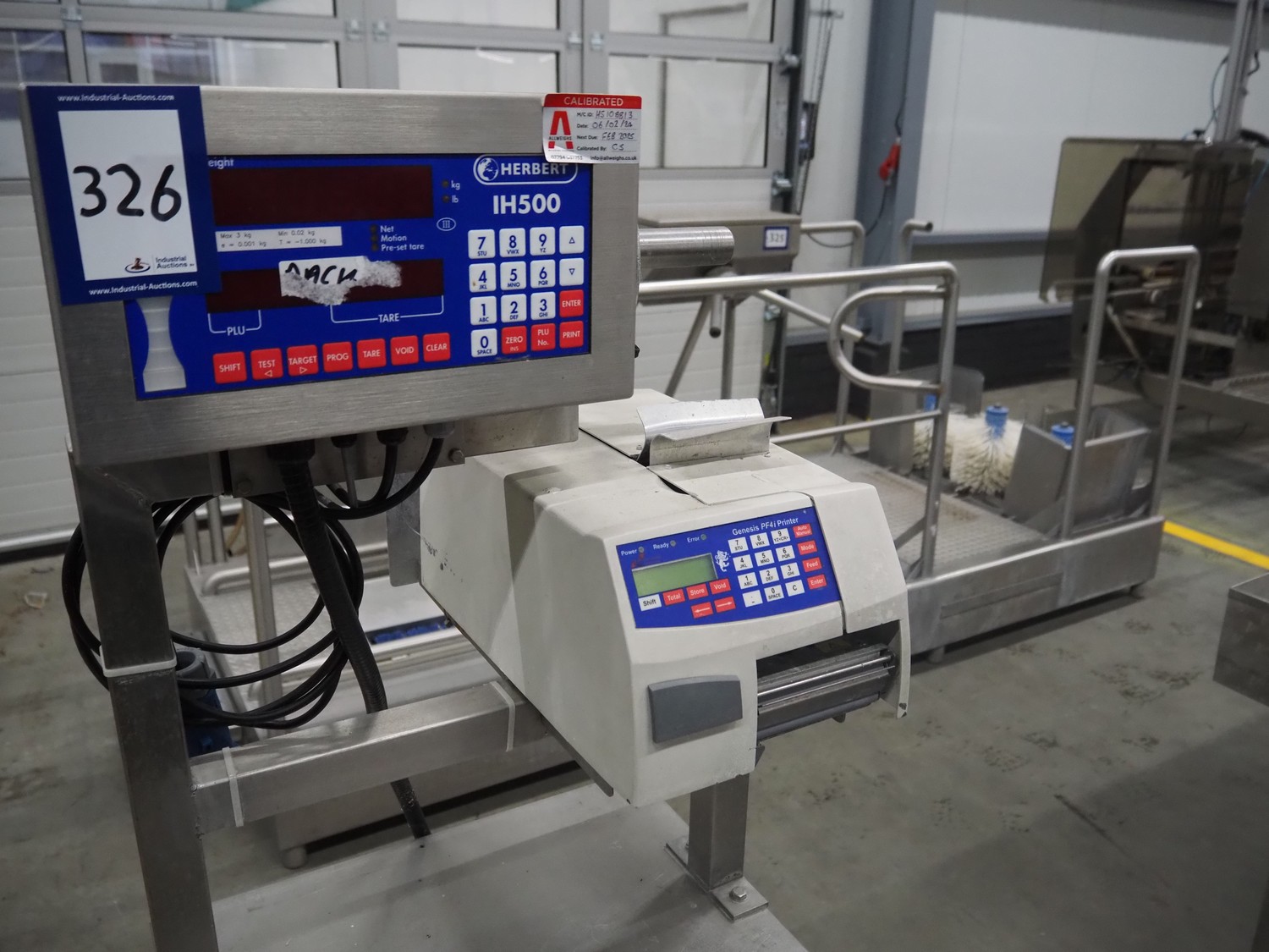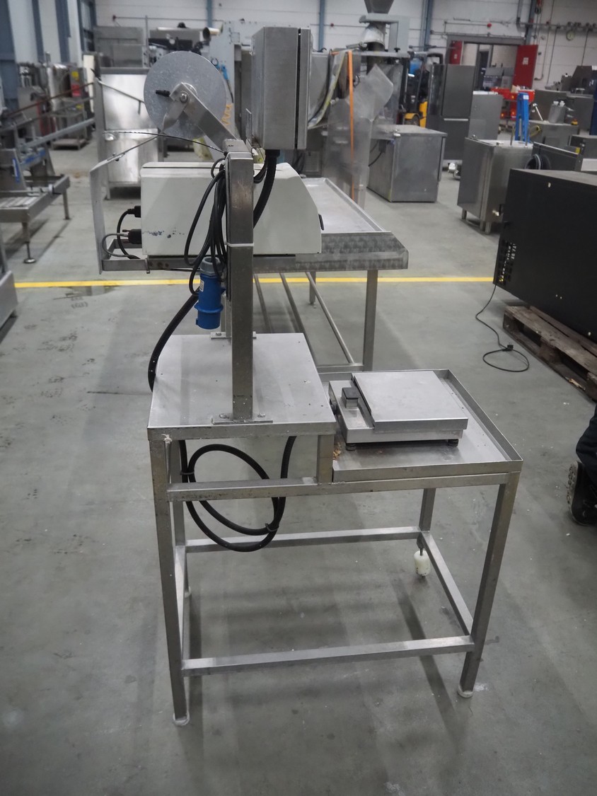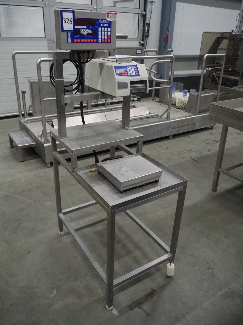 Herbert weighing machine with labeller, type: IH500, maximum: 3 kg, minimum weight: 0.02 kg, e= 0.001 kg, T = -1.000 kg, dimensions: 900 mm x 550 mm x 1600 mm.
