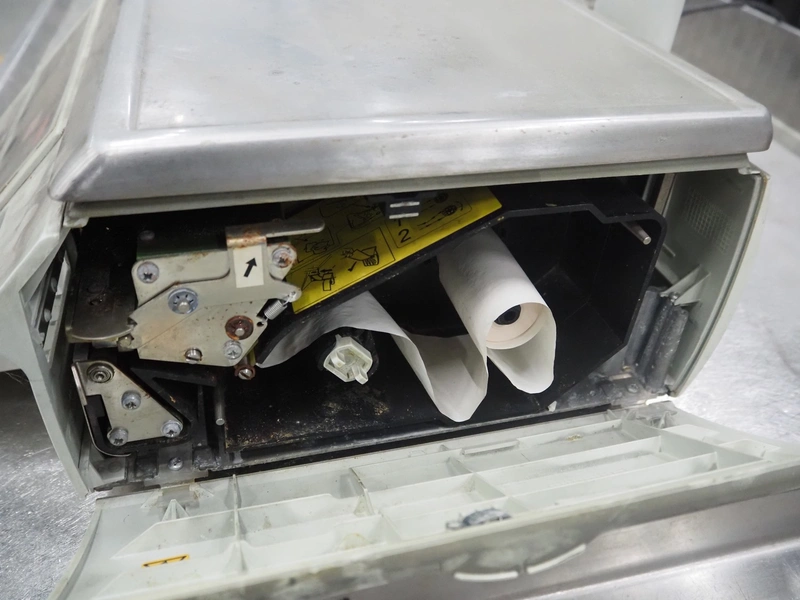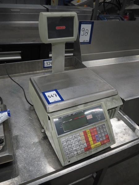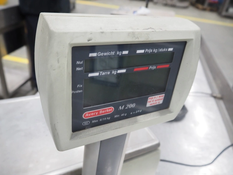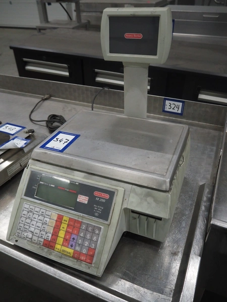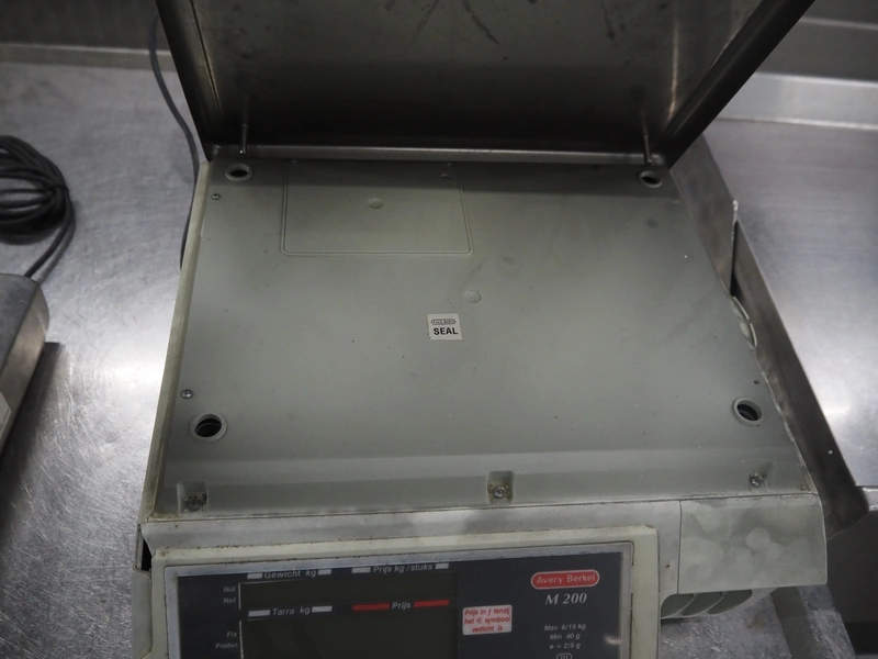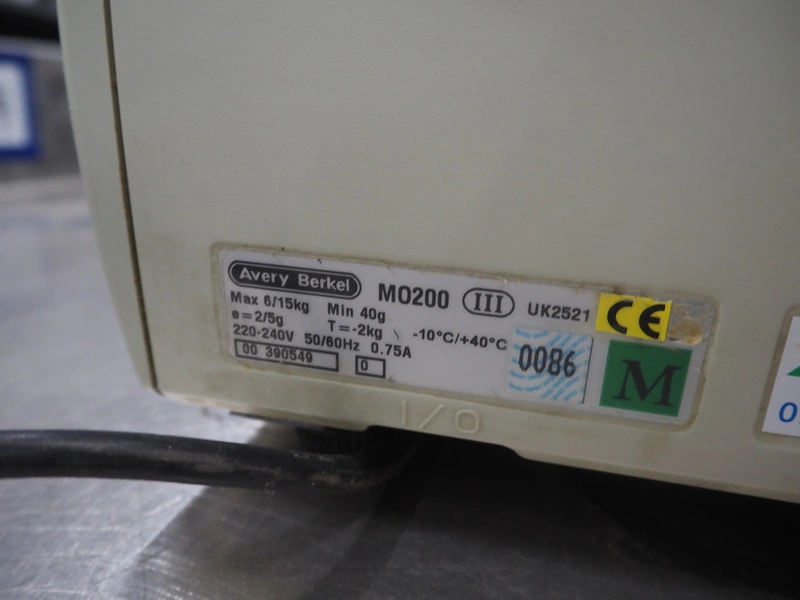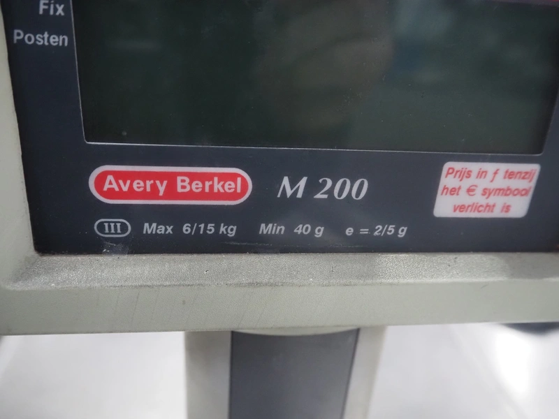 Avery Berkel weighing scale with indicator and label printer, model: MO200, 220-240 V, 50/60 Hz, 0.75 A, maximum weight: 6/15 kg, minimum weight: 40 gram, e = 2/5 gram, T = -2 kg, dimensions scale: 350 mm x 250 mm, total dimensions: 470 mm x 400 mm x 610 mm.