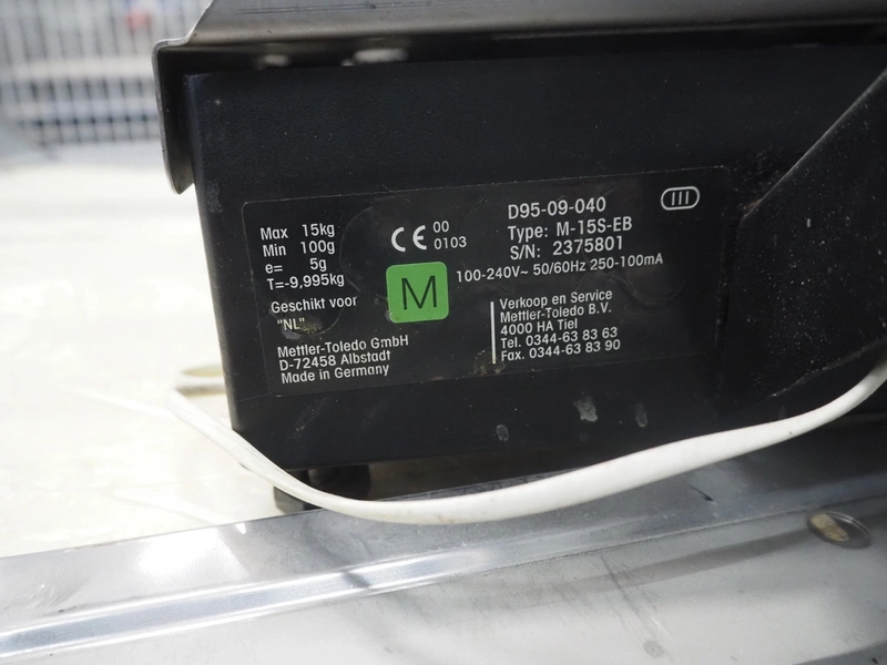 Mettler-Toledo GmbH weighing scale with label printer, type: M-15S-EB, serial number: 2375801, 100-240 V, 50/60 Hz, maximum weight: 15 kg, minimum weight: 100 gram, e= 5 gram, T- -9,995 kg, dimensions: 400 mm x 350 mm x 520 mm.