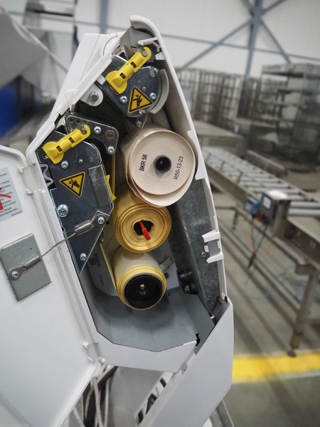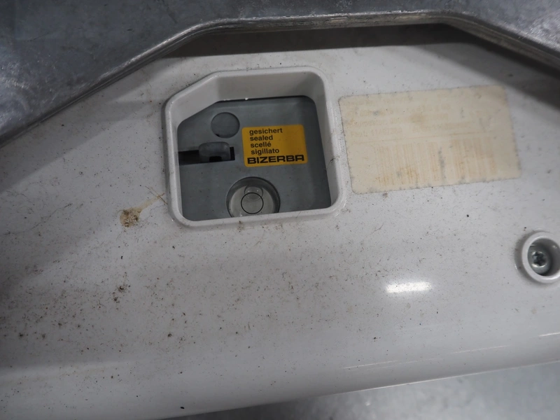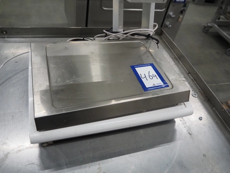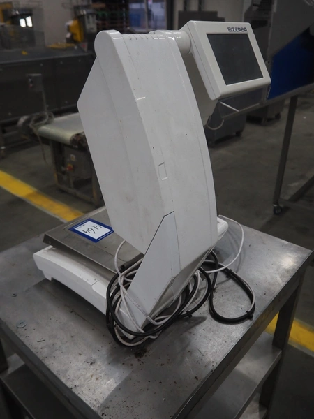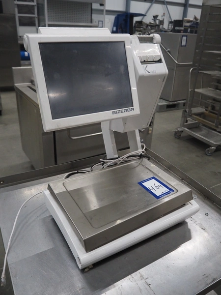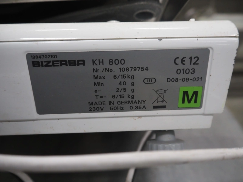 Bizerba weighing scale with label printer, model: KH 800, serial number: 10879754, maximum load: 6/15 kg, minimum load: 40 g, e= 2/5 g, T= -6/15 kg, 230 V, 50 Hz, 0.35 A, scale dimensions: 390 mm x 250 mm, total dimensions: 450 mm x 450 mm x 600 mm.