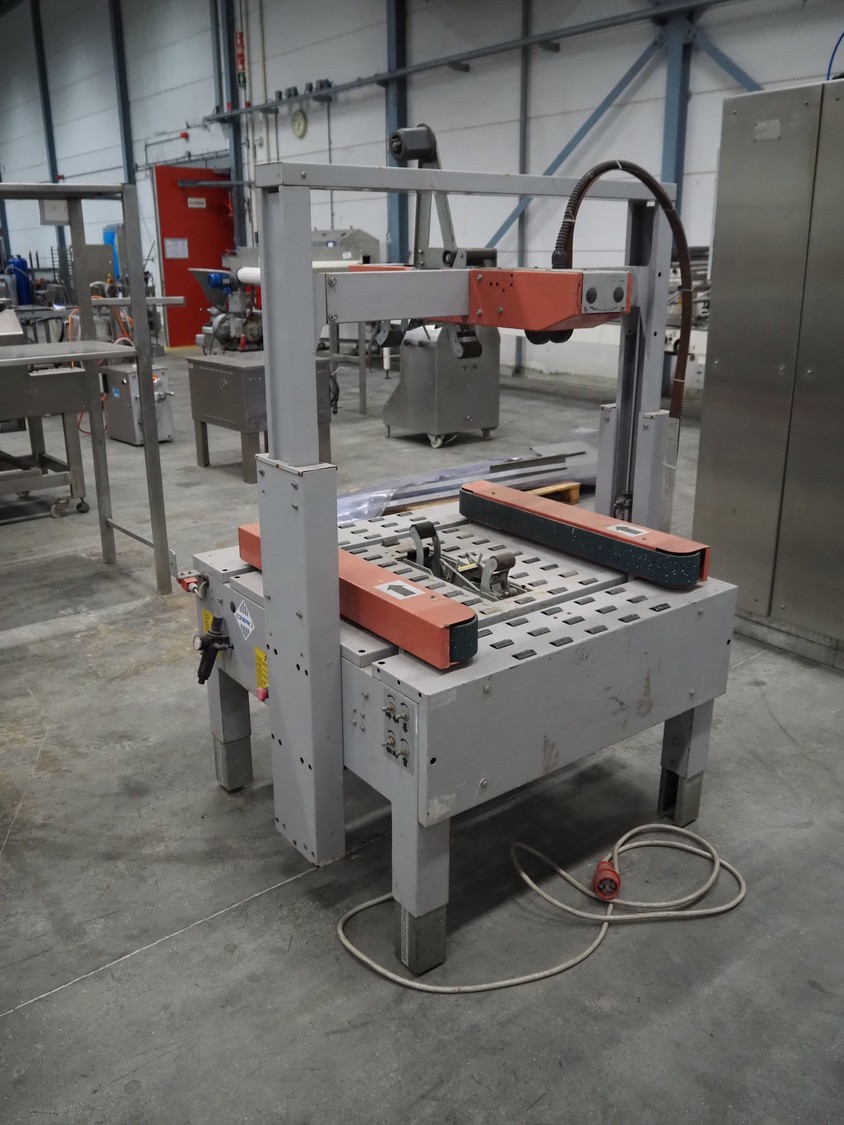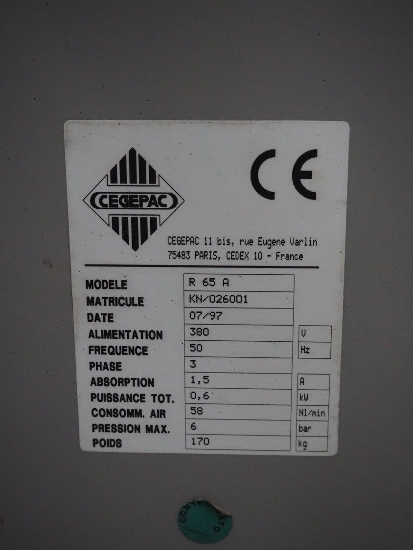 Cegepac box closing machine, model: R 65 A, serial number: KN/026001, year of construction: 07/97, 380 V, 3 Ph, 50 Hz, 1.5 A, 0.6 kW, weight: 170 kg, dimensions: 1160 mm x 1070 mm x 1800 mm.