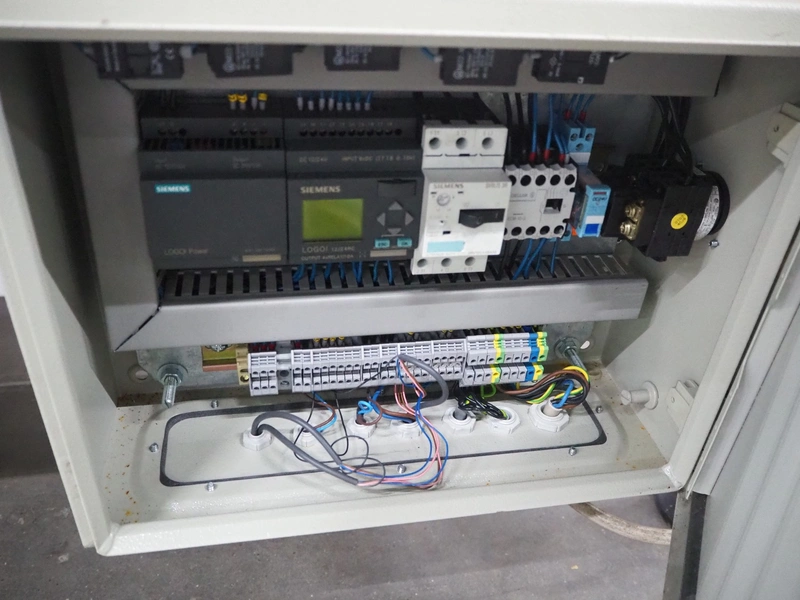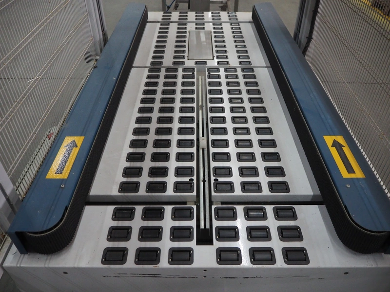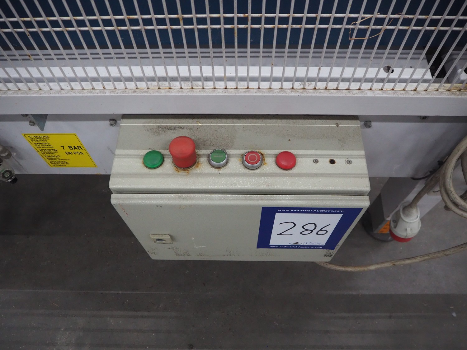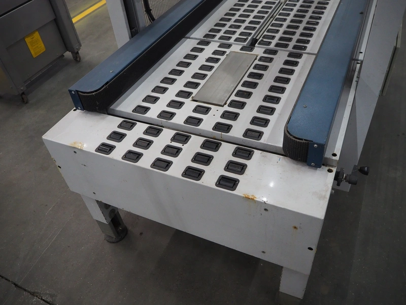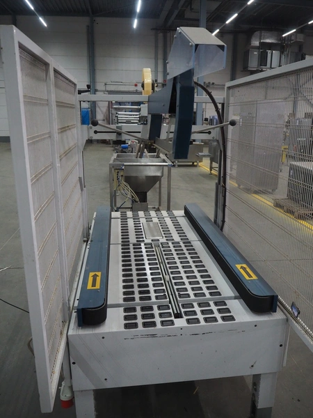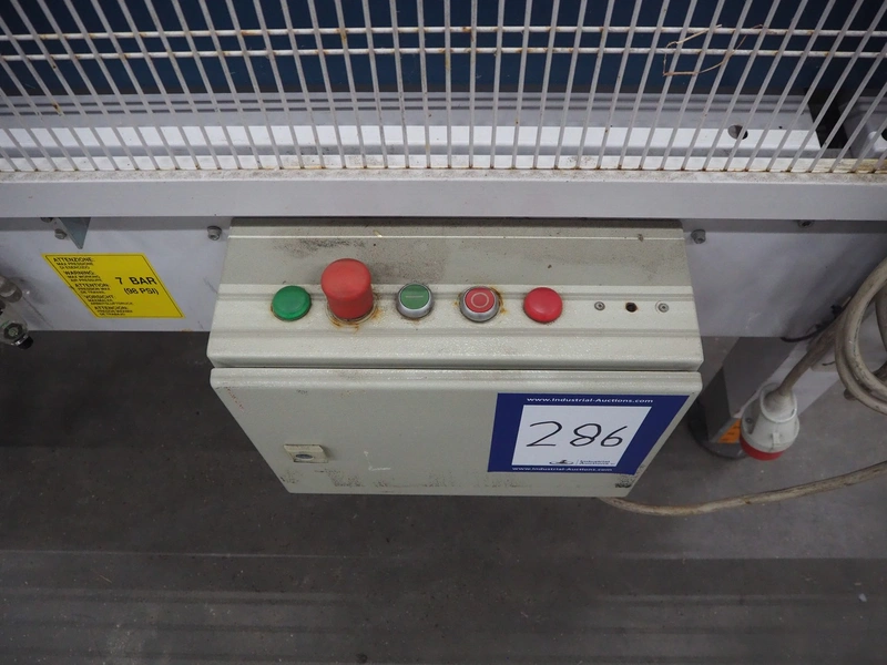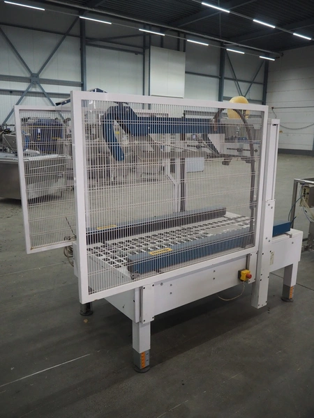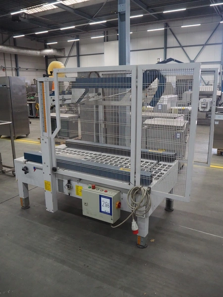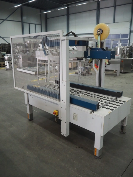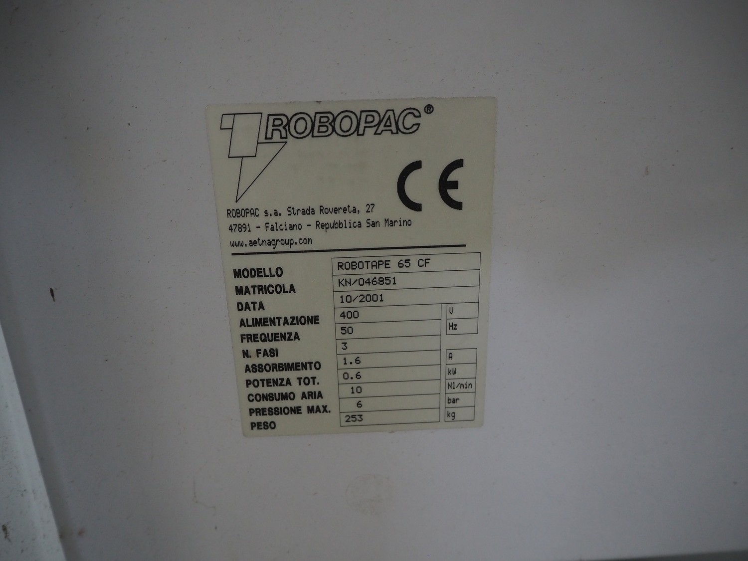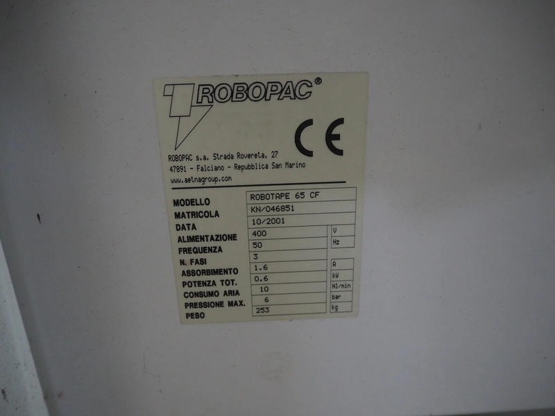 Robopack box closing machine, model: ROBOTAPE 65 CF, serial number: KN/046851, year of construction: 10/2001, 400 V, 3 Ph, 50 Hz, 1.6 A, 0.6 kW, weight: 253 kg, dimensions: 2350 mm x 1200 mm x 2000 mm.