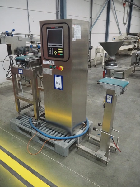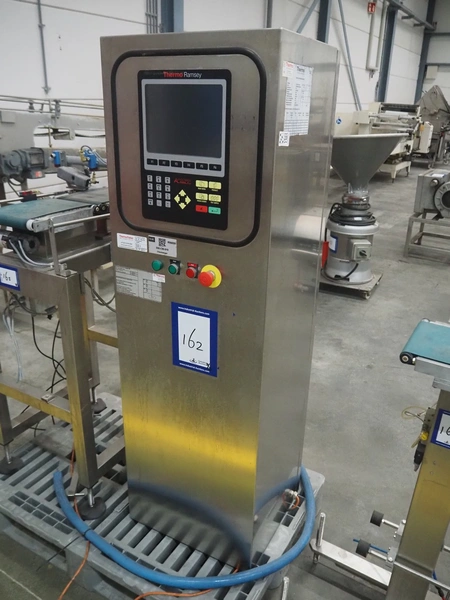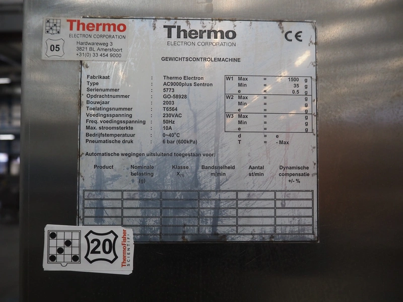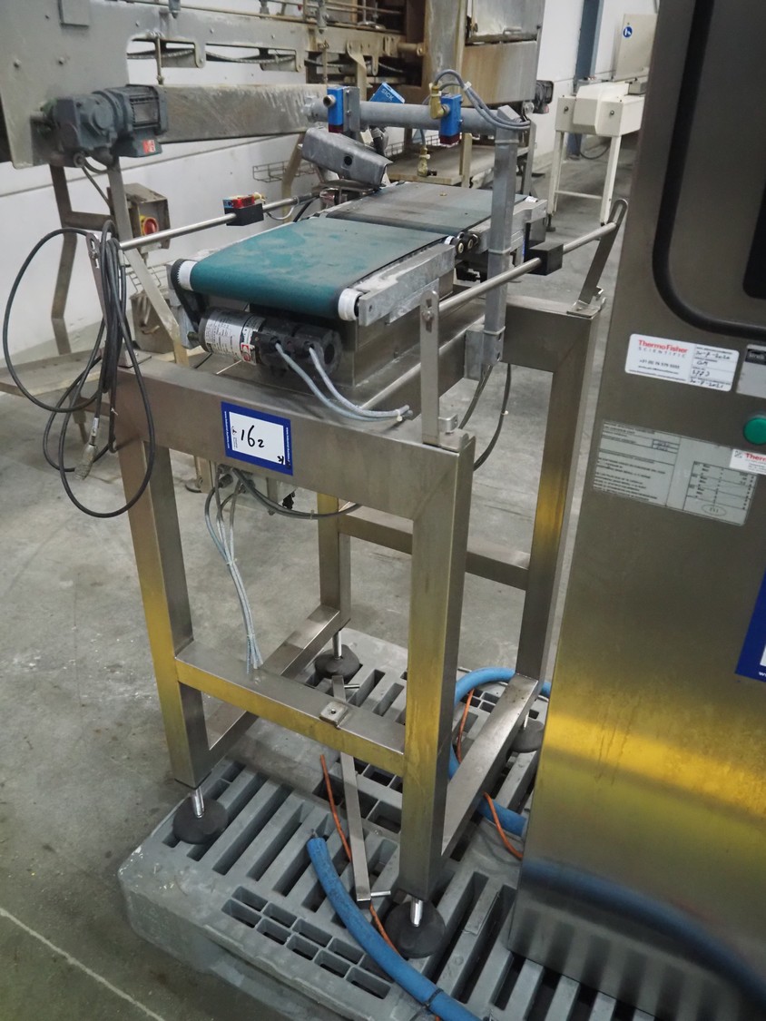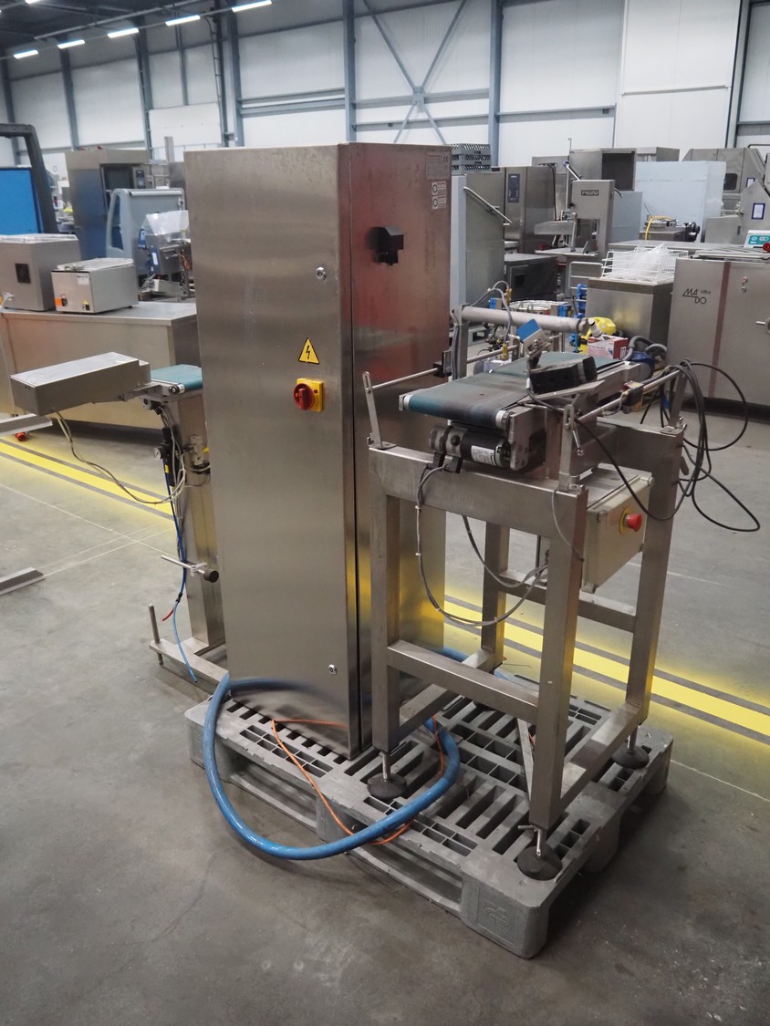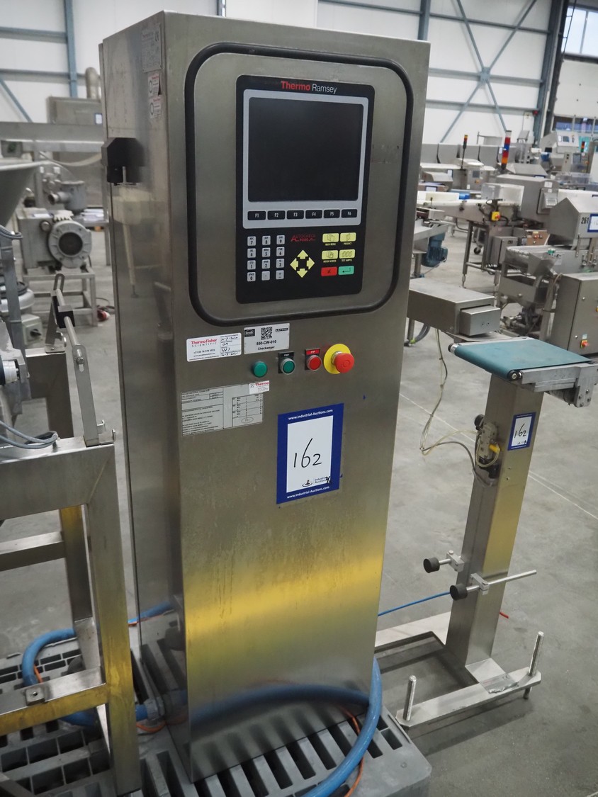 Thermo Ramsey checkweigher with rejecter, model: Sentron C, serial number: 5773, year of construction: 2003, 230 V, 50 Hz, 0.6 kVA, maximum weight: 1500 gram, minimum weight: 35 gram, e= 0.5 gram, plastic belt, belt width: 195 mm, total dimensions: 900 mm x 800 mm x 1250 mm. With Thermo Ramsey control panel, dimensions: 500 mm x 430 mm x 1770 mm.