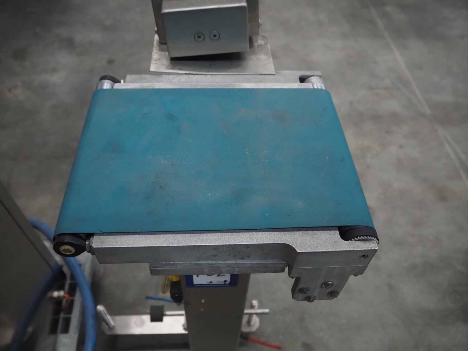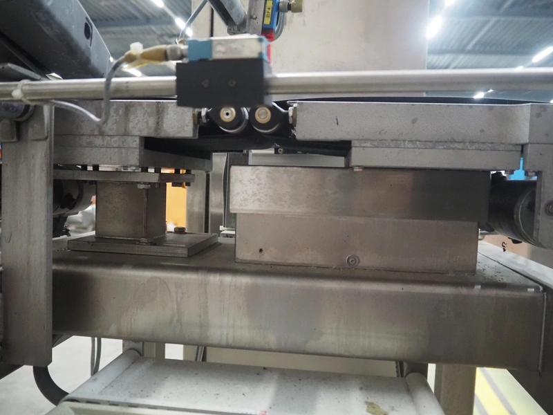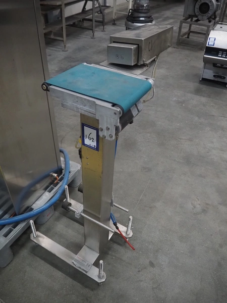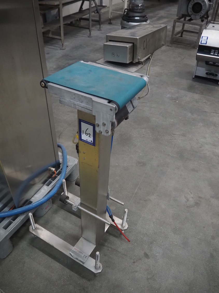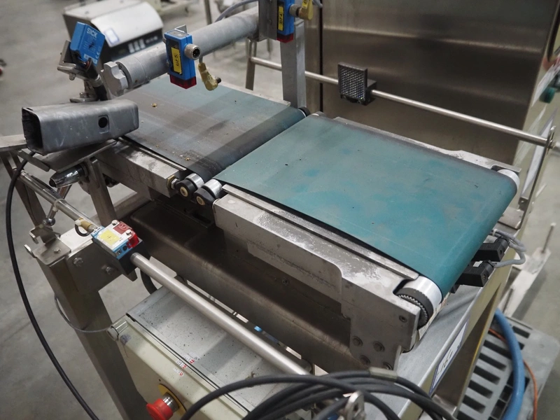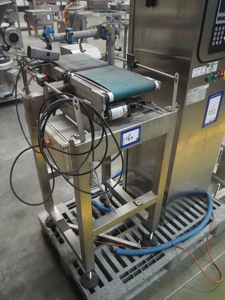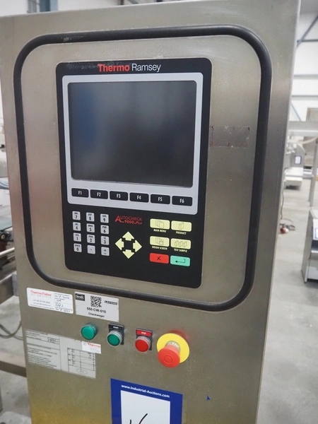 Thermo Ramsey checkweigher with rejecter, model: Sentron C, serial number: 5773, year of construction: 2003, 230 V, 50 Hz, 0.6 kVA, maximum weight: 1500 gram, minimum weight: 35 gram, e= 0.5 gram, plastic belt, belt width: 195 mm, total dimensions: 900 mm x 800 mm x 1250 mm. With Thermo Ramsey control panel, dimensions: 500 mm x 430 mm x 1770 mm.