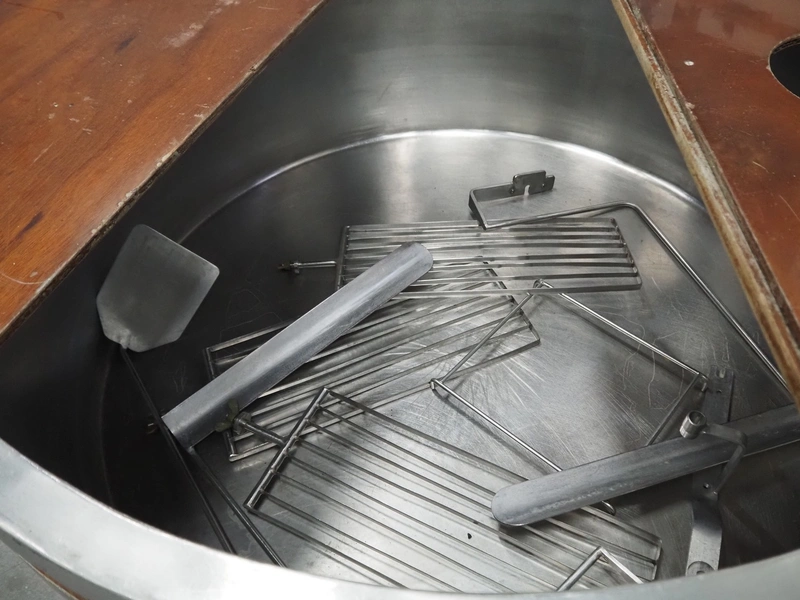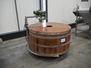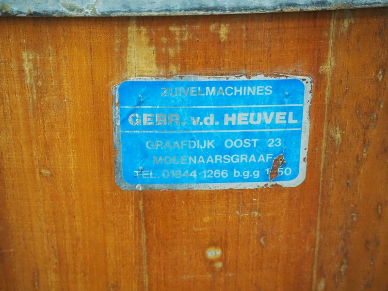 Gebr. Van den Heuvel mobile wooden cheese vat with agitator, inside dimensions: 1300 mm x 1300 mm x 680 mm, total dimensions: 1600 mm x 1450 mm x 1500 mm.
