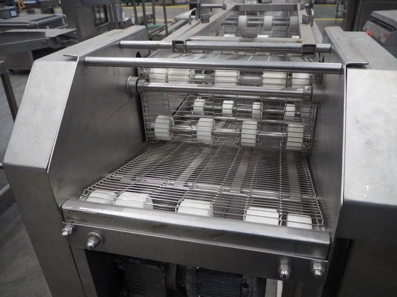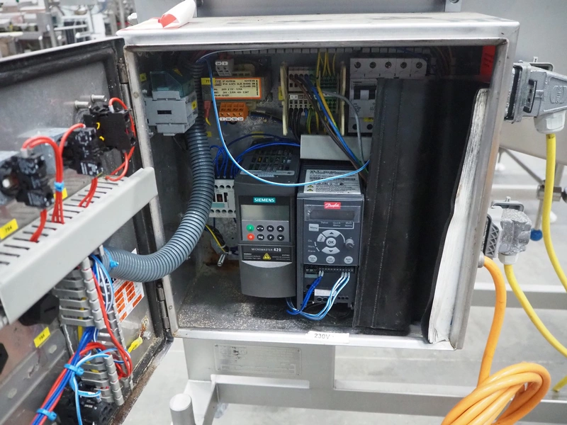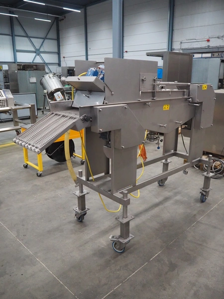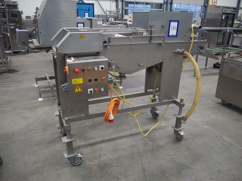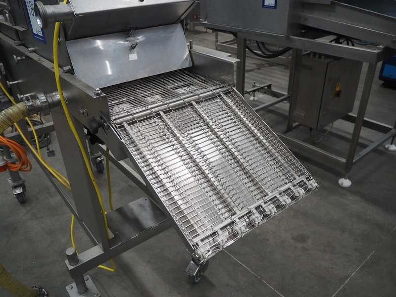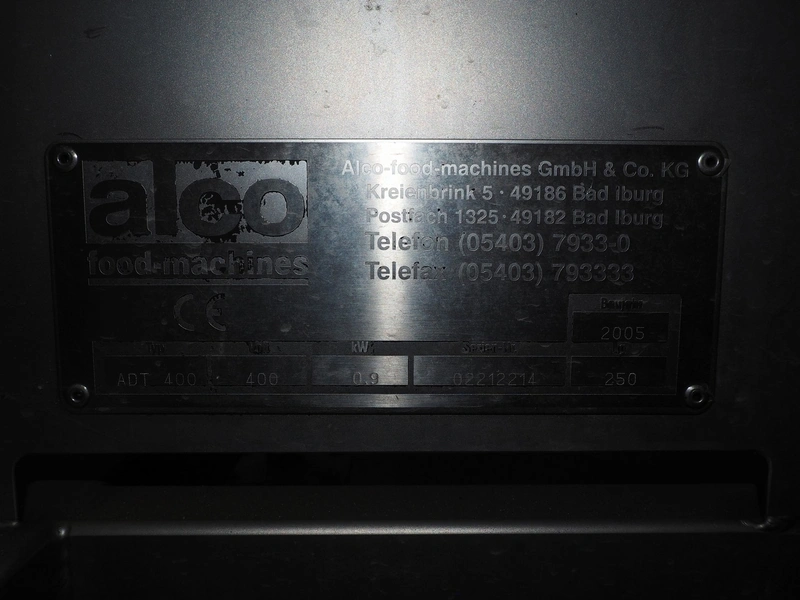 Alco mobile coating machine, type: ADT 400, serial number: 02212214, year of construction: 2005, 400 V, 0.9 kW, s/s mesh belt, belt width: 400 mm, total dimensions: 2250 mm x 900 mm x 1680 mm.