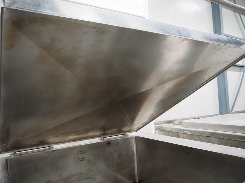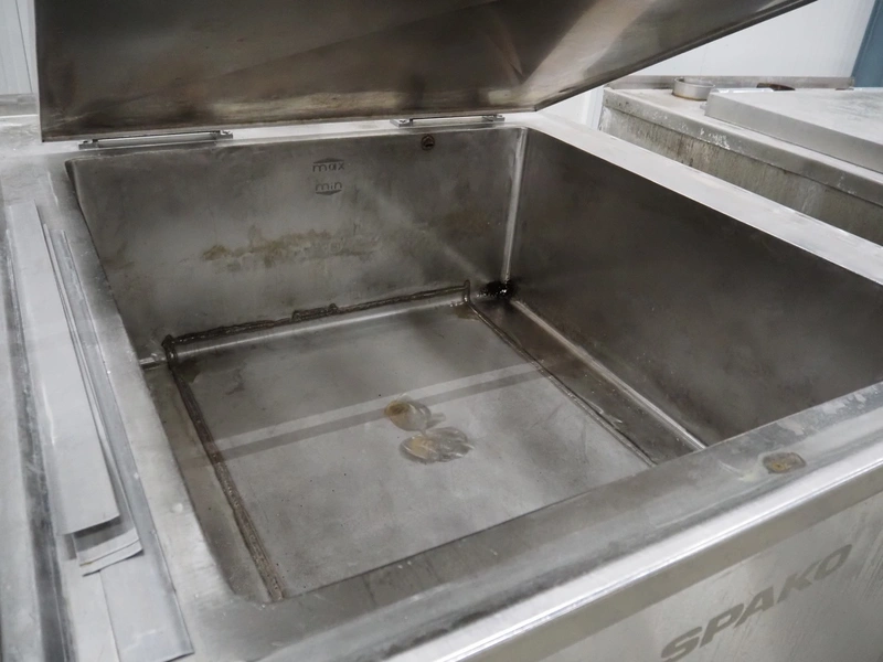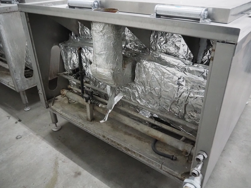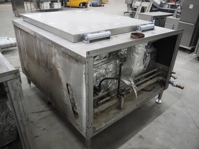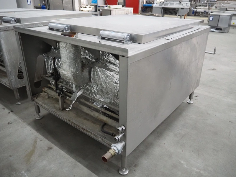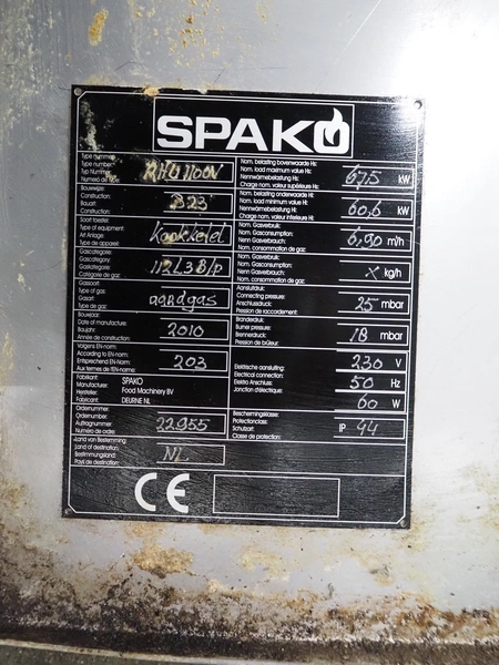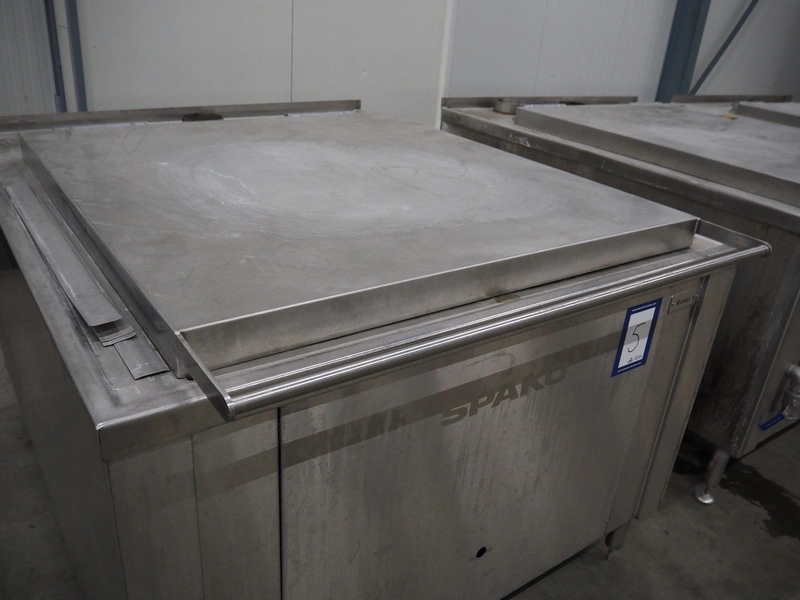 Spako cooking vessel, type number: RHU 1100 V, year of construction: 2010, natural gas, 230 V, 50 Hz, 60 W, volume: 1100 liter, dimensions inside: 1400 mm x 1300 mm x 600 mm, total dimensions: 2300 mm x 1670 mm x 1280 mm.