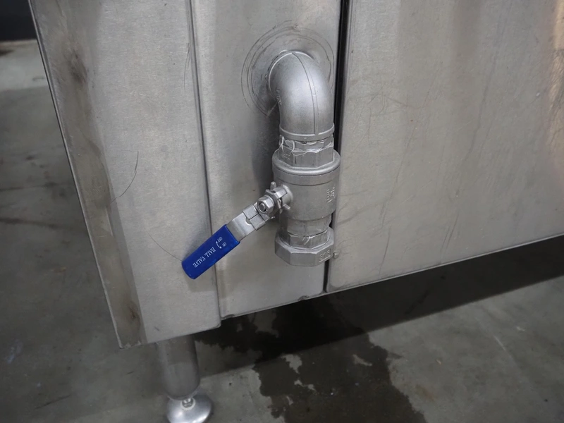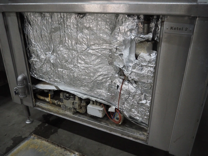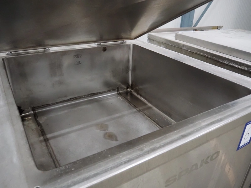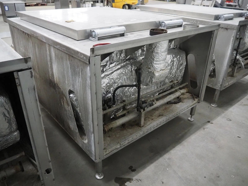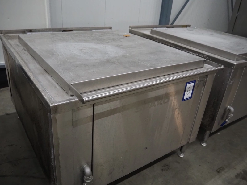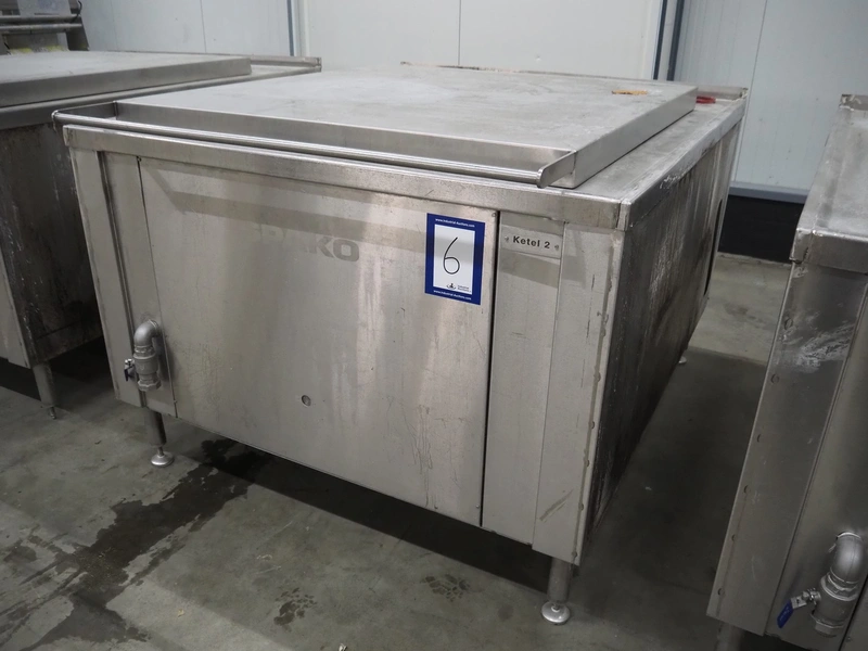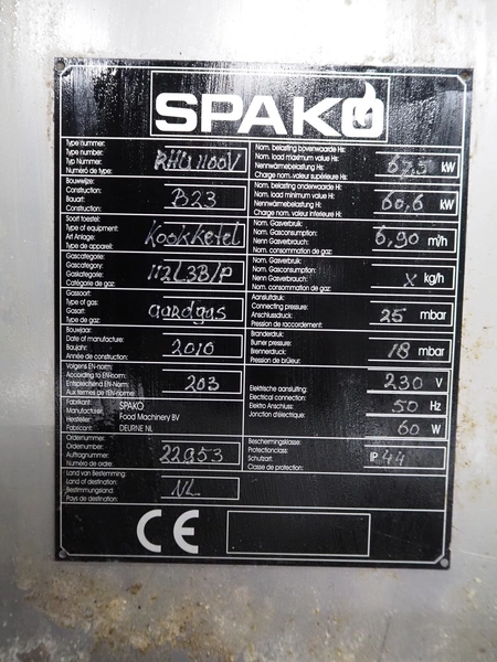 Spako cooking vessel, type number: RHU 1100 V, year of construction: 2010, natural gas, 230 V, 50 Hz, 60 W, volume: 1100 liter, dimensions inside: 1400 mm x 1300 mm x 600 mm, total dimensions: 2300 mm x 1670 mm x 1280 mm.