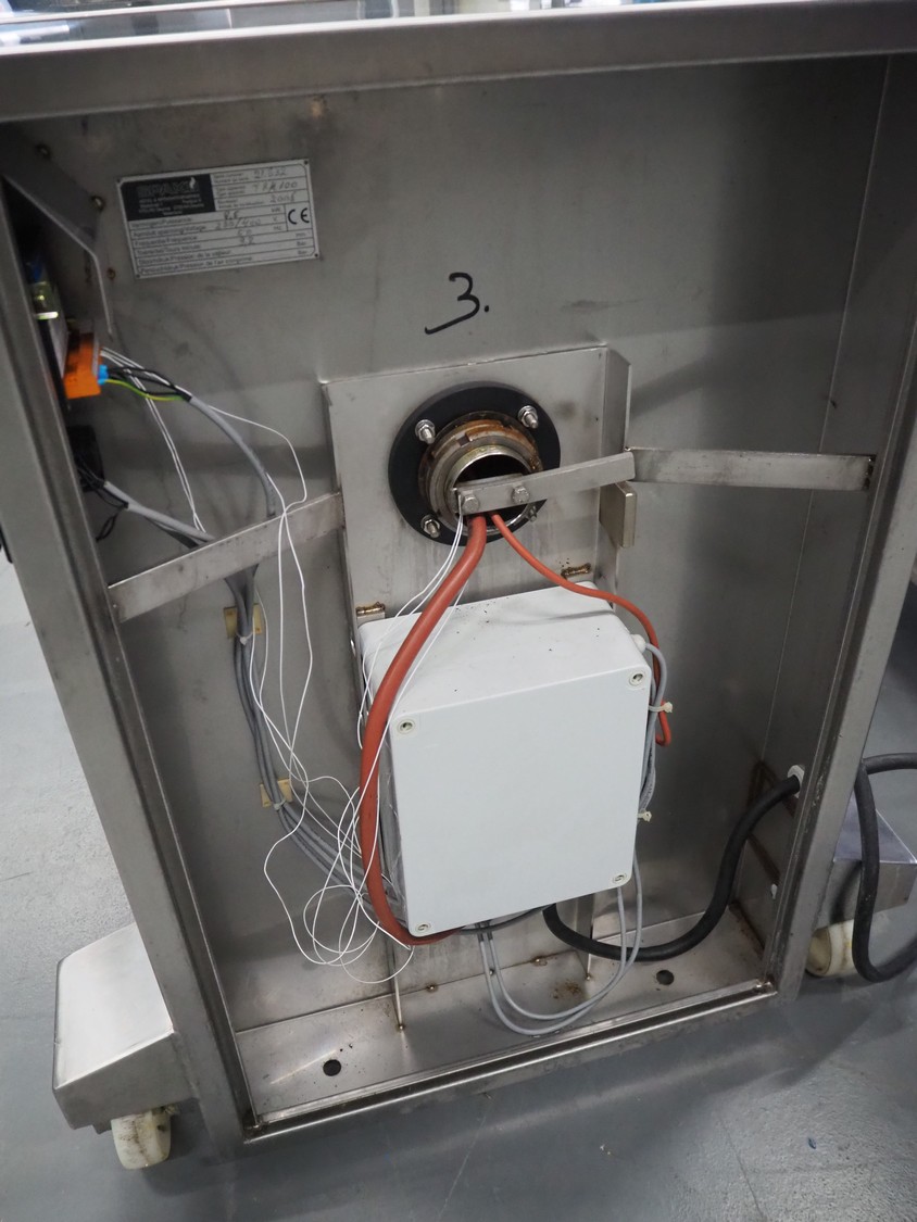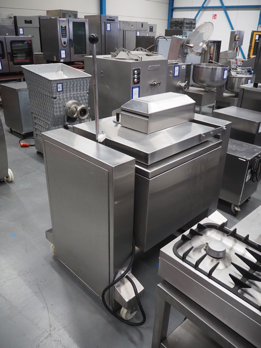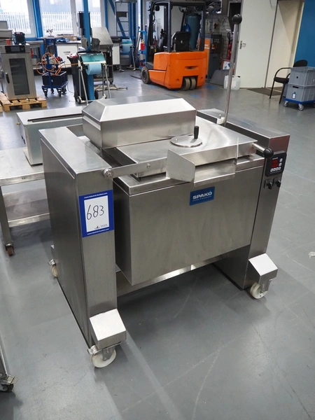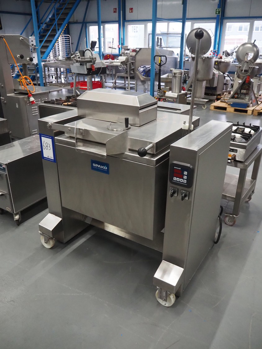Spako cooking vessel with agitator, type: TRK100, serial number: 21.532, 230/400 V, 50 Hz, 9.5 kW, inside dimensions: Ø 600 mm x 400 mm, total dimensions: 1160 mm x 880 mm x 1590 mm.