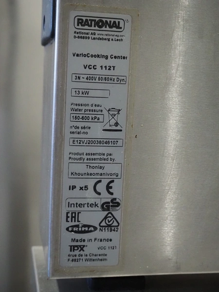 Rational Vario Cooking Center, type: VCC 112T, serial number: E12vj20038046107, year of construction: 2020, 400 V, 3 Ph, 50/60 Hz, 13 kW, temperature: 30-250°C, water pressure: 150-600 kPa, volume: (2x) 14 liter, inside dimensions: (2x) 330 mm x 440 mm x 140 mm, total dimensions: 960 mm x 740 mm x 1040 mm. Including 2 s/s baskets.