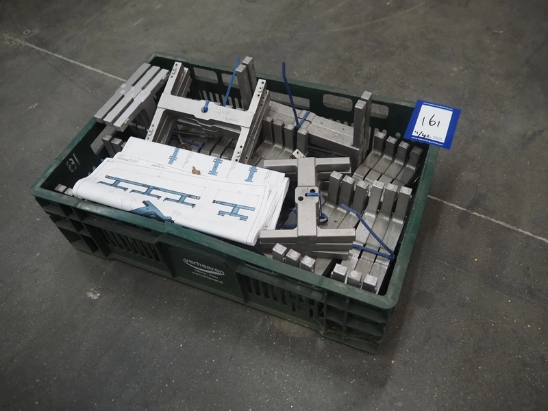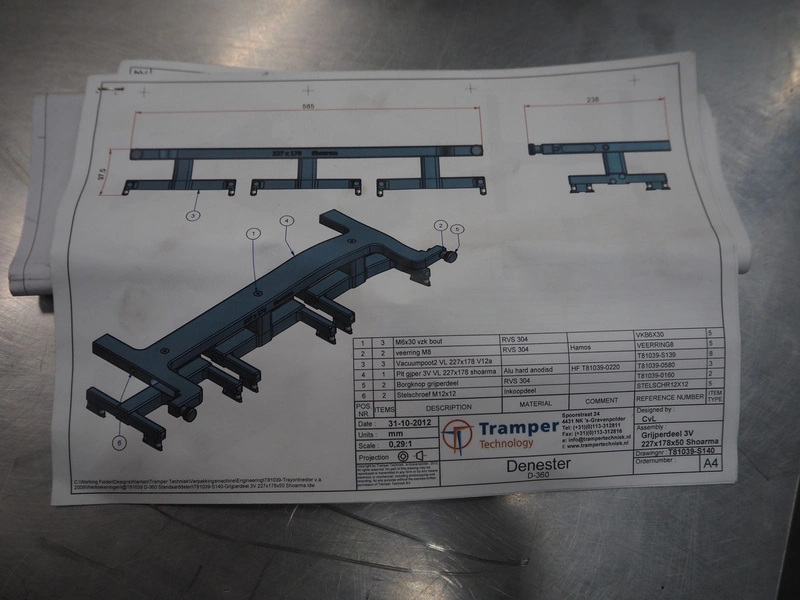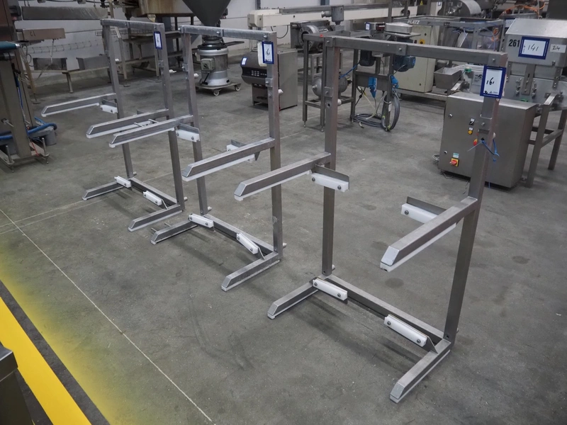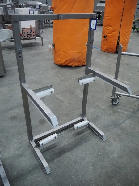 3 s/s frames for Tramper denester, dimensions: 740 mm x 620 mm x 1250 mm. Including plastic crate with parts.