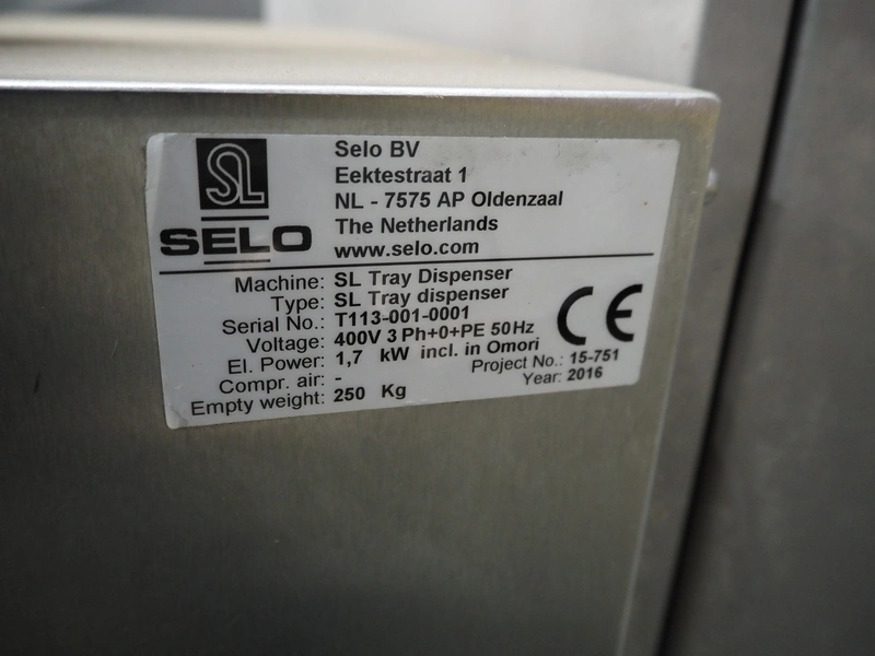 Selo BV tray denester, type: SL Tray dispenser, serial number: T113-001-0001, year of construction: 2016, 400 V, 3 Ph, 50 Hz, 1.7 kW, 2 lanes, lane width: (2x) 175 mm, total dimensions: 1300 mm x 1050 mm, 1900 mm.