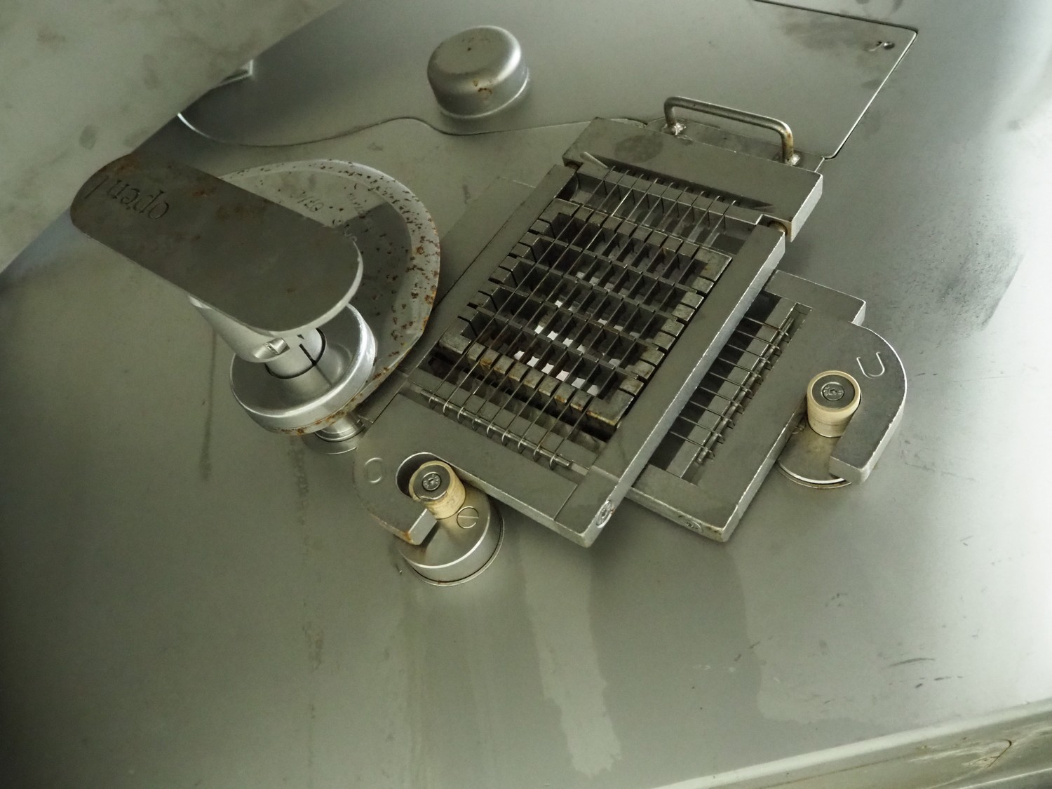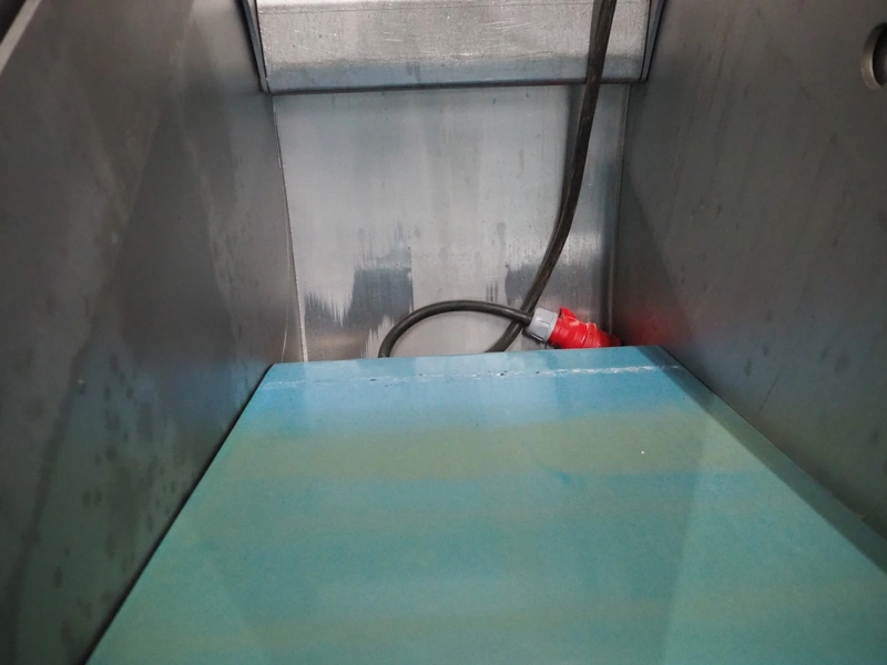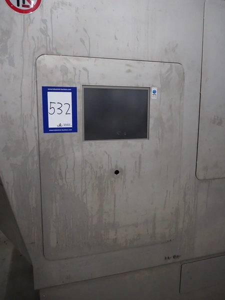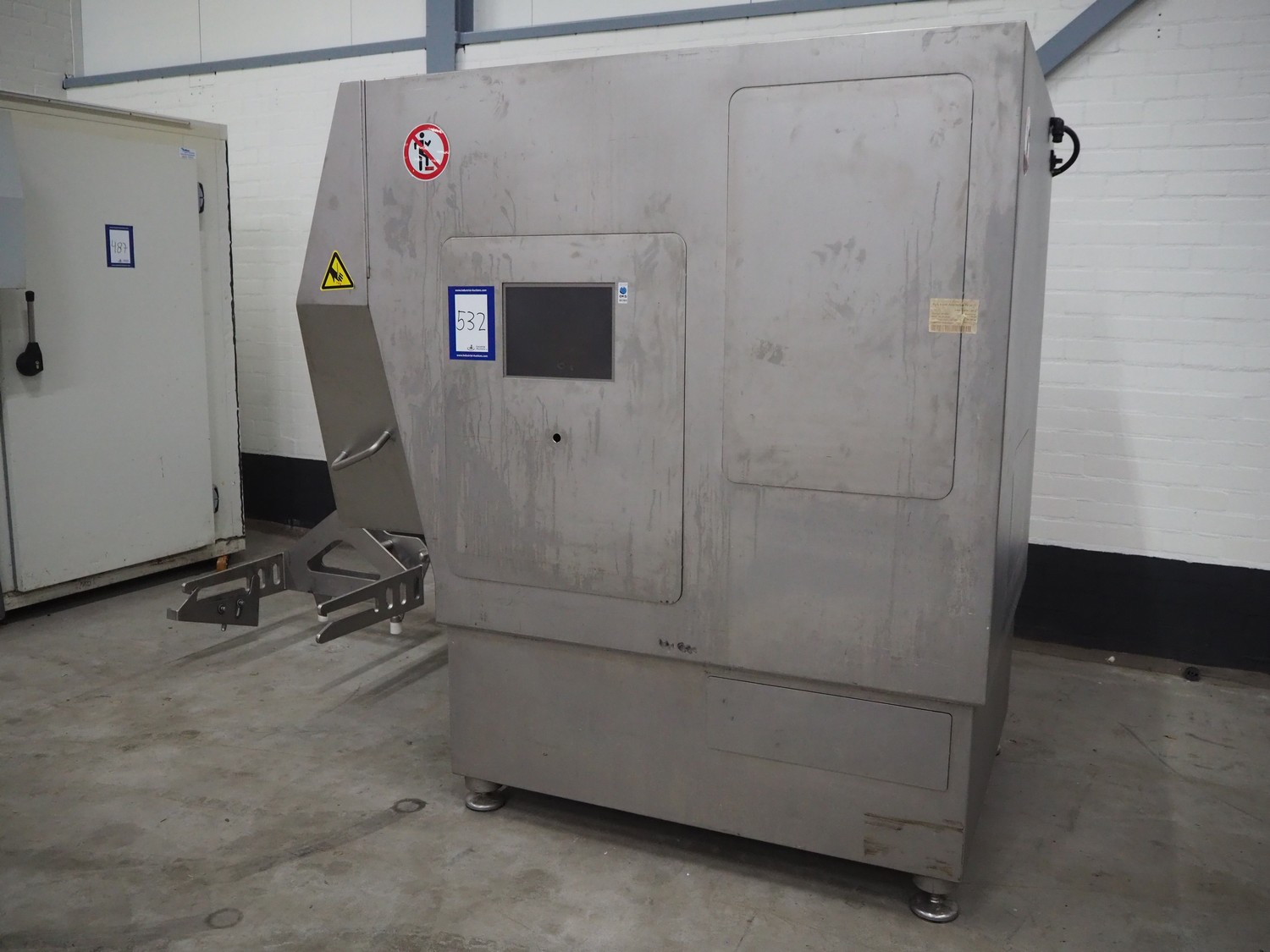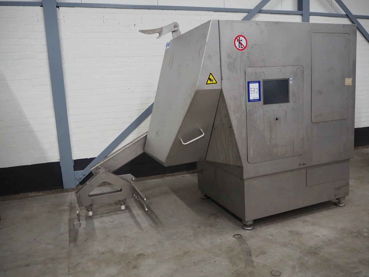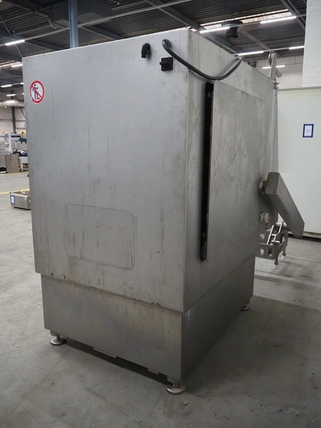 Rühle dicer with lifter for 200 liter meat bins, type: SR 3, number: 0071, year of construction: 2009, 400 V, 3 Ph, 50 Hz, 32 A, 7 kW, dimensions: 3150 mm x 1400 mm x 2070 mm.