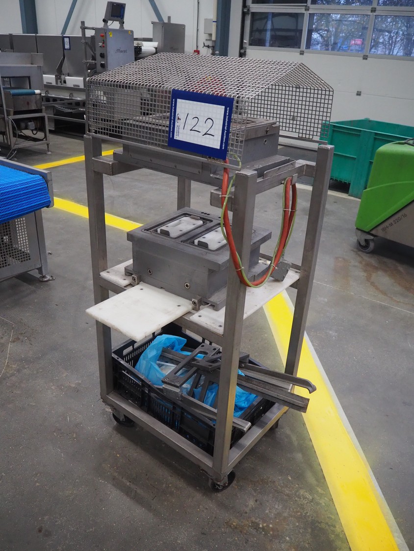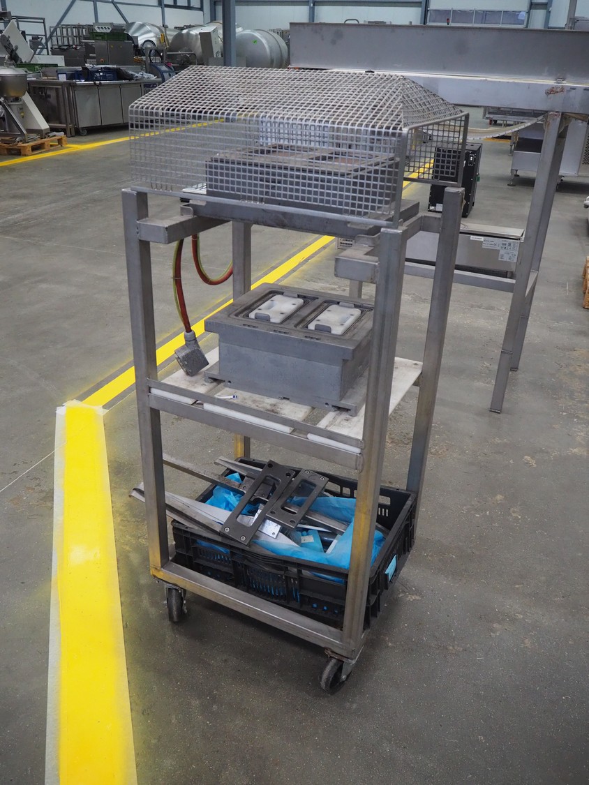 S/s trolley with parts for traysealer, dimensions dye: (2x) 190 mm x 100 mm, total dimensions: 630 mm x 500 mm x 1220 mm.