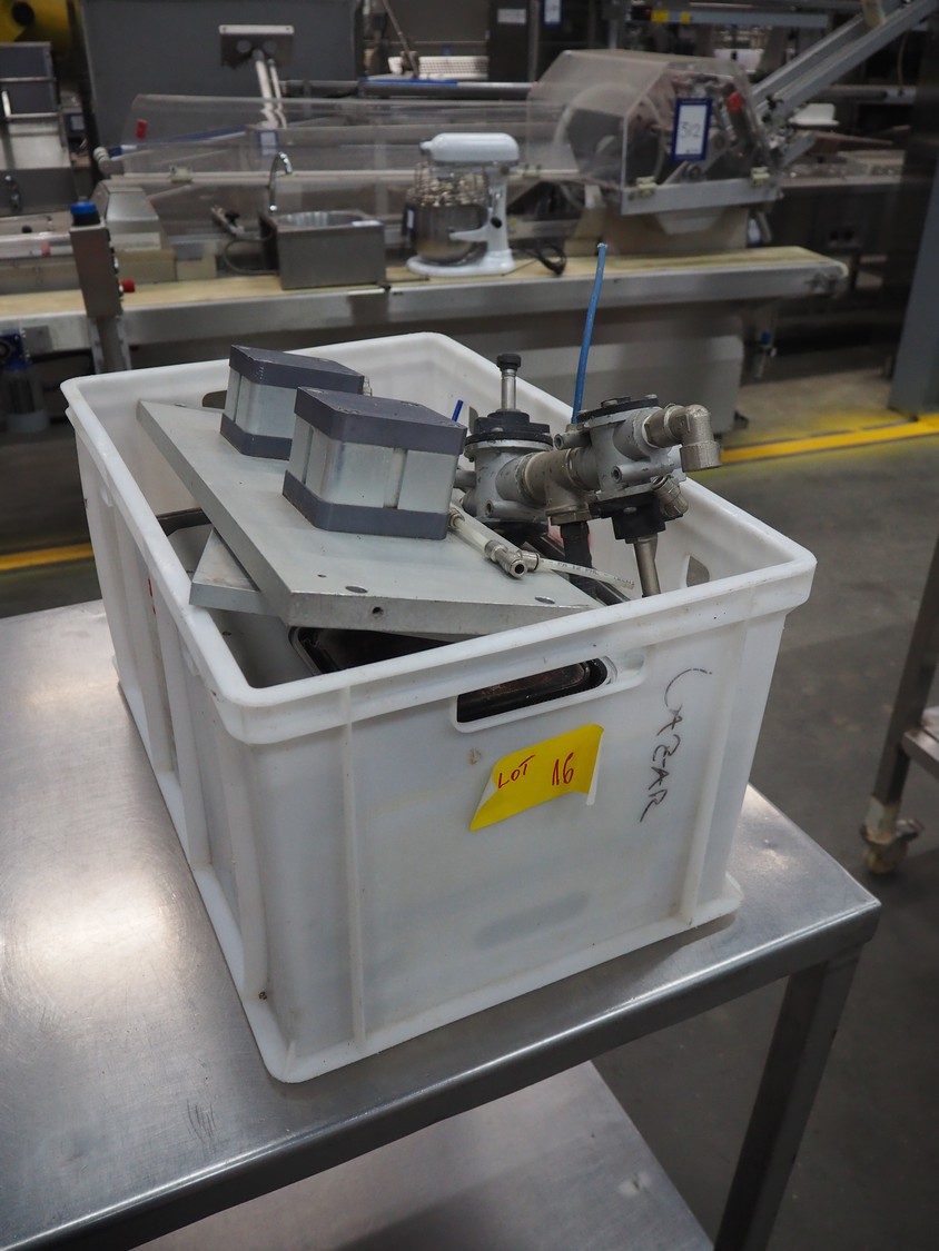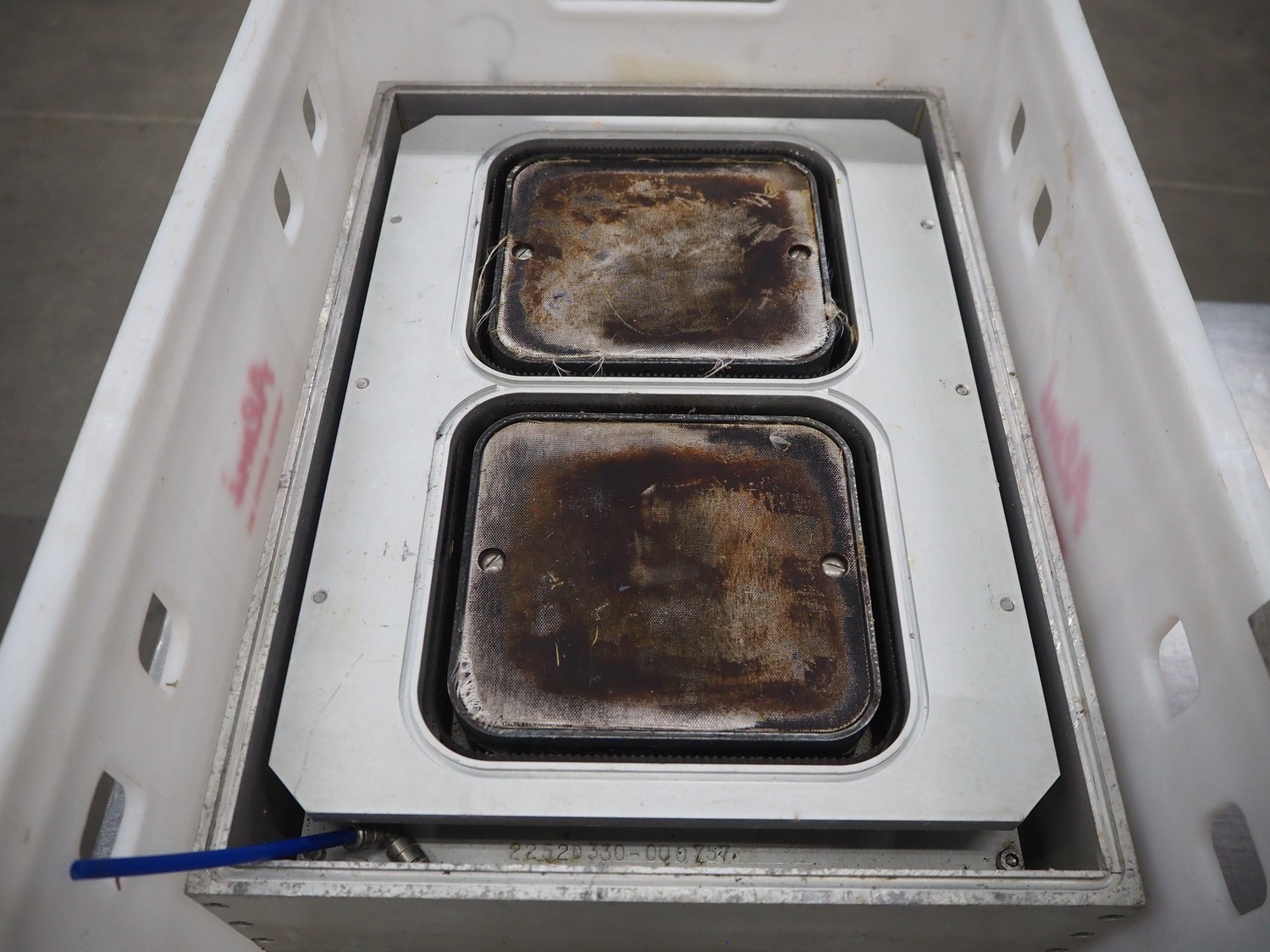 Plastic crate with dyes for traysealer, dye: (2x) 170 mm x 160 mm, total dimensions: 600 mm x 400 mm x 300 mm.