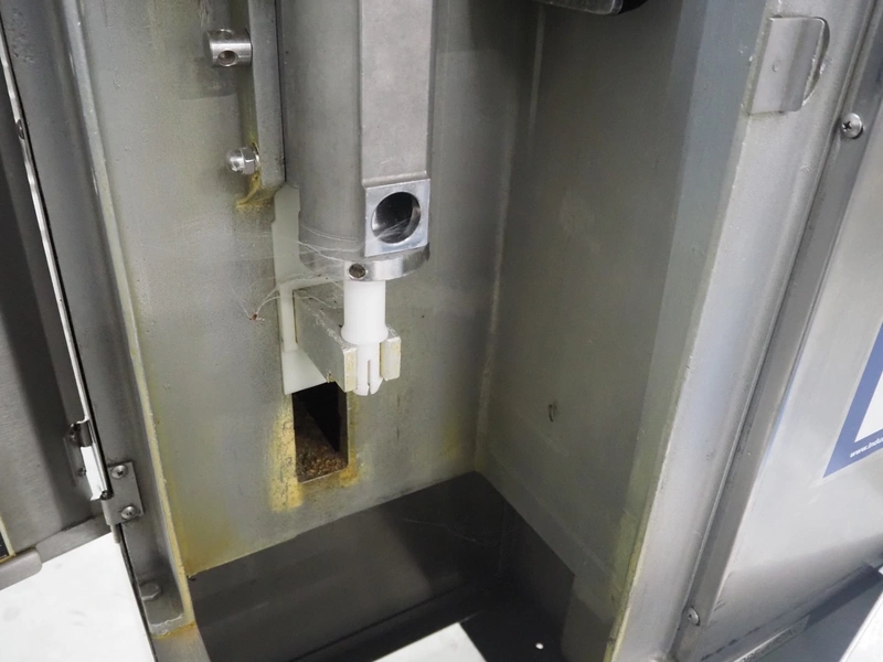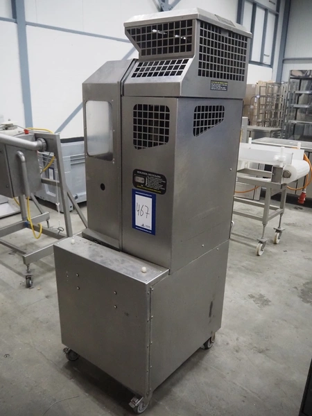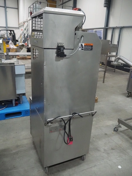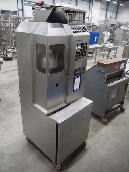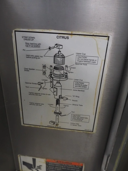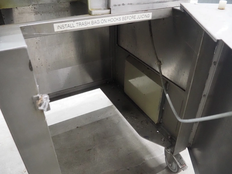 FMC FoodTech mobile multi-fruit juicer, model: POS-1, serial number: 82005006, 220 V, 1 Ph, 50 Hz, 10 A, dimensions: 850 mm x 550 mm x 1860 mm.