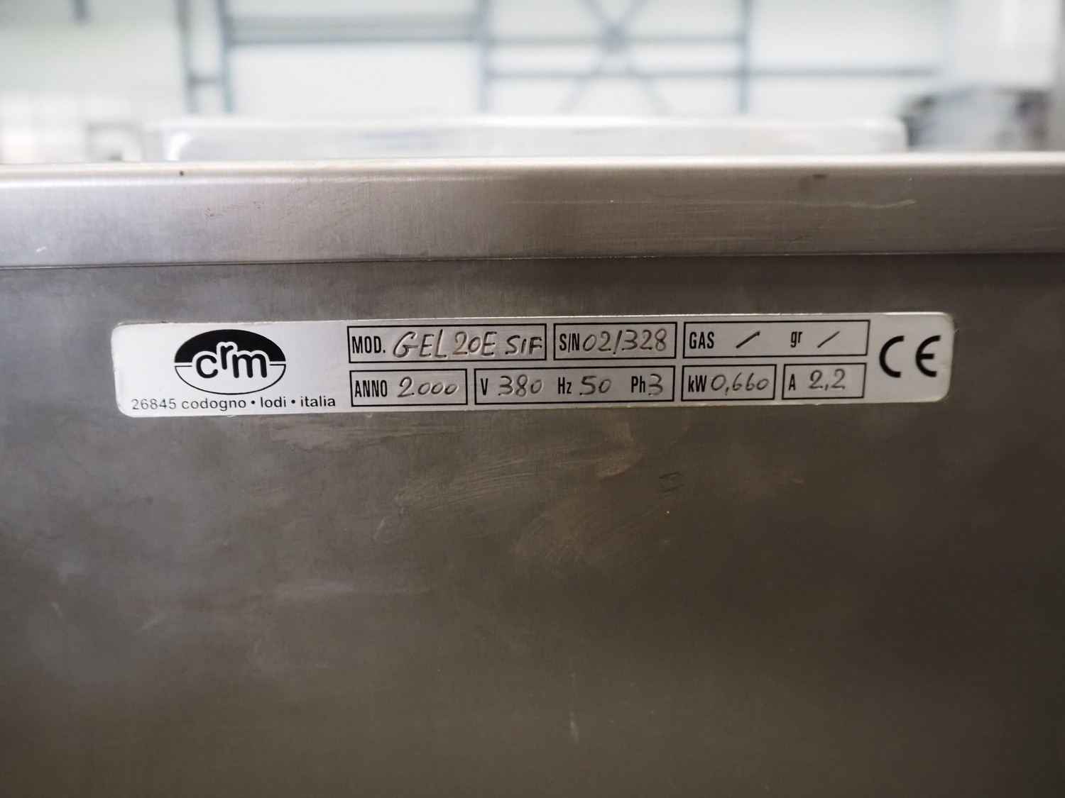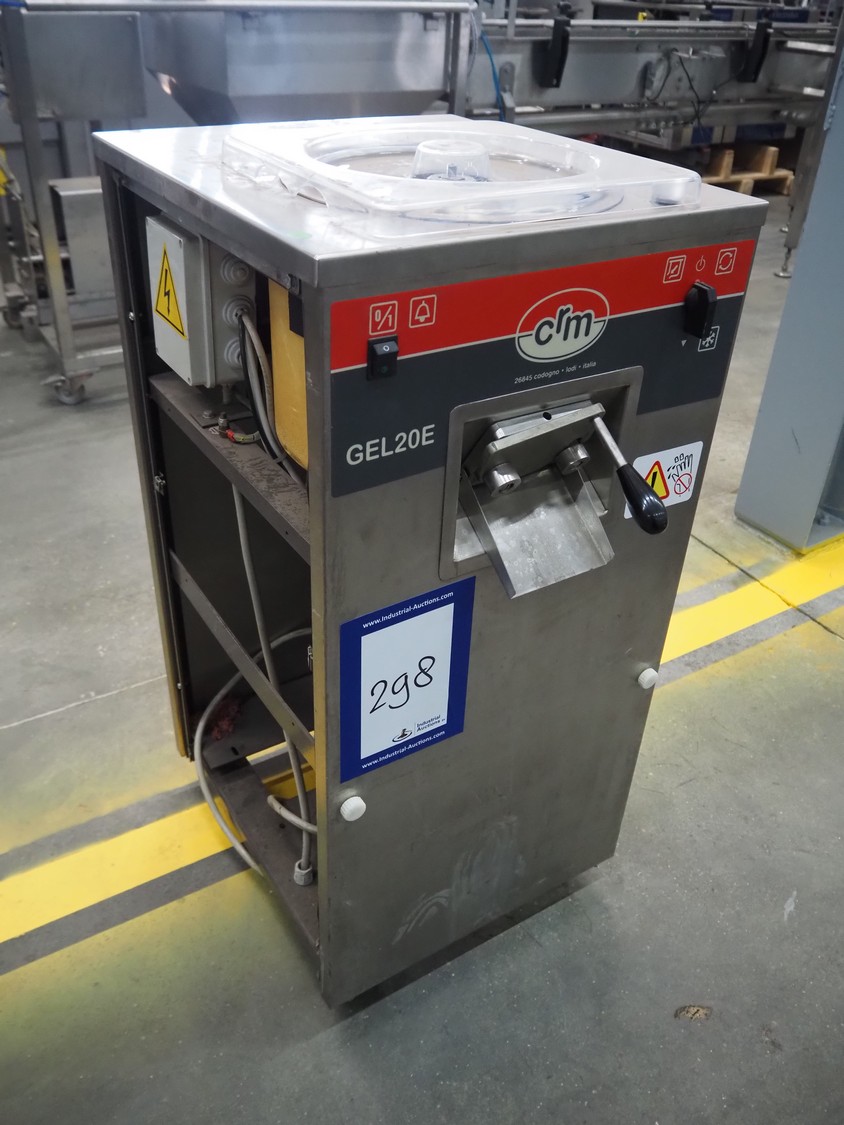 CRM mobile ice cream machine, model: GEL20E SIF, serial number: 02/328, year of construction: 2000, 380 V, 3 Ph, 50 Hz, 2.2 A, 0.66 kW, dimensions: 640 mm x 460 mm x 1000 mm. Missing 1 cover.