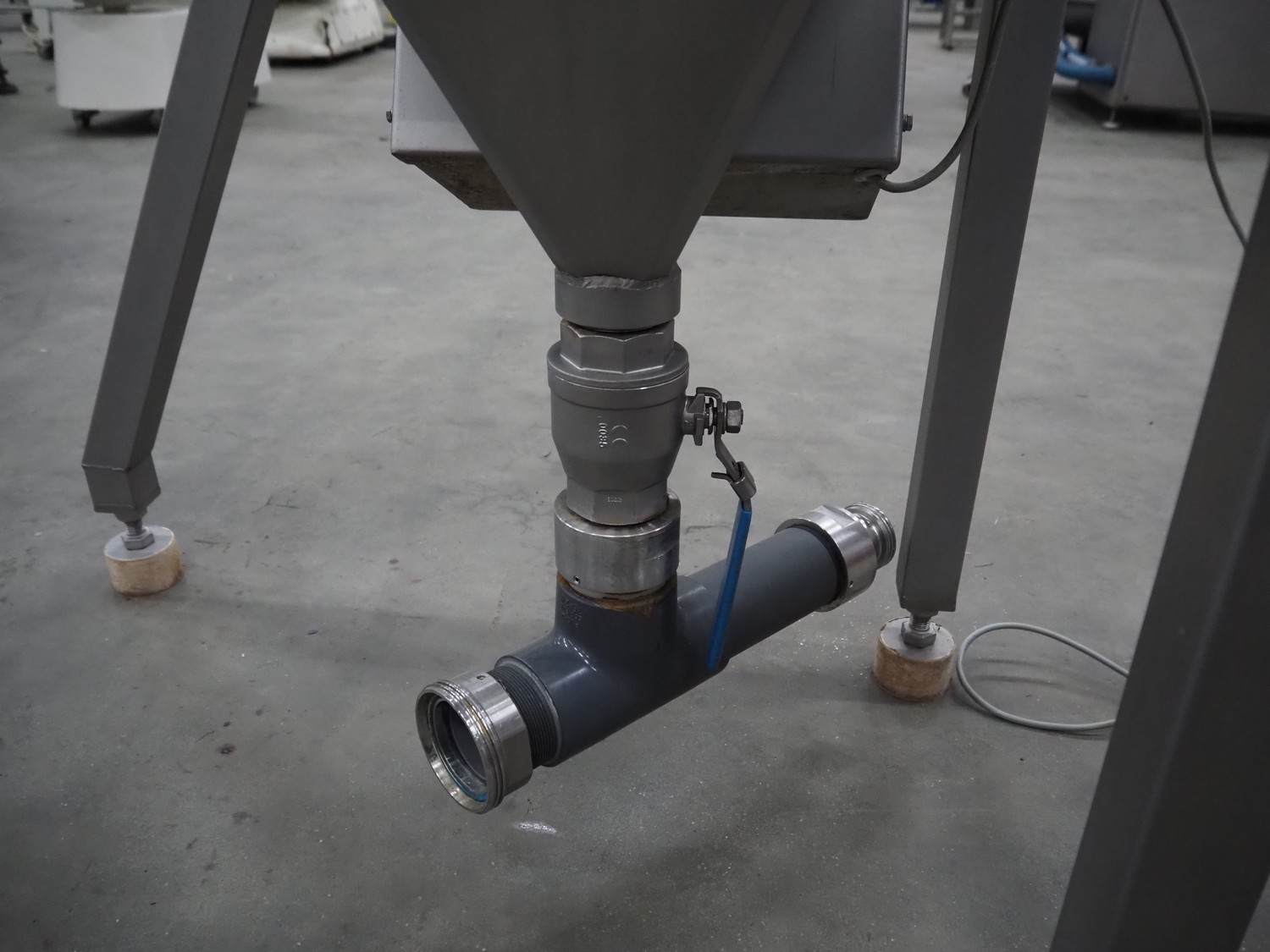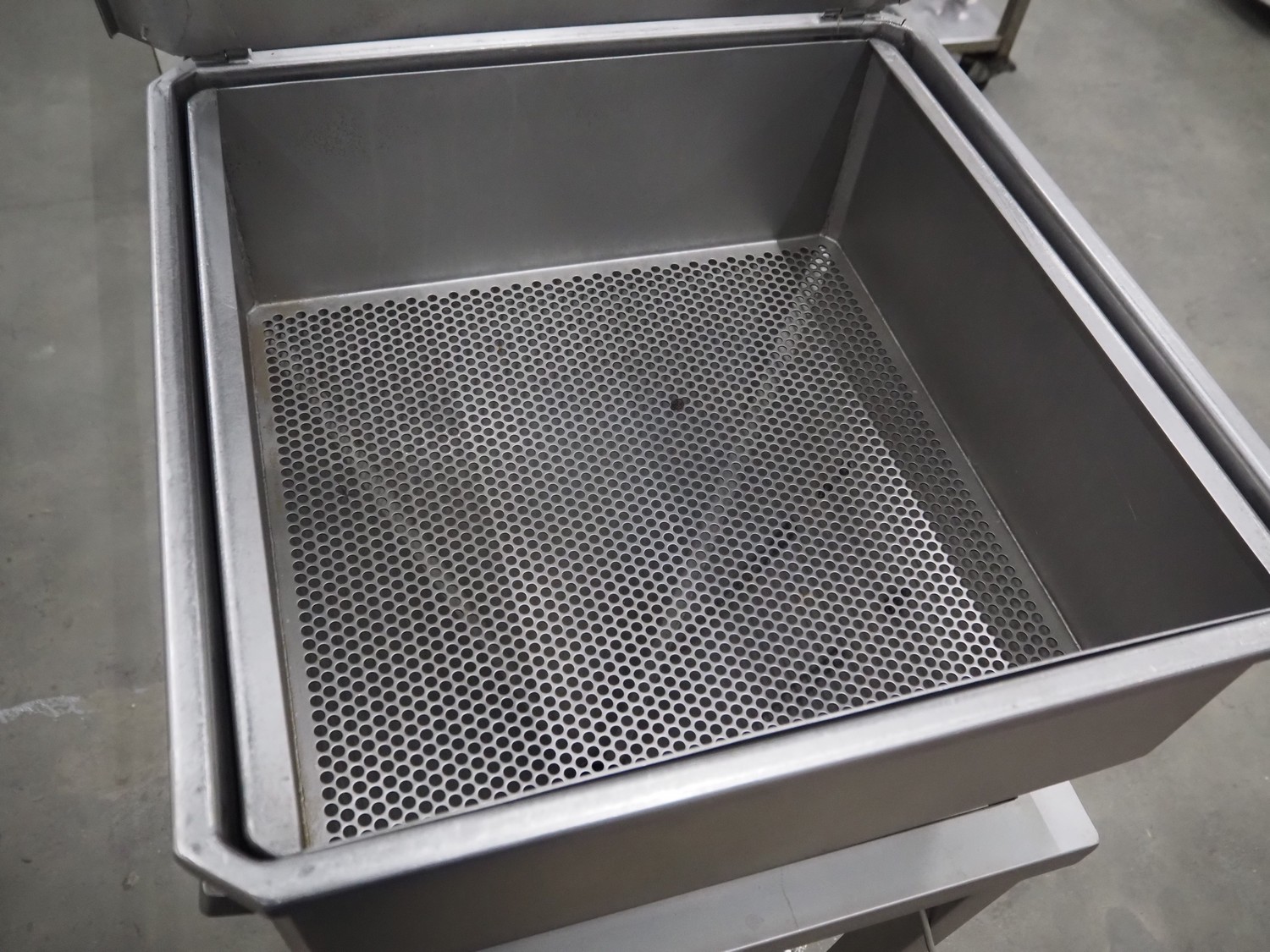 Pökelmaschinen Ges.m.b.H s/s infeed bunker for brine mixer, inside dimensions: 530 mm x 490 mm x 200 mm, total dimensions: 900 mm x 730 mm x 1420 mm.