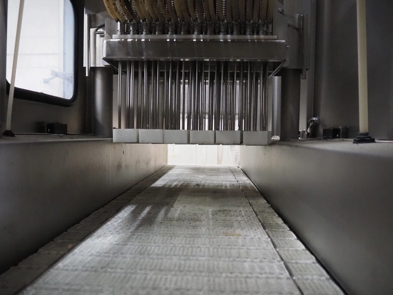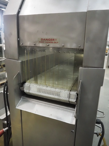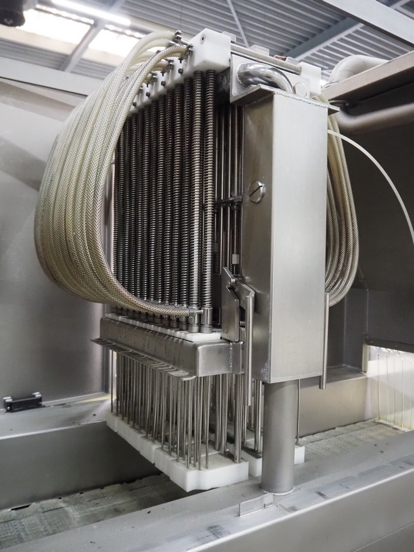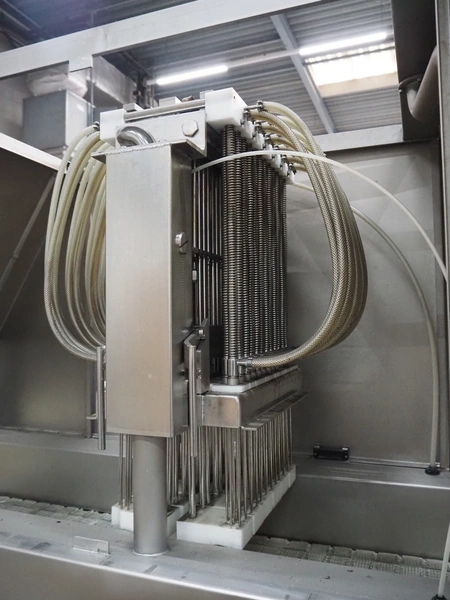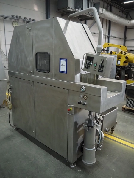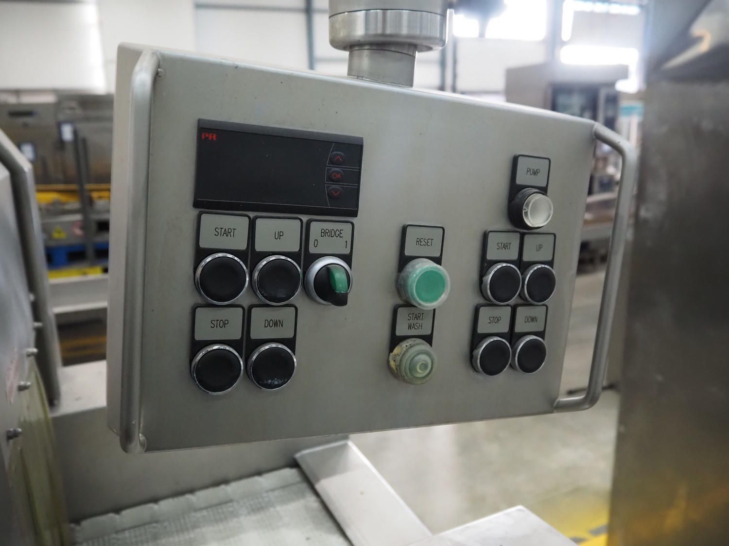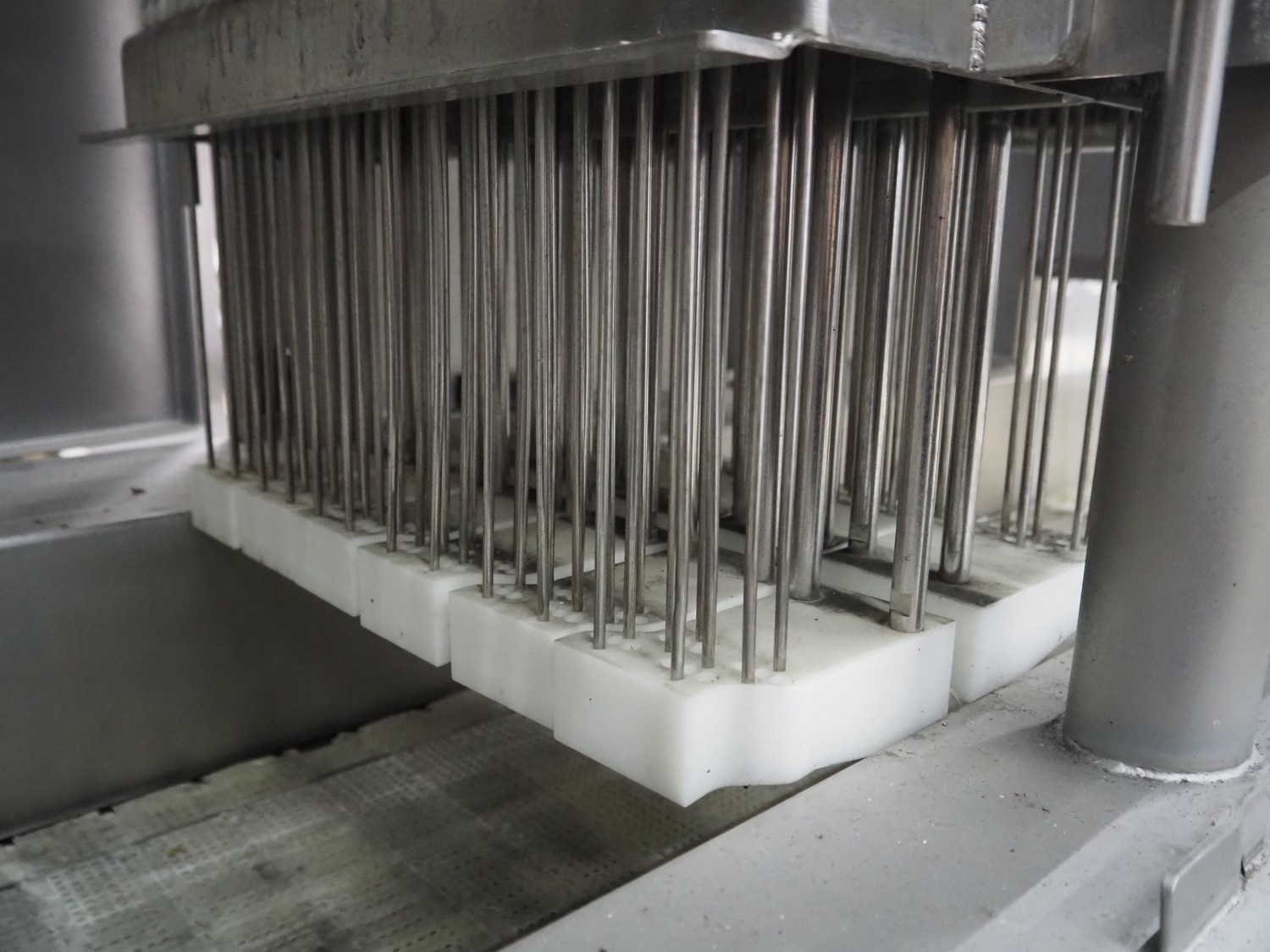 Fomaco injector, type: FGM 48 SC, machine number: 7829, year of construction: 1999, 400 V, 3 Ph, 50 Hz, 17-32 A, 6 bar, (2x) 48 needles, plastic mesh belt, belt width: 400 mm, dimensions injector: 1270 mm x 750 mm x 2200 mm. Including Fomaco mobile filter unit, model: PFS 5/225 CS, machine number: 7831, year of construction: 1999, dimensions filter unit: 1700 mm x 650 mm x 700 mm. Filter unit is incomplete.