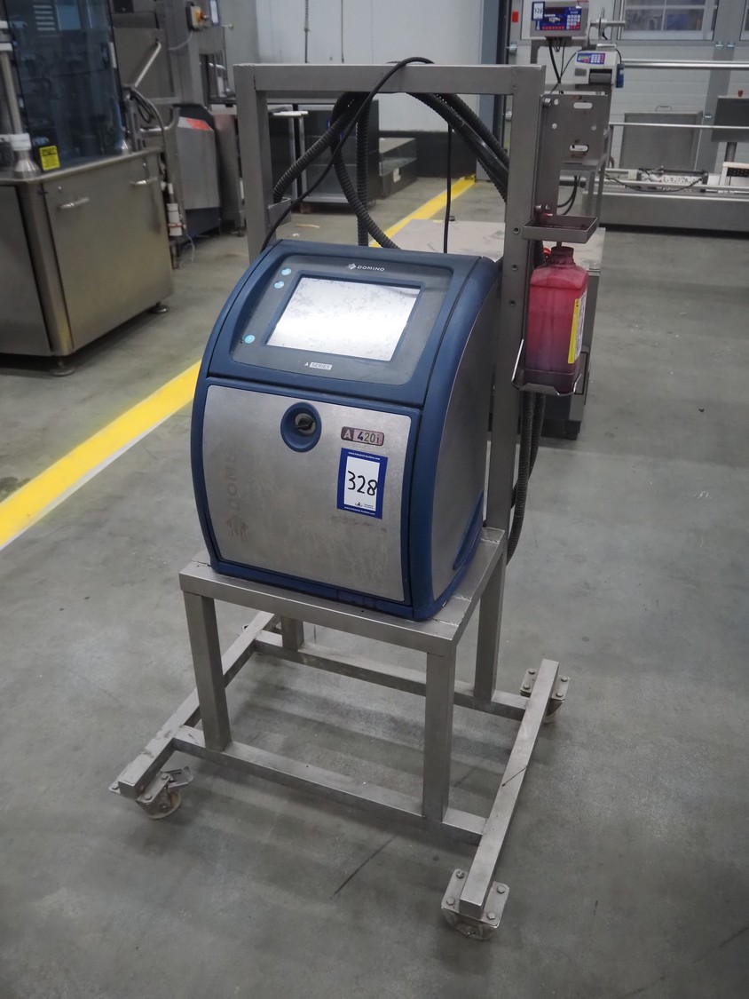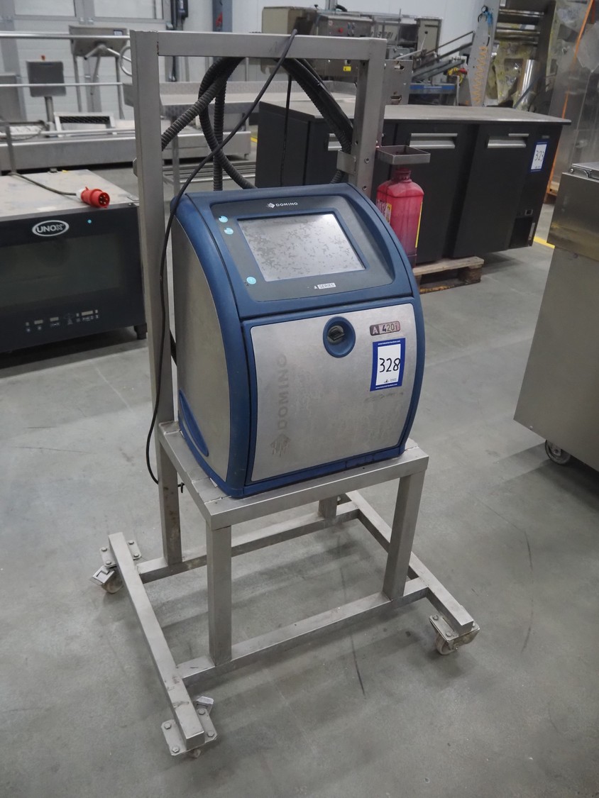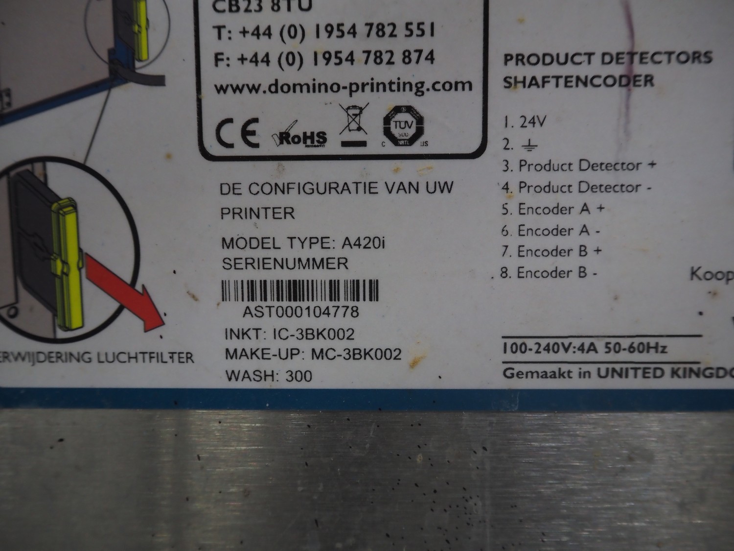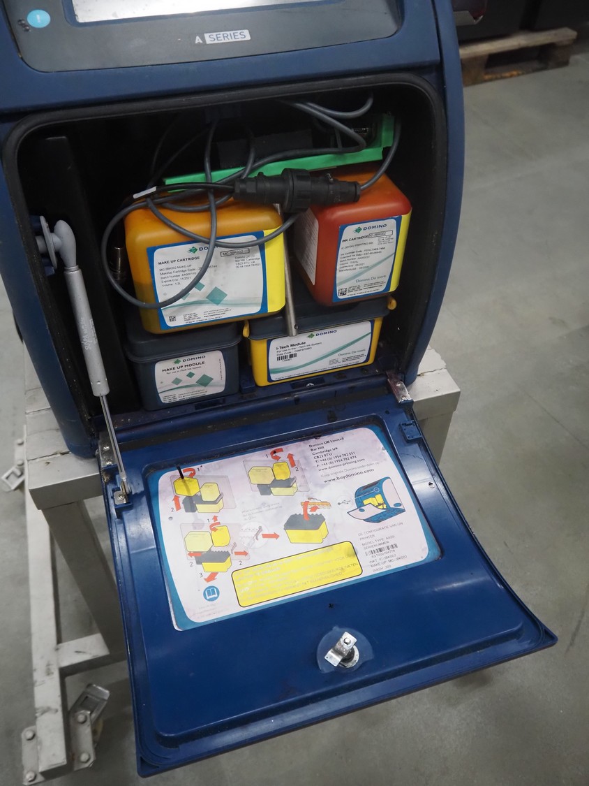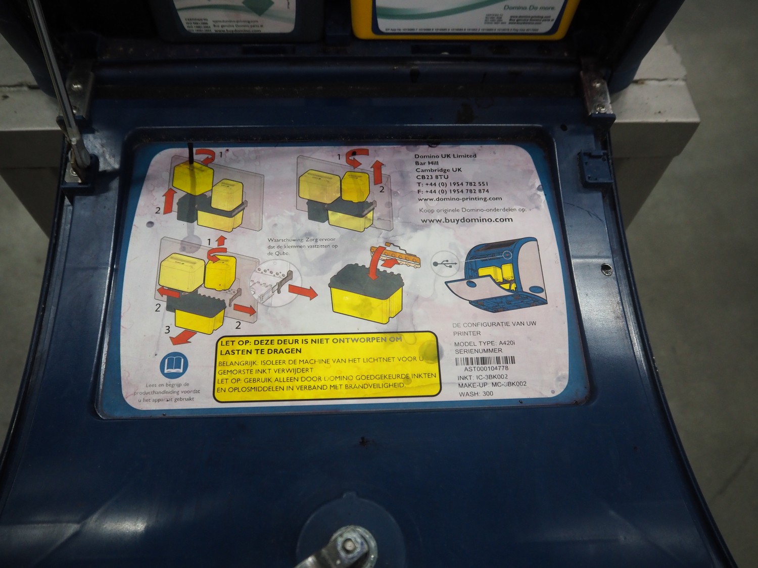 Domino mobile inkjet printer, model: A420i, serial number: AST000104778, 100-240 V, 50-60 Hz, 4 A, dimensions: 820 mm x 680 mm x 1430 mm. Incomplete.