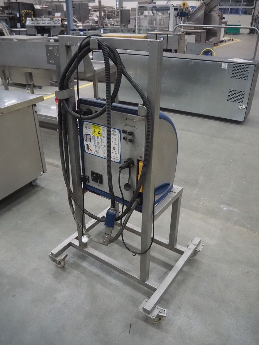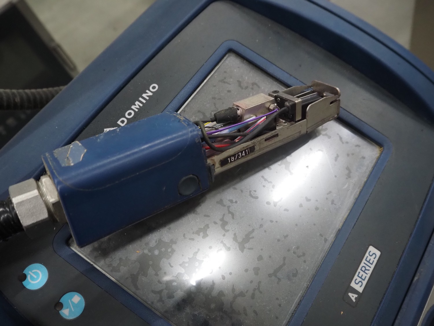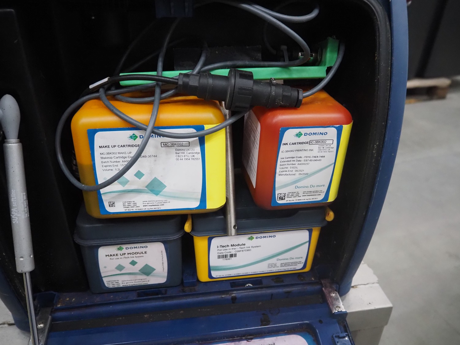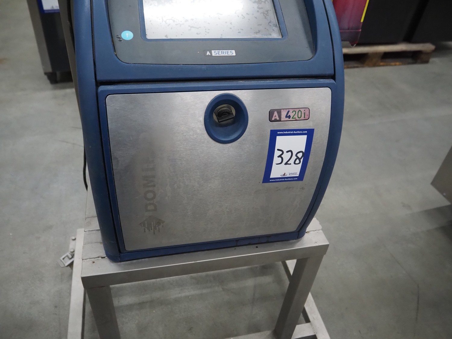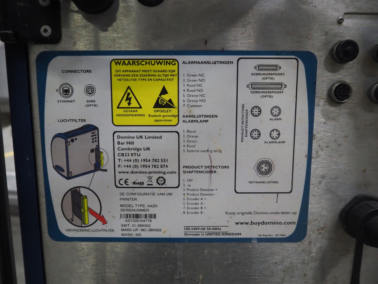 Domino mobile inkjet printer, model: A420i, serial number: AST000104778, 100-240 V, 50-60 Hz, 4 A, dimensions: 820 mm x 680 mm x 1430 mm. Incomplete.