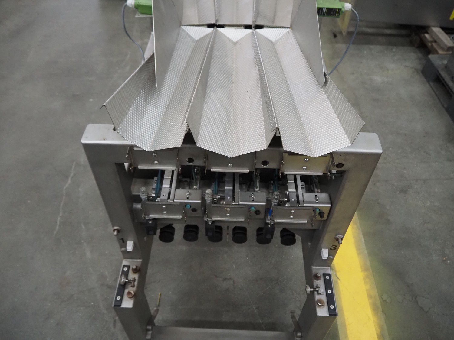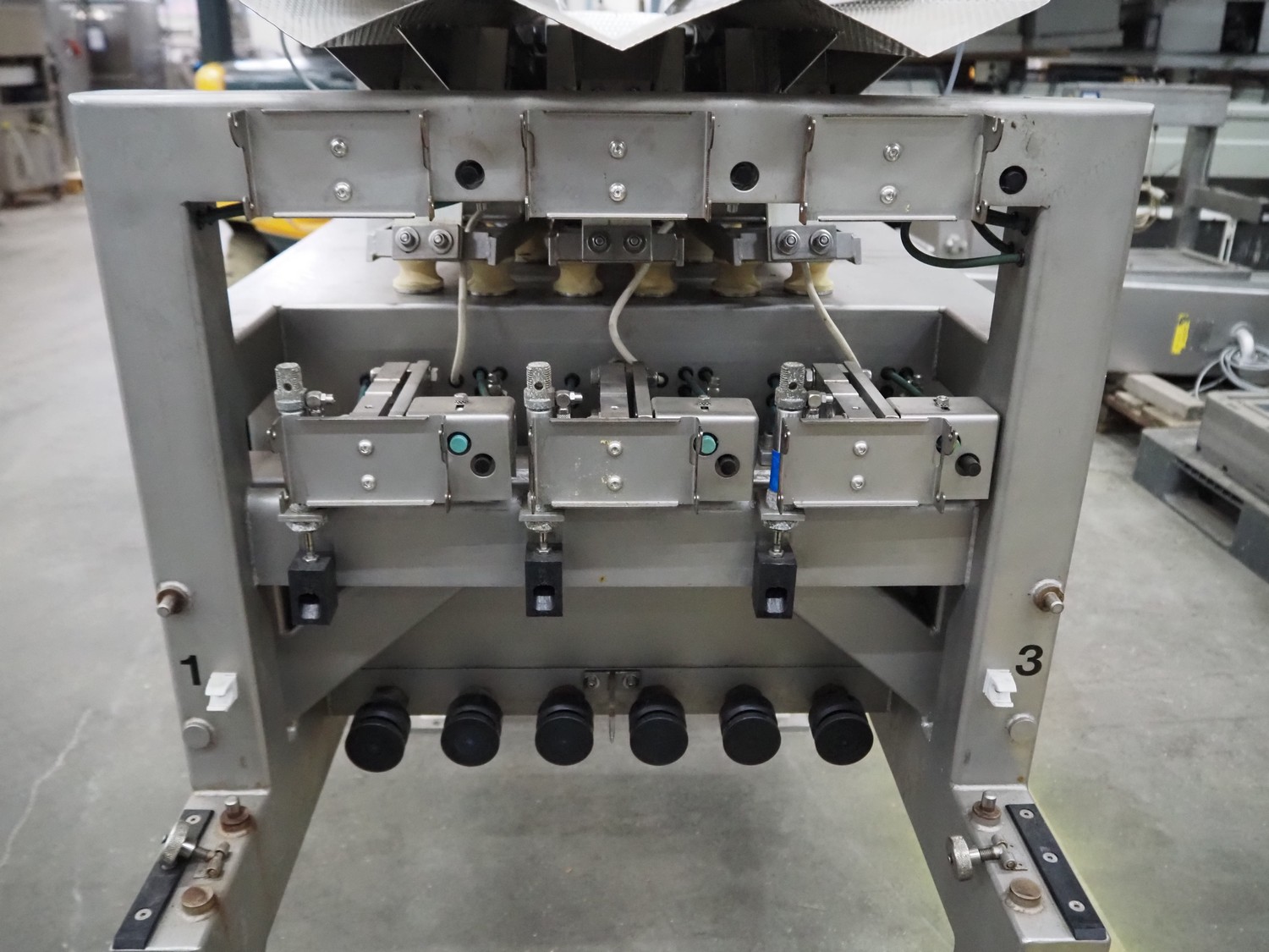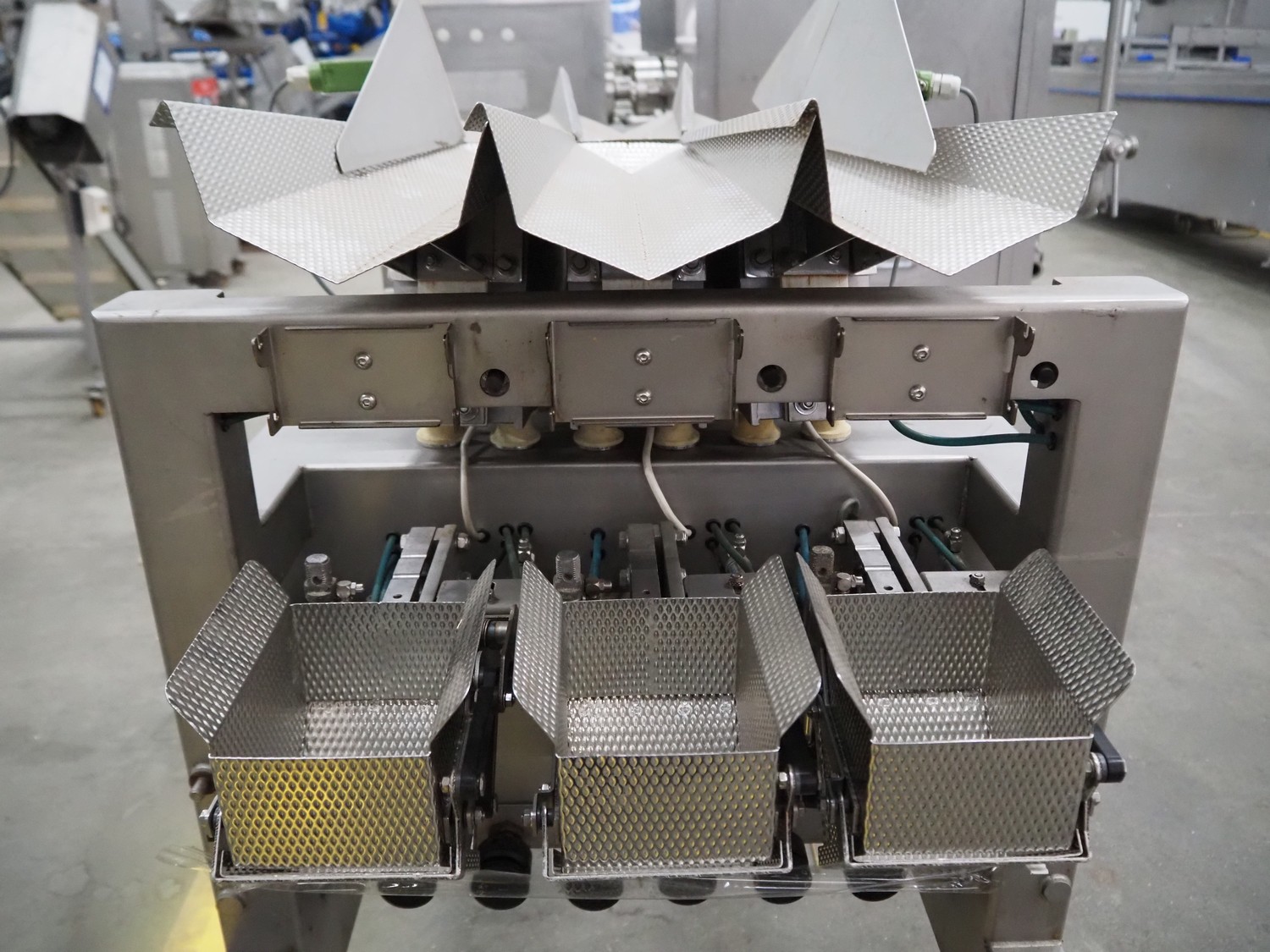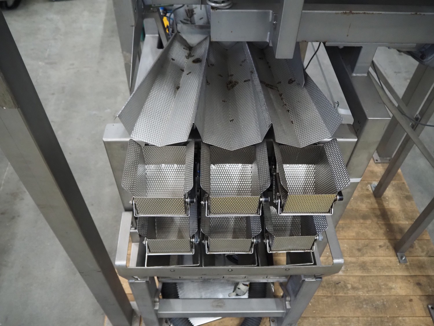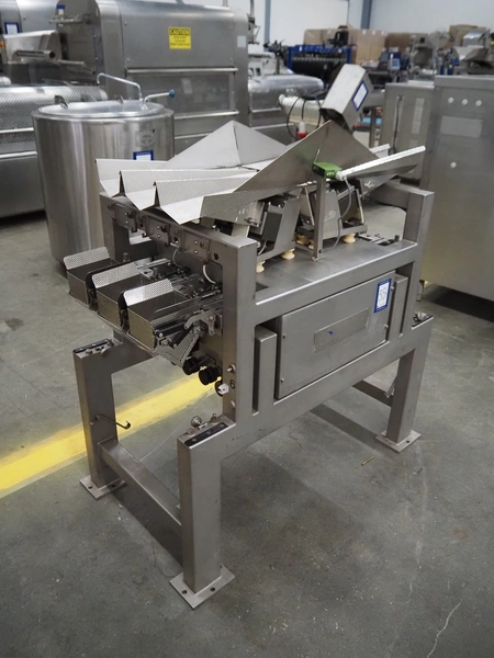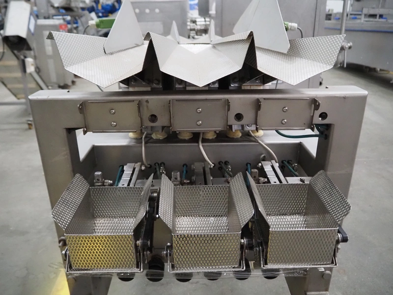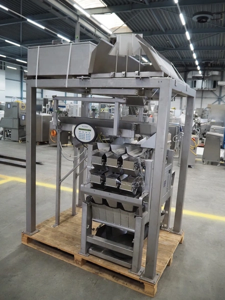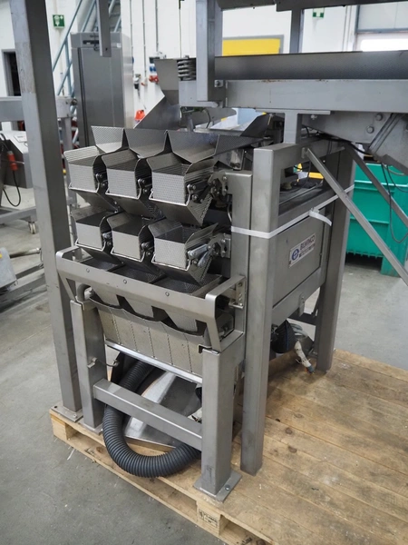 Bilwinco linear weigher consisting of: 2 6-lanes linear weighers, lane width: 120 mm, total dimensions: (2x) 1200 mm x 700 mm x 1300 mm, 2 vibrating gutters, gutter width: 350 mm, total dimensions: (2x) 1300 mm x 700 mm x 1600 mm, s/s frame with infeed hopper and switch cabinet, dimensions: 1600 mm x 1100 mm x 1750 mm. 1 weigher is incomplete.