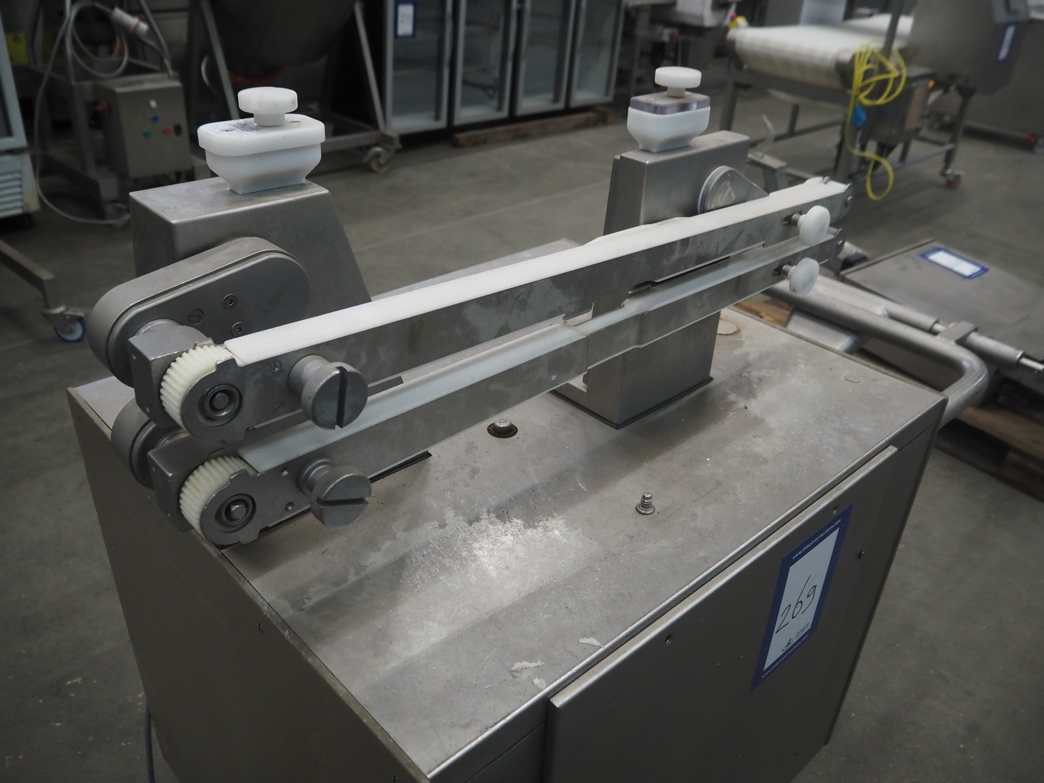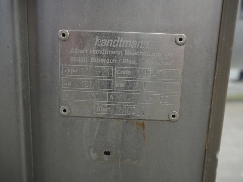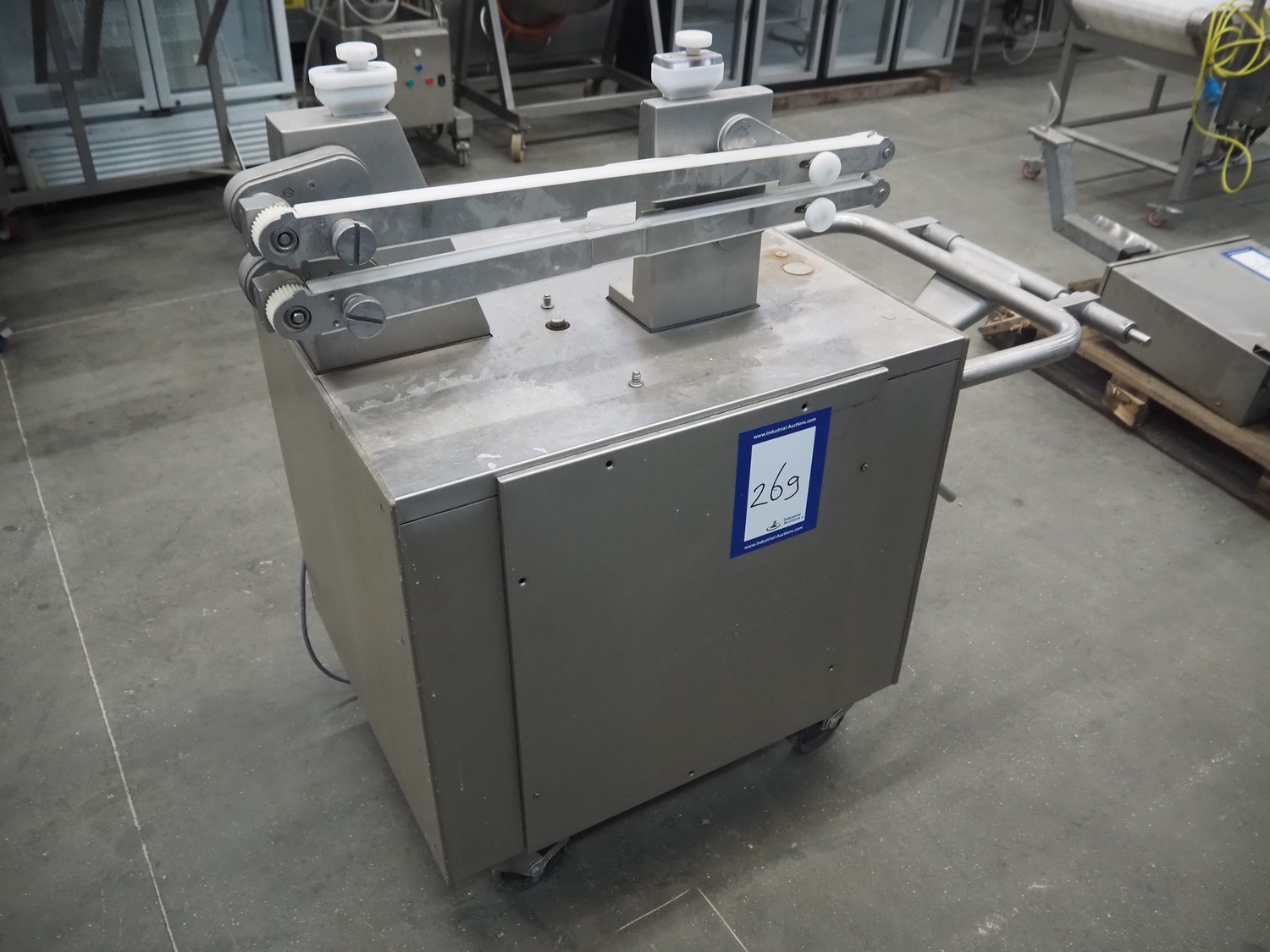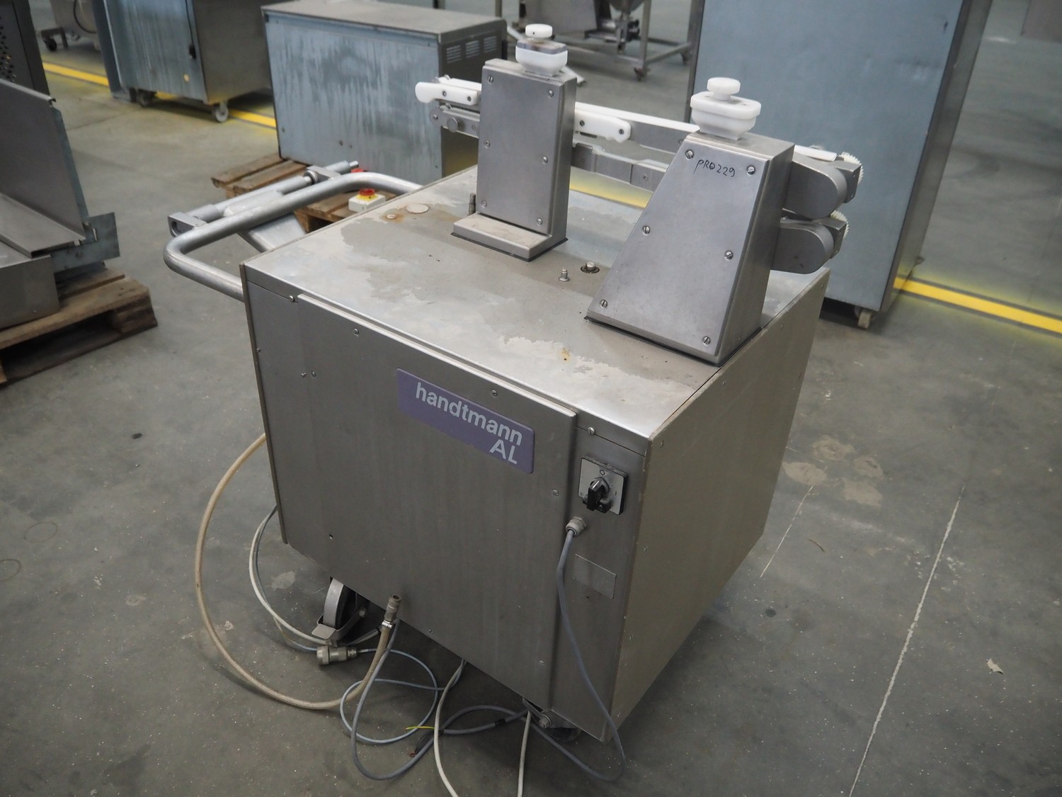 Handtmann mobile linker, type: 115-21, number: 337, year of construction: 2000, 400 V, 50 Hz, 3.5 A, 2.5 kW, dimensions: 1300 mm x 700 mm x 1250 mm. Missing belts.