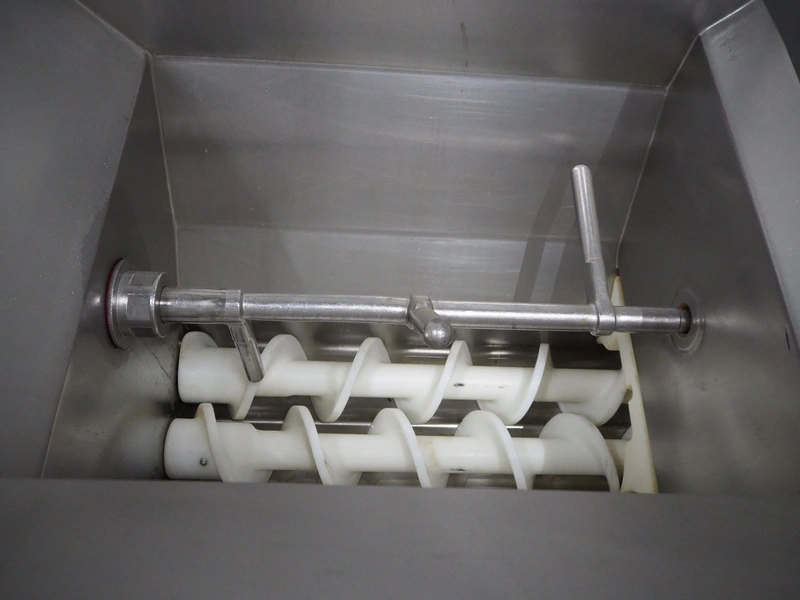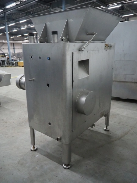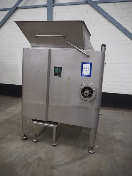 Mado mixer-grinder with Carsø lifter for 200 liter meat bins, diameter plate: 160 mm, dimensions mixer-ginder: 1320 mm x 1100 mm x 1850 mm, lifter type: HKV200, serial number: 94606, year of construction: 2001, 400 V, 3 Ph, 0.75 kW, lifting height: 2000 mm, dimensions lifter: 3300 mm x 1400 mm x 700 mm.