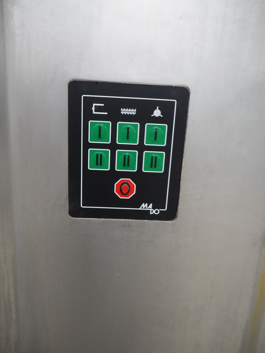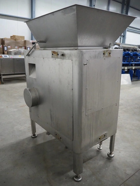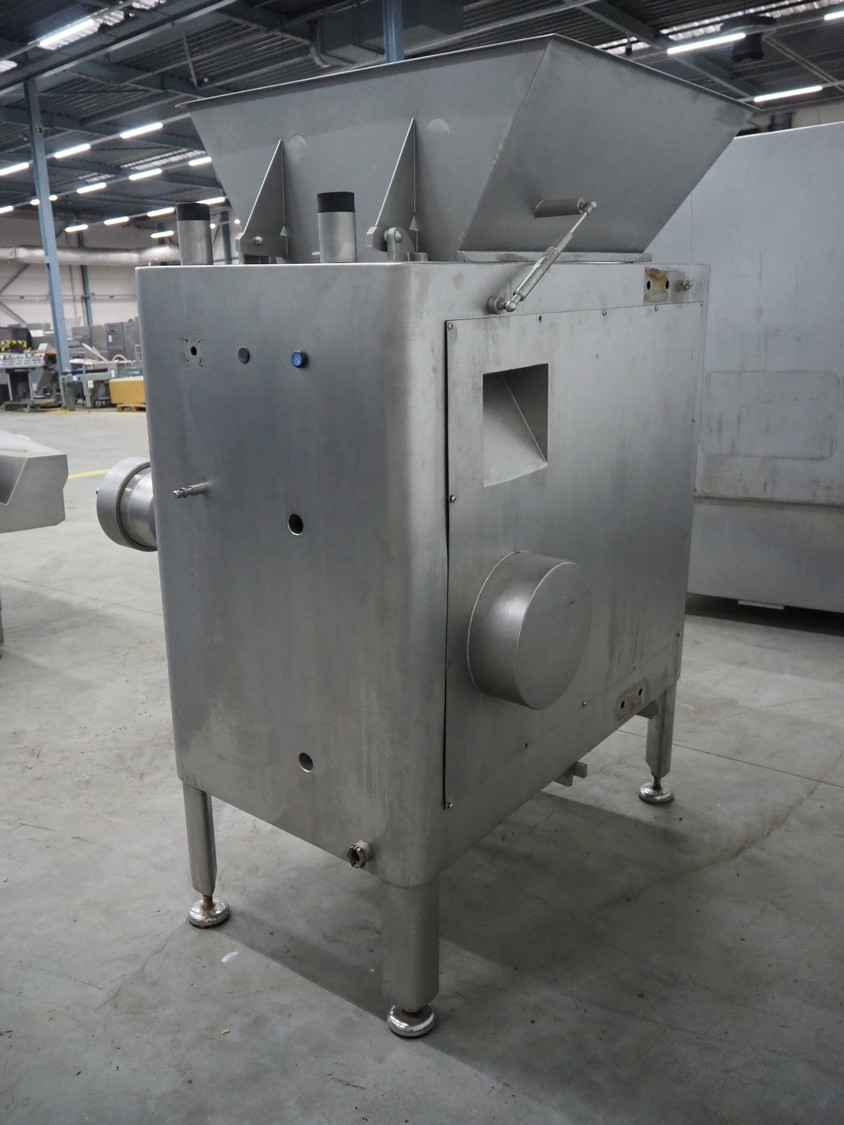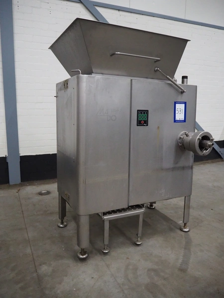 MaDo mixer-grinder with Carsø lifter for 200 liter meat bins, diameter plate: 160 mm, dimensions mixer-ginder: 1320 mm x 1100 mm x 1850 mm, lifter type: HKV200, serial number: 94606, year of construction: 2001, 400 V, 3 Ph, 0.75 kW, lifting height: 2000 mm, dimensions lifter: 3300 mm x 1400 mm x 700 mm.