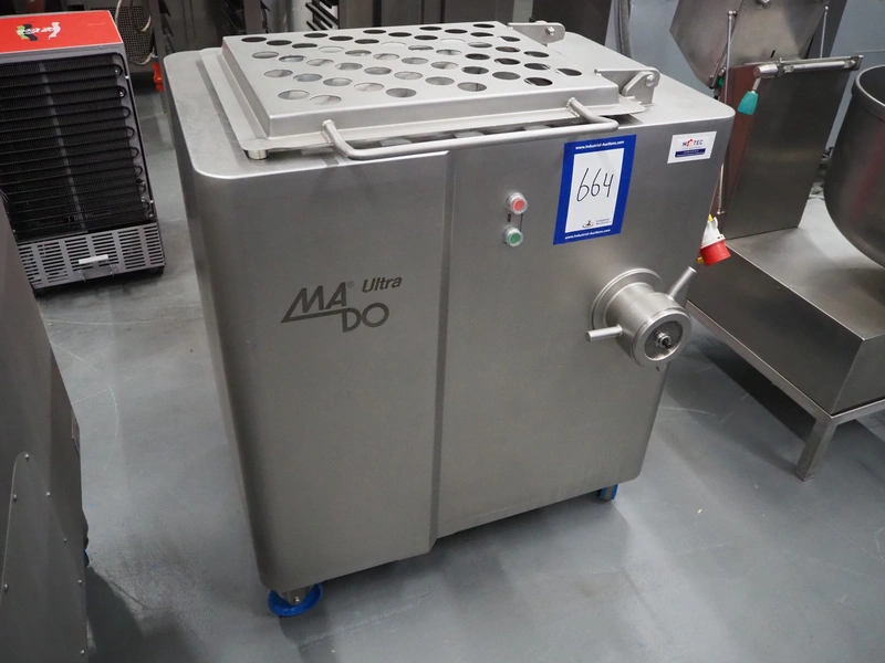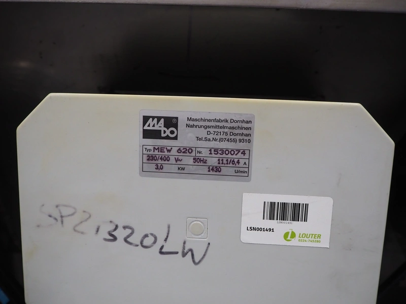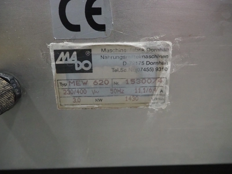 Mado mobile grinder, type: MEW 620, number: 1530074, 230/400 V, 50 Hz, 11.1/6.4 A, 3 kW, plate diameter: 98 mm, total dimensions: 1060 mm x 870 mm x 1160 mm.