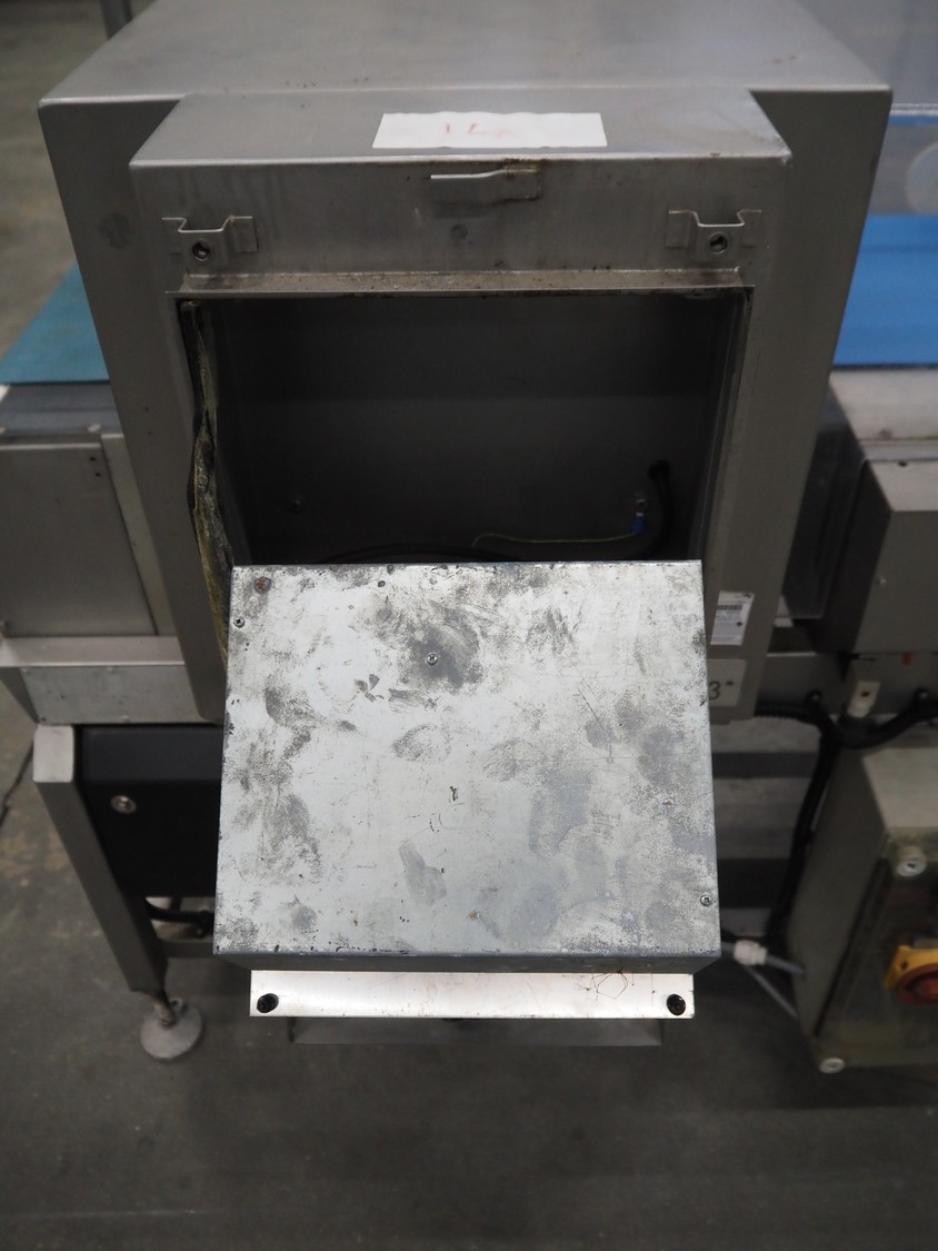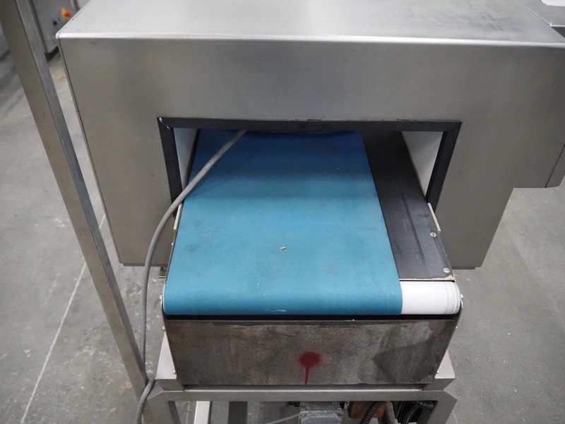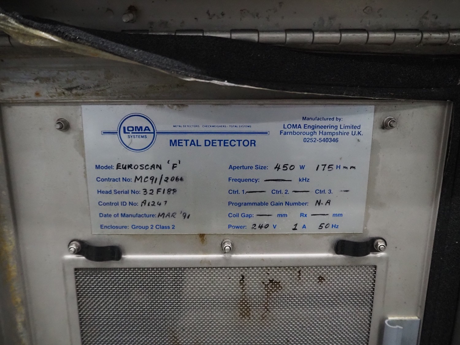Loma Systems metal detector, model: Euroscan F, serial number: 32F188, year of construction: march 1991, 415/240 V, 3 Ph, 50 Hz, clearance: 450 mm x 140 mm, plastic belt, belt width: 350 mm, total dimensions: 1500 mm x 900 mm x 1370 mm.