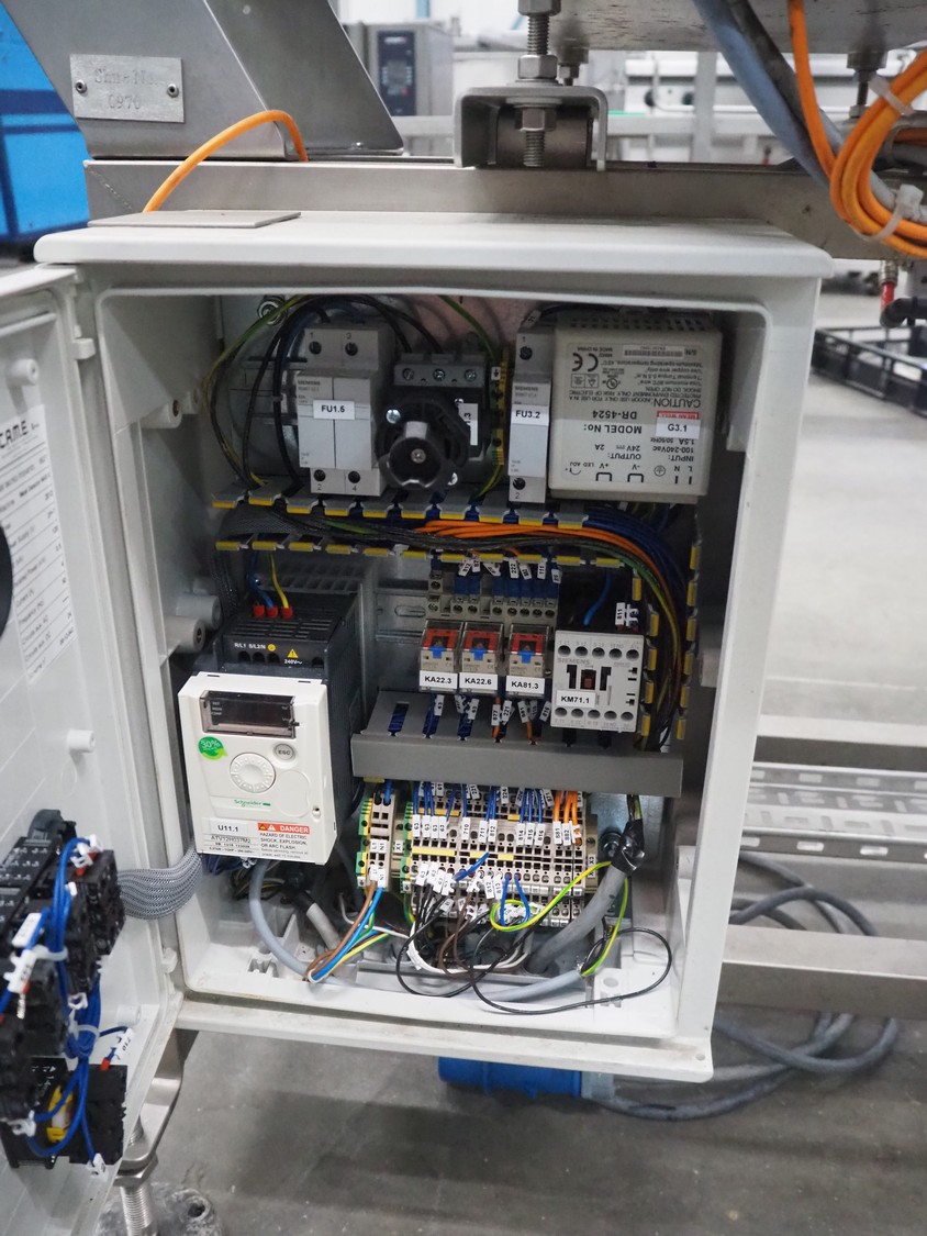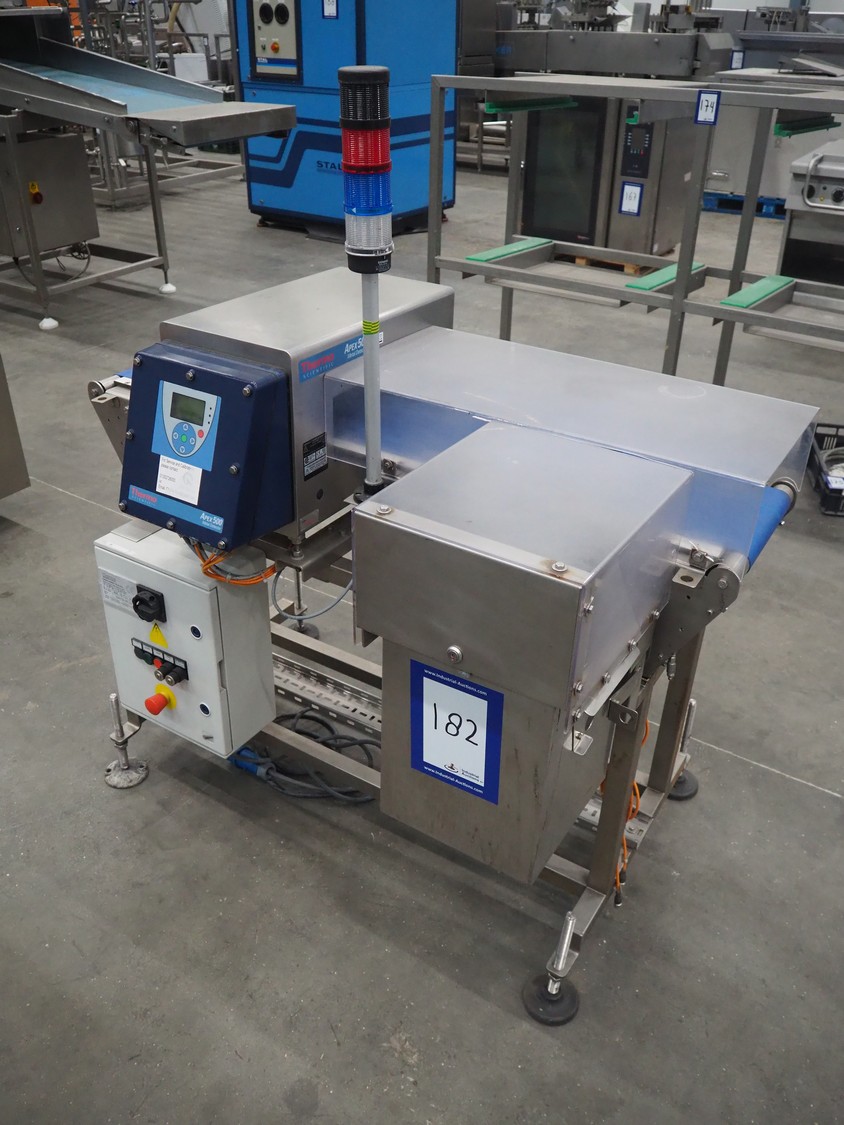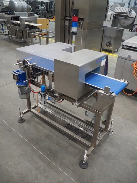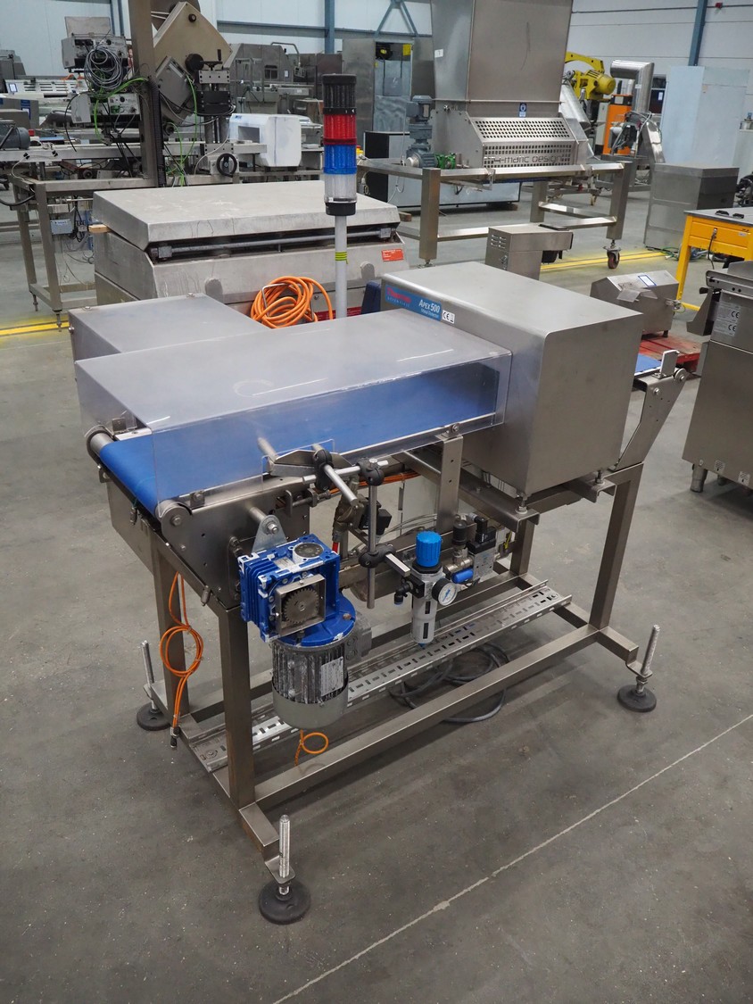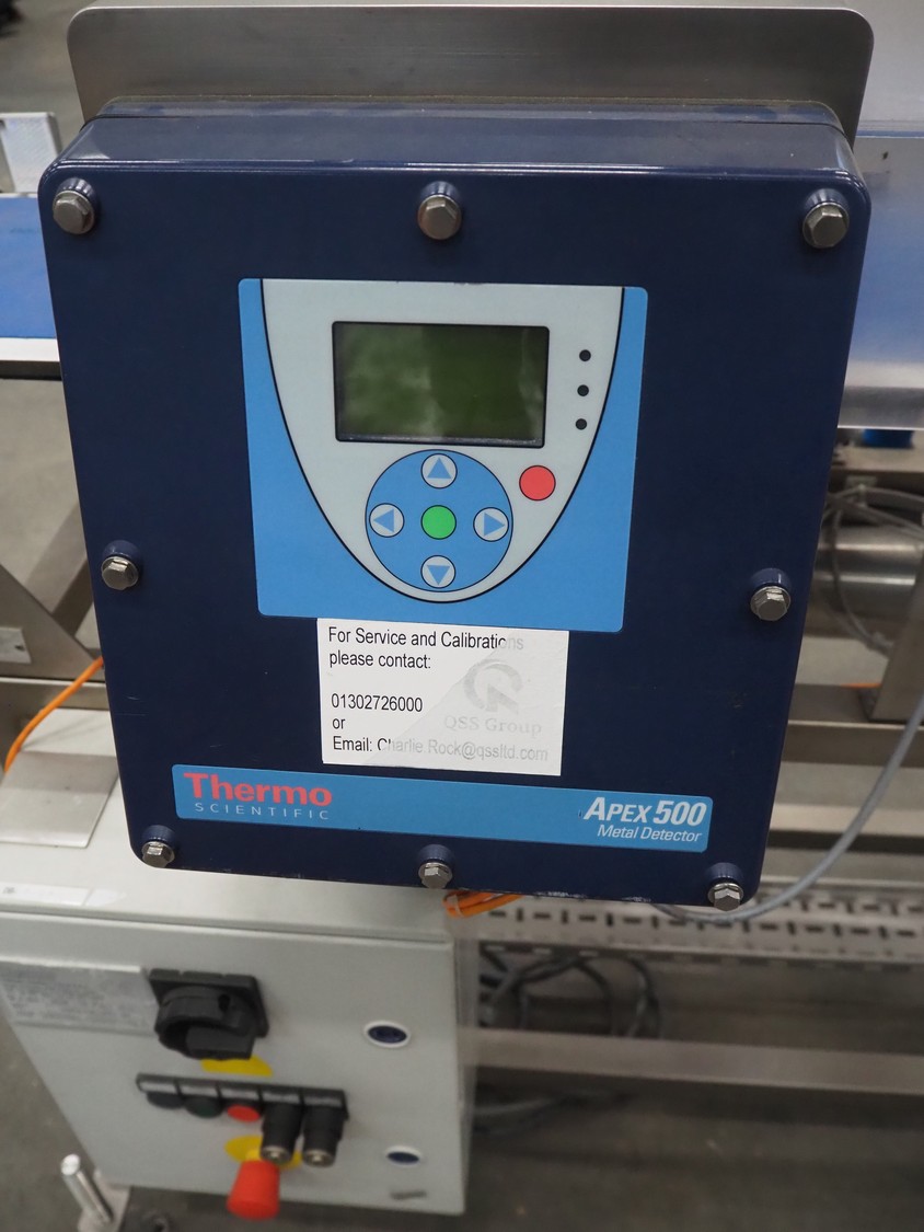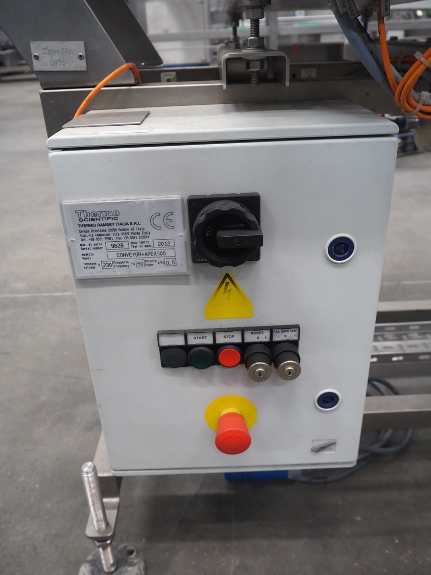 Thermo Fisher metal detector with rejecter, model: Apex500, serial number: 9628, year of construction: 2012, 120/230 V, 50/60 Hz, 0.4 A, plastic belt, belt width: 250 mm, clearance: 350 mm x 150 mm, total dimensions: 1400 mm x 960 mm x 1460 mm.