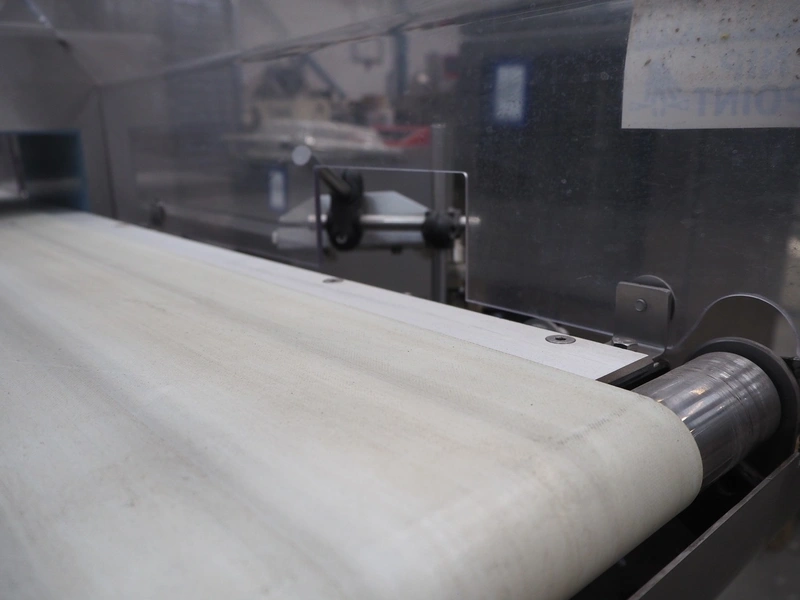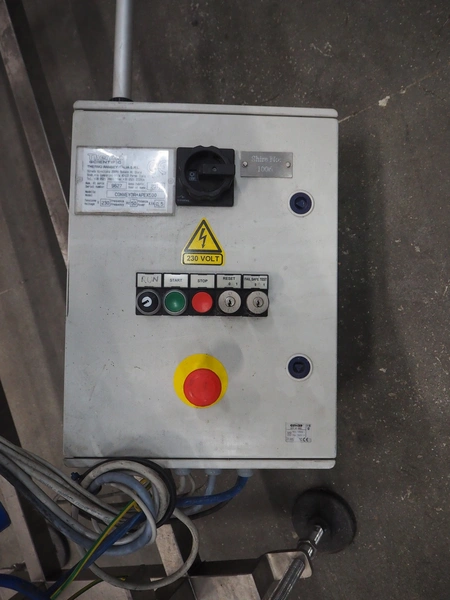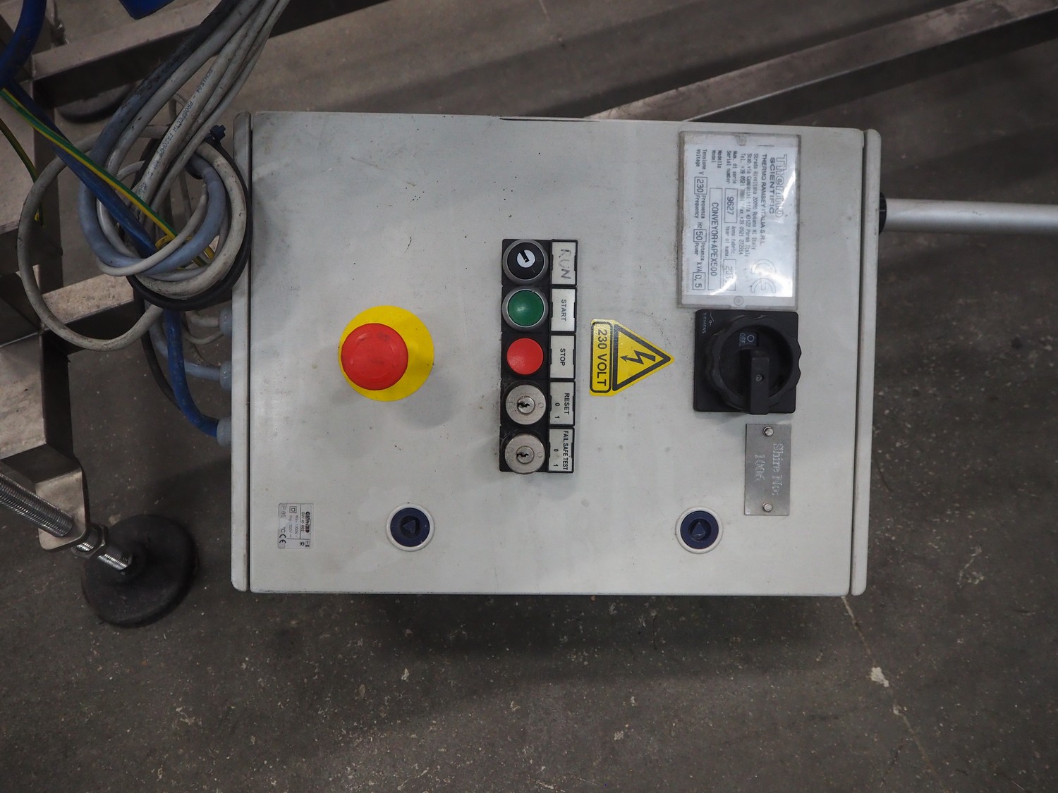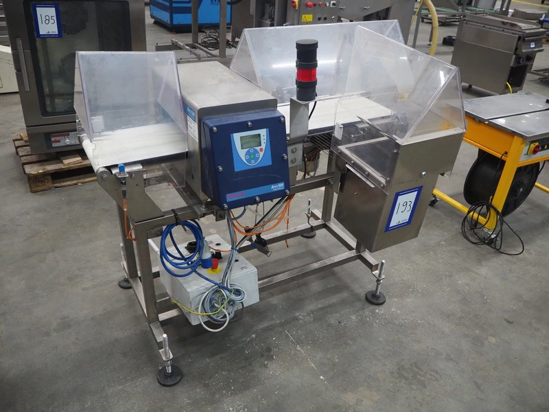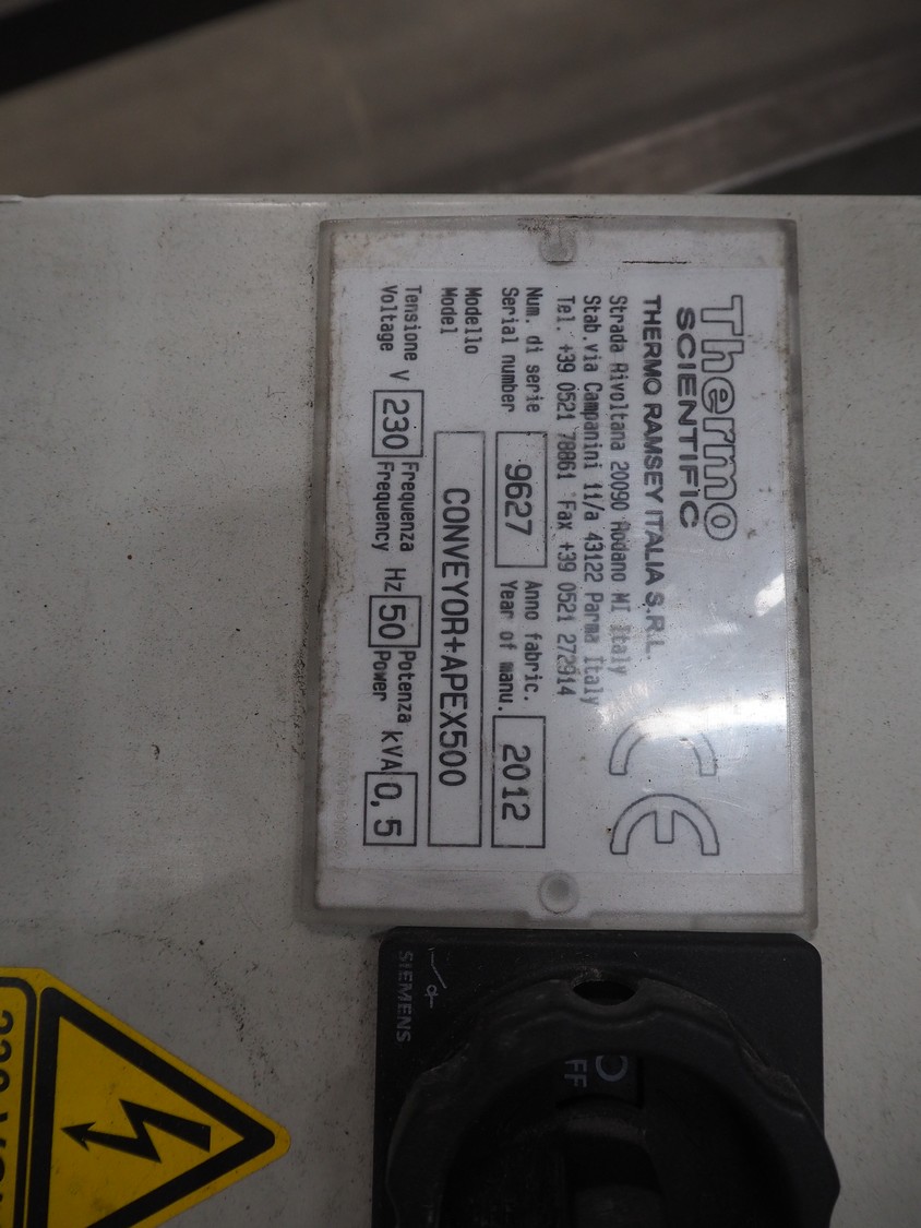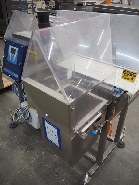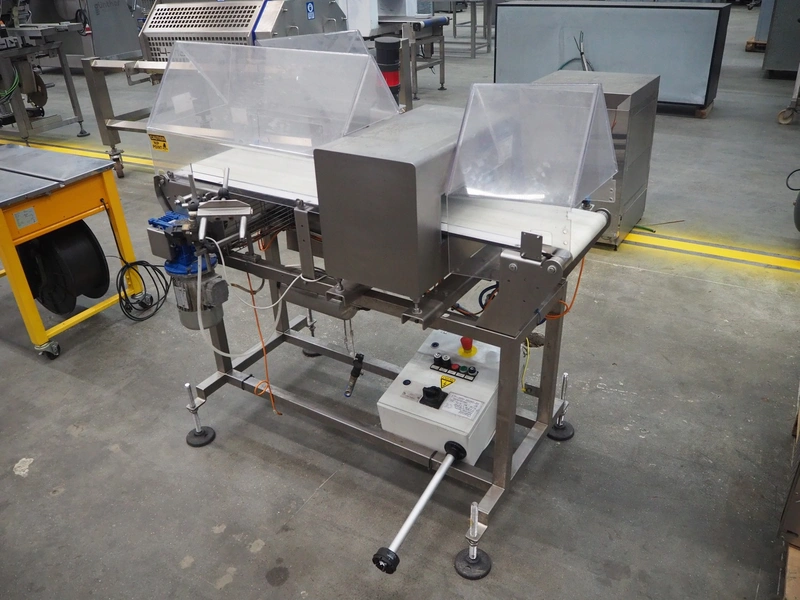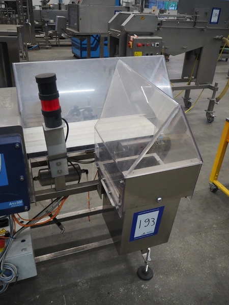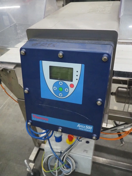 Thermo Fischer metal detector with rejector, model: Apex500, serial number: 9627, year of construction: 2012, 230 V, 50 Hz, plastic belt, belt width: 250 mm, clearance: 300 mm x 100 mm, total dimensions: 1400 mm x 1100 mm x 1350 mm.