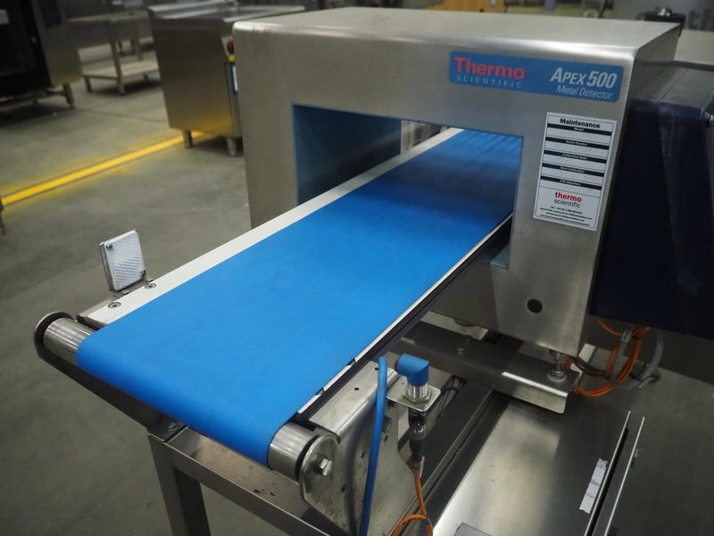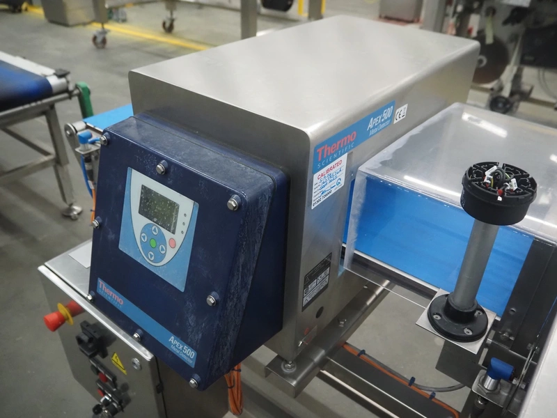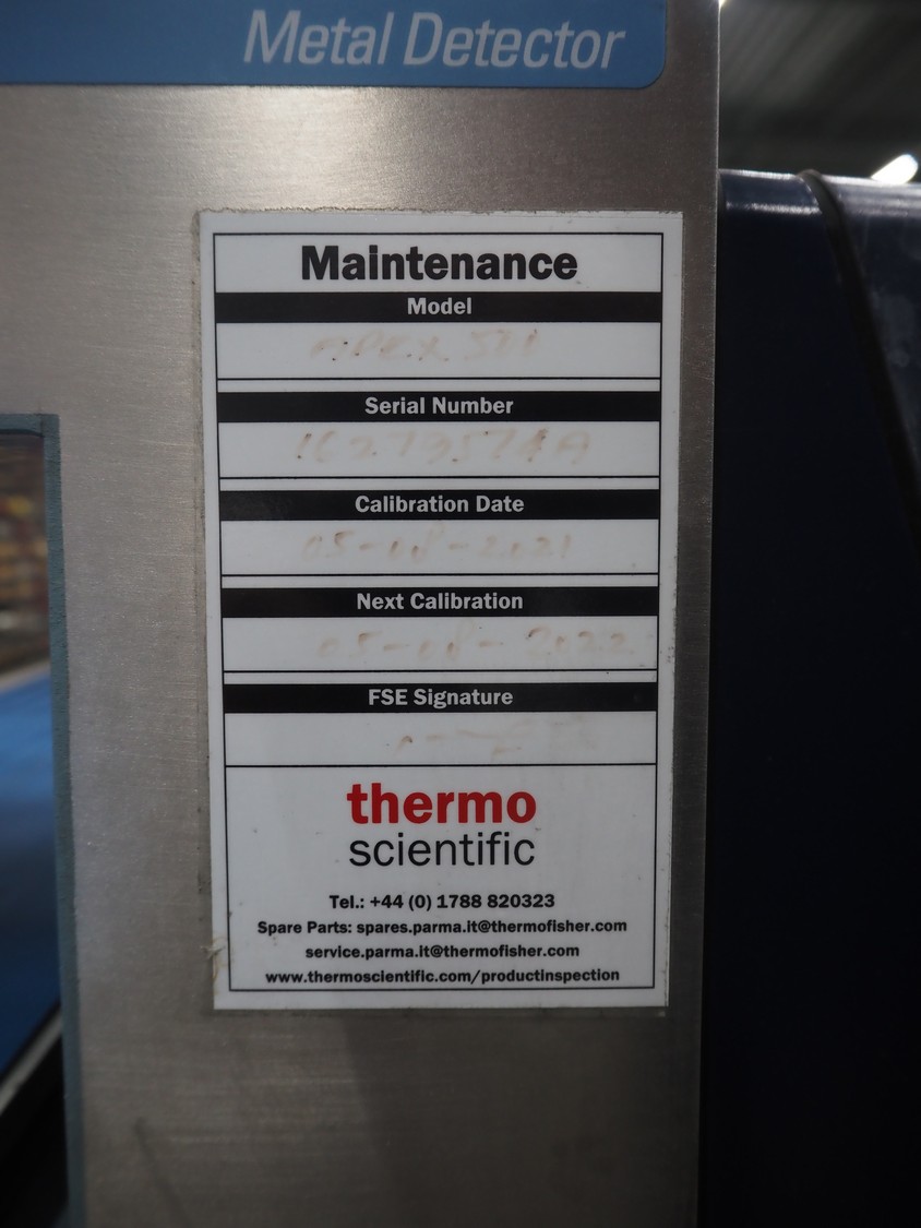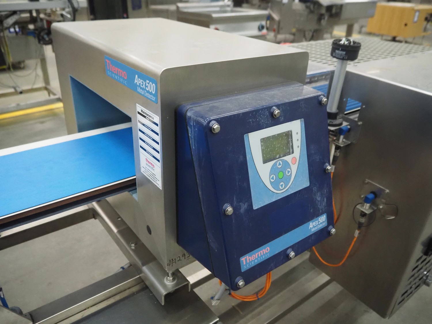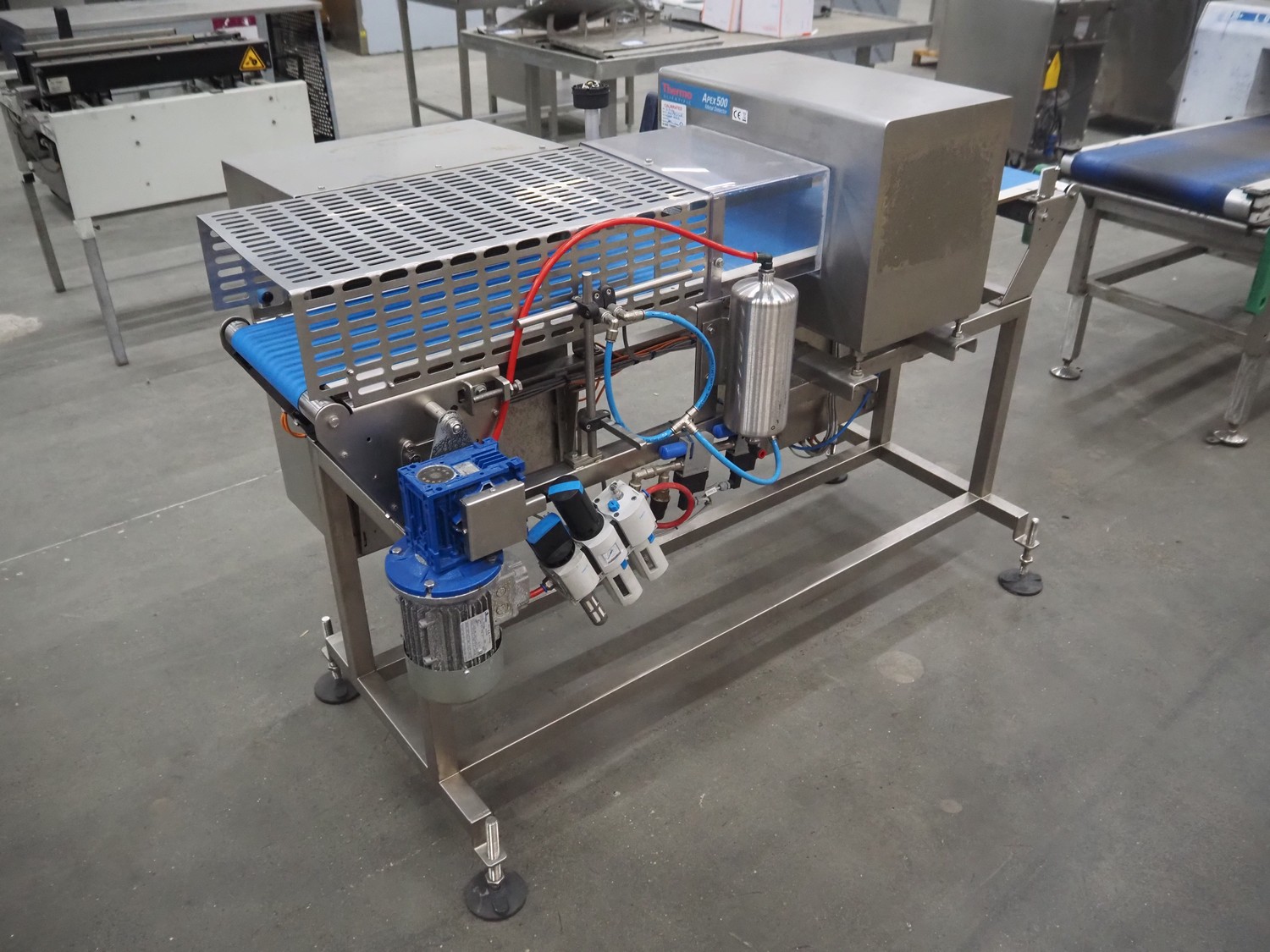 Thermo Fischer metal detector with rejecter, model: Apex500, 120/230 V, 50/60 Hz, 0.4 A, plastic belt, belt width: 250 mm, clearance: 350 mm x 150 mm, total dimensions: 1750 mm x 800 mm x 1360 mm.
