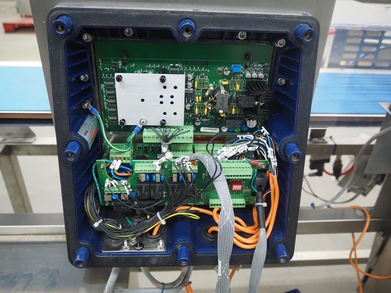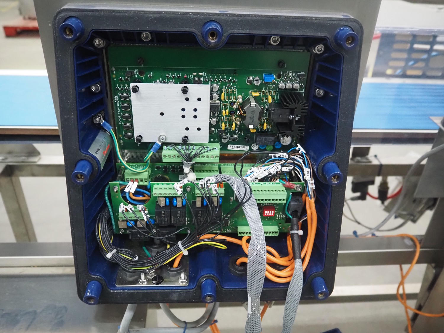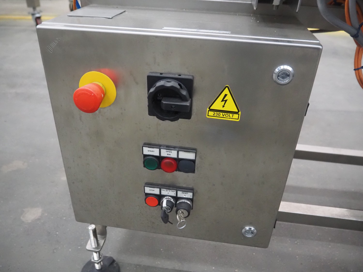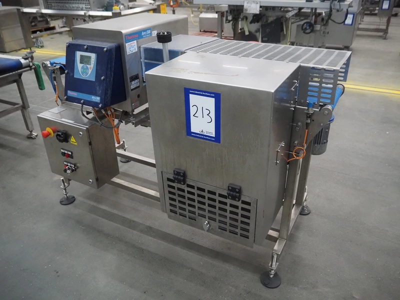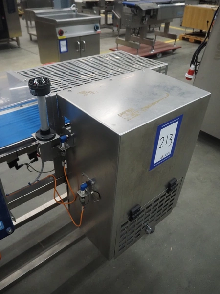 Thermo Fischer metal detector with rejecter, model: Apex500, 120/230 V, 50/60 Hz, 0.4 A, plastic belt, belt width: 250 mm, clearance: 350 mm x 150 mm, total dimensions: 1750 mm x 800 mm x 1360 mm.