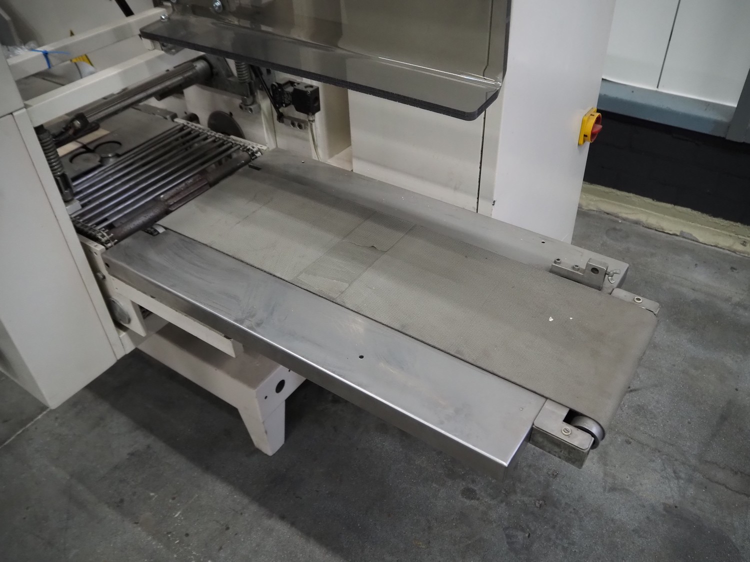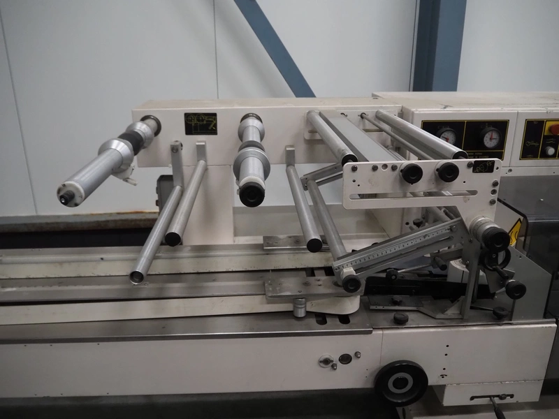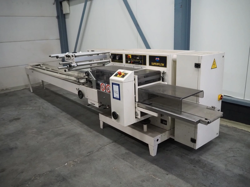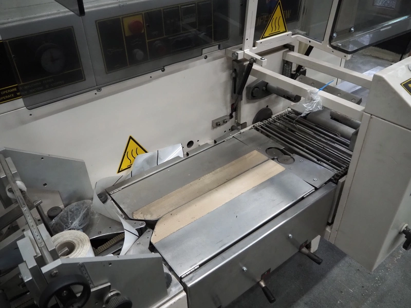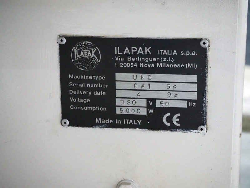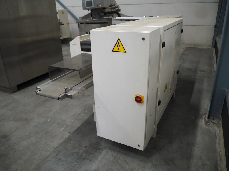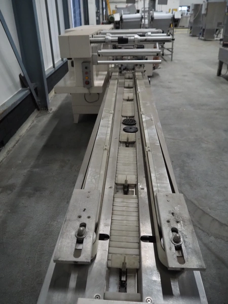 Ilapak Italia S.p.a. flowpacker, type: UNO, serial number: 061 96, year of construction: 4/1996, 380 V, 50 Hz, 5000 W, plastic infeed belt with dividers, belt width: 100 mm, divider height: 55 mm, distance between dividers: 430 mm, seal width: 250 mm, plastic outfeed belt, belt width: 240 mm, total dimensions: 5900 mm x 1300 mm x 1310 mm.